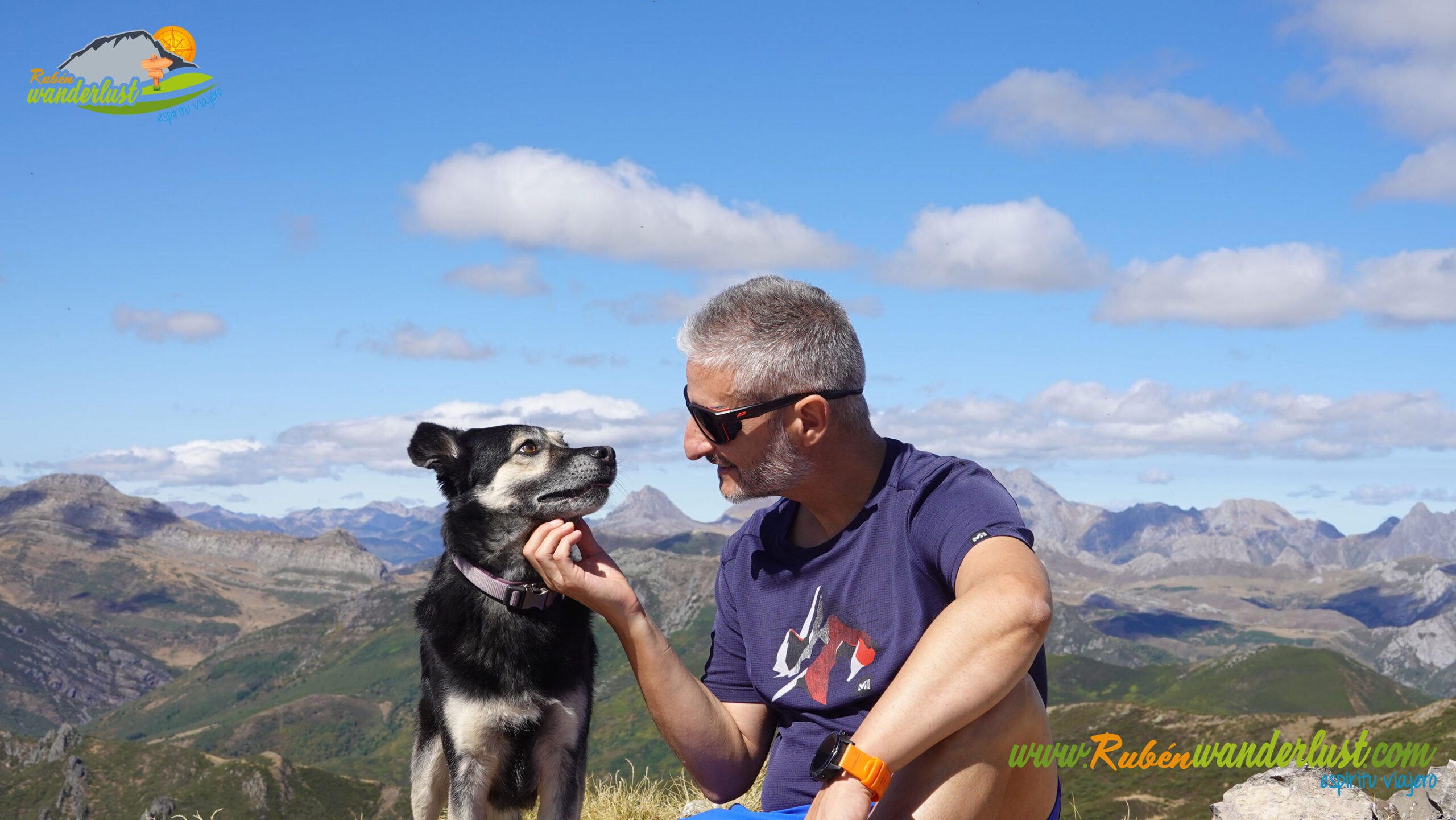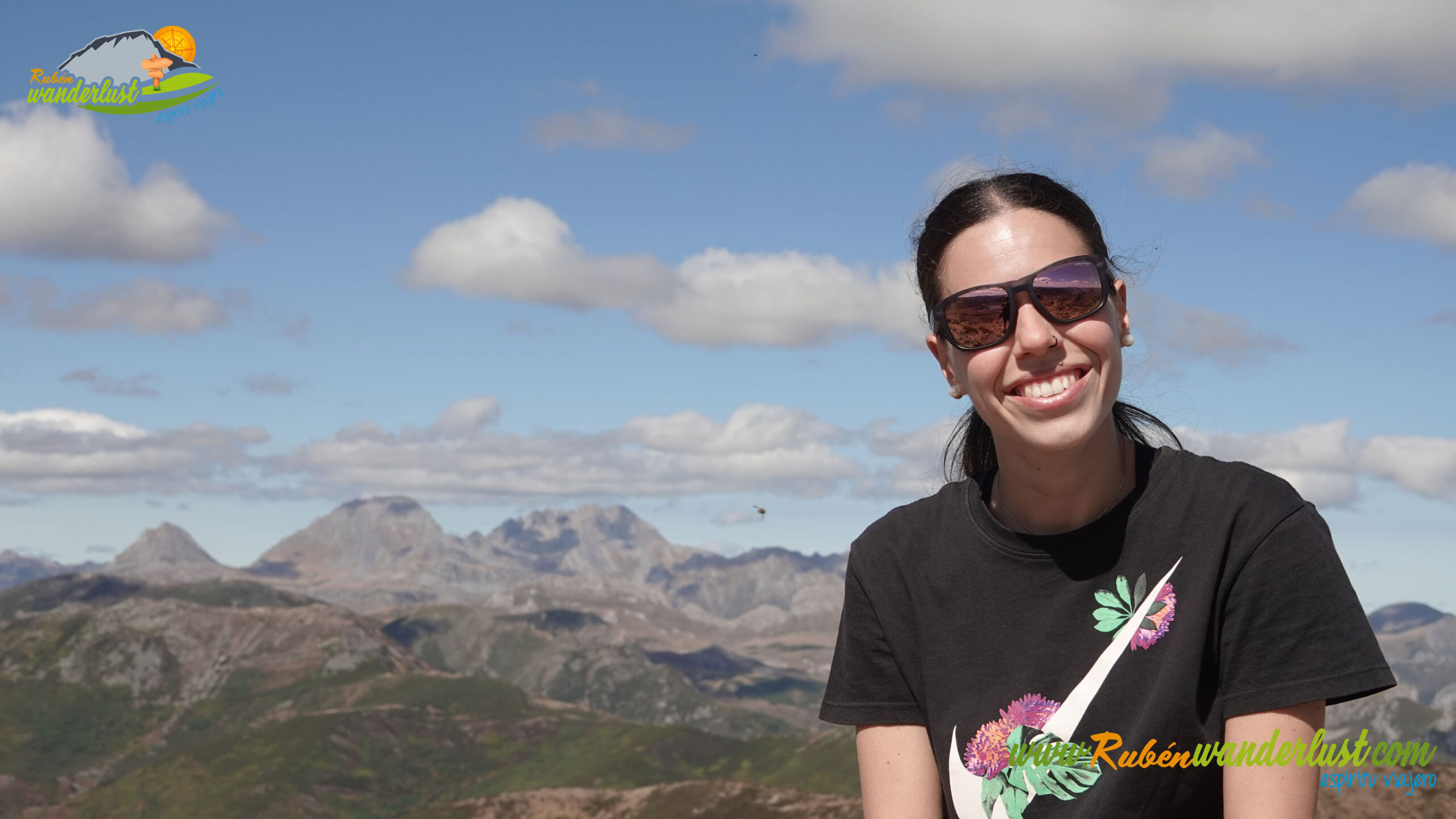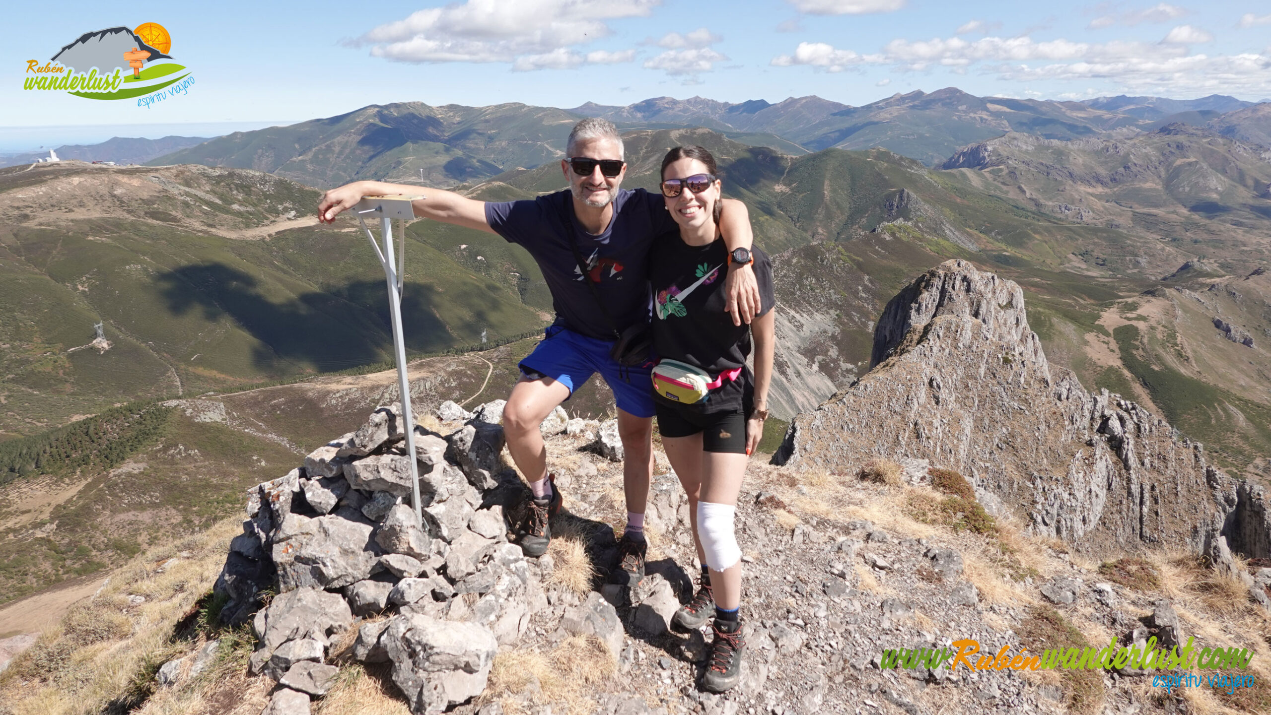 Finalizada la arista oeste, llegamos a la cima de Peña María de los Corros (Las Tres Marías) (1.957 m). Aquí nos encontramos con Alejandro Magariño, otro conocido montañero, y su compañera de ruta, con quienes disfrutamos de la cumbre, compartiendo grandes momentos, charlas y risas. Sin duda, un hito conseguido y una ascensión que disfrutamos a cada segundo! Aprovechamos para descansar, beber algo y contemplar unas vistas espectaculares, destacando el Cueto Negro, el Pico Brañacaballo, el Pico Fontún, el Pico Meloita, Peña Ubiña… El número de montañas a nuestro alrededor es incalculable! Fotos y vídeos para guardar una montaña única!