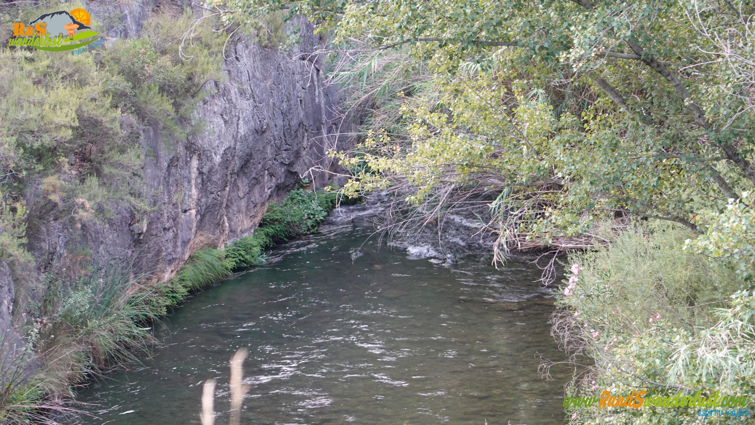 Continuamos el trazado por el cómodo sendero y vamos escuchando una de las cascadas que nos brinda el Río Turia. Apenas vemos el final de la caída, pero el sonido deja claro que estamos ante un buen salto de agua. Justo después, un cartel informativo y un desvío hacia la izquierda nos guiarán hacia Los Calderones.