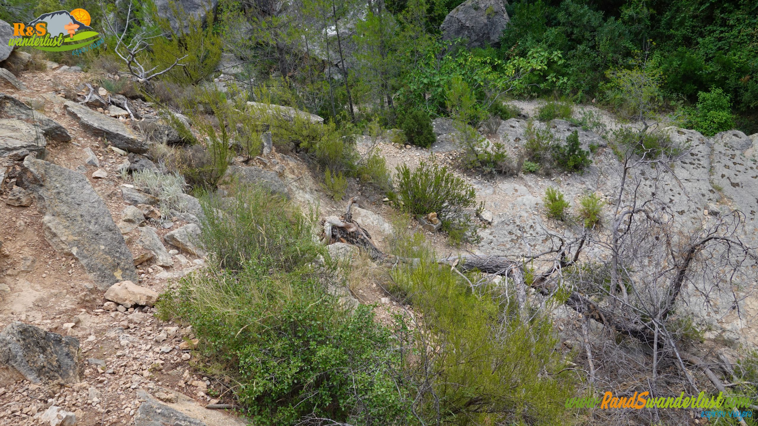 El desvío nos deja en un estrecho y pindio sendero que nos llevará directamente hasta el sendero a media ladera que se dirige hacia Chulilla. El inicio no es muy evidente y debemos fijarnos bien para no coger el camino equivocado.
