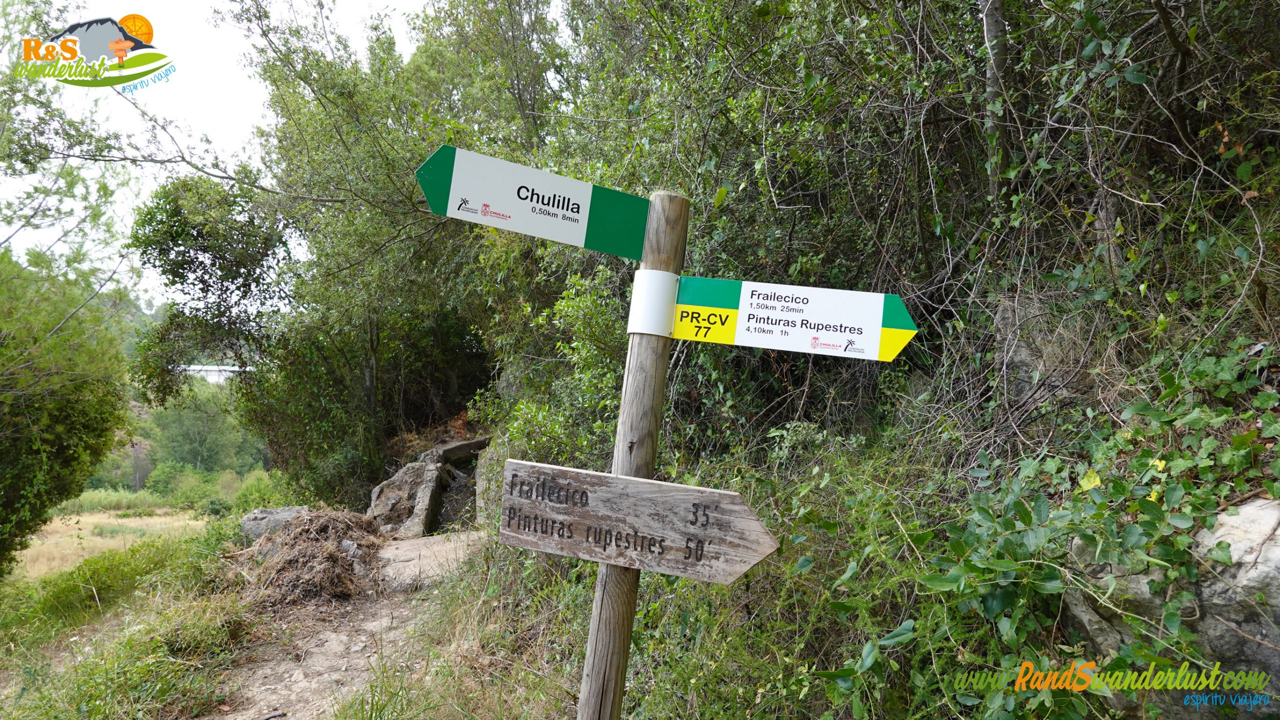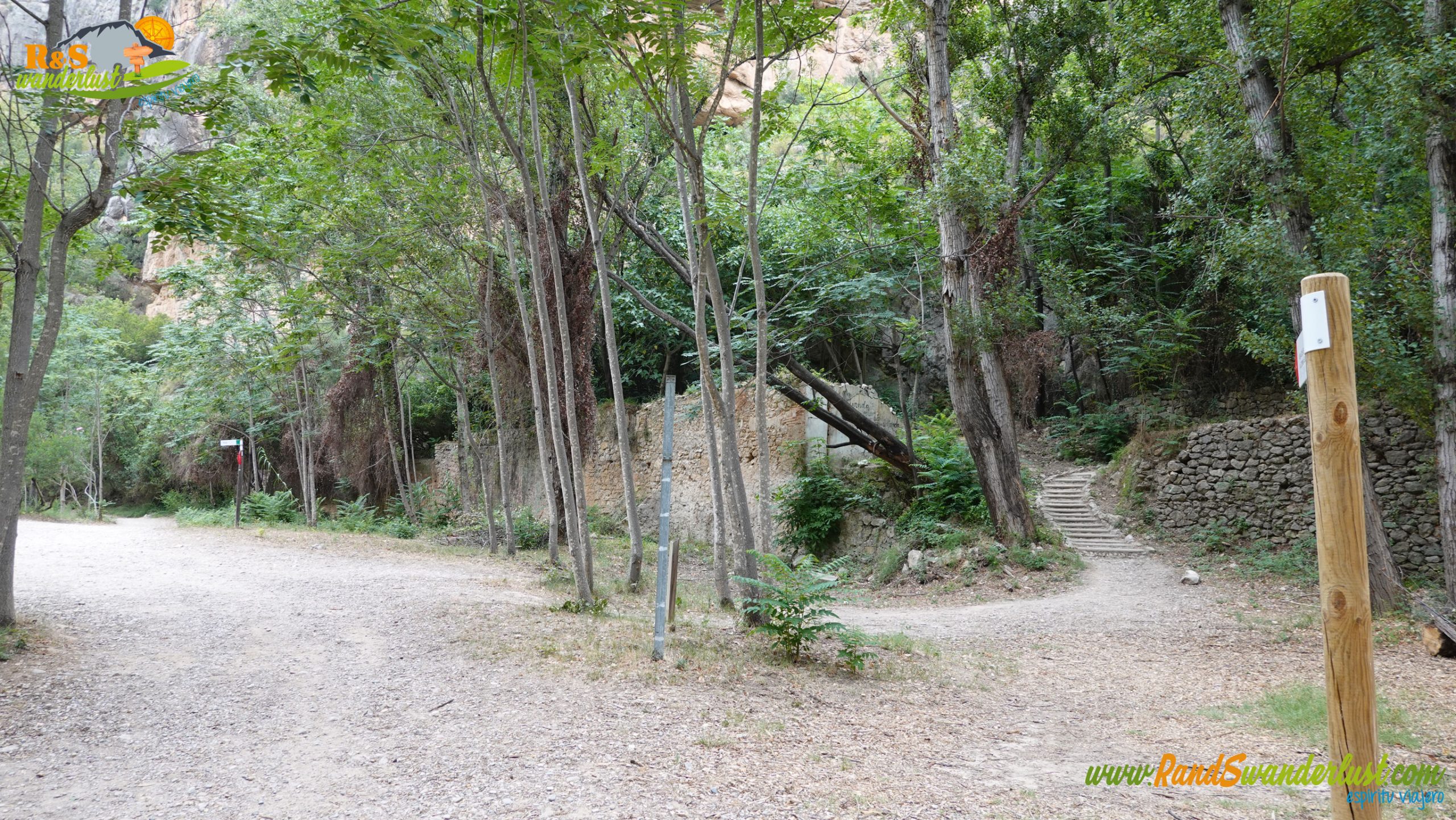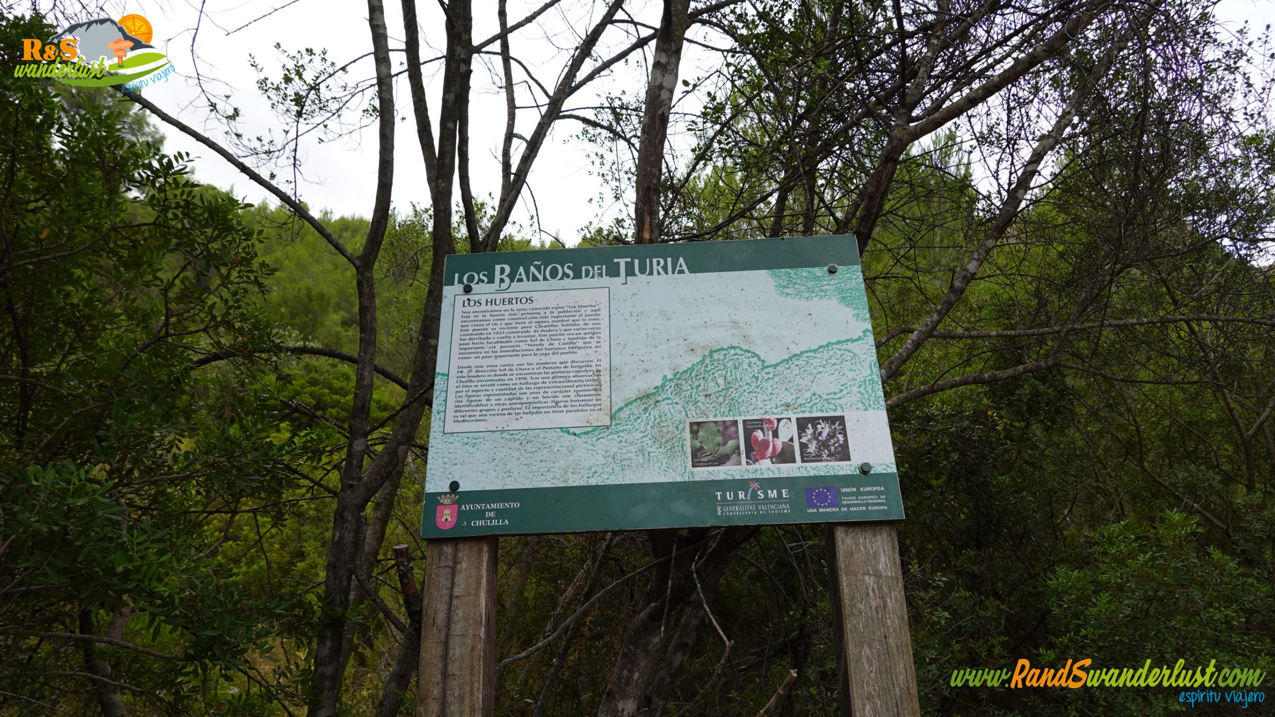 Cada vez más cerca de Chulilla, llegamos a la senda que nos guiará hacia el pueblo. Giramos hacia la izquierda y llegamos a los Huertos del Turia, lugar donde encontramos un cartel informativo.