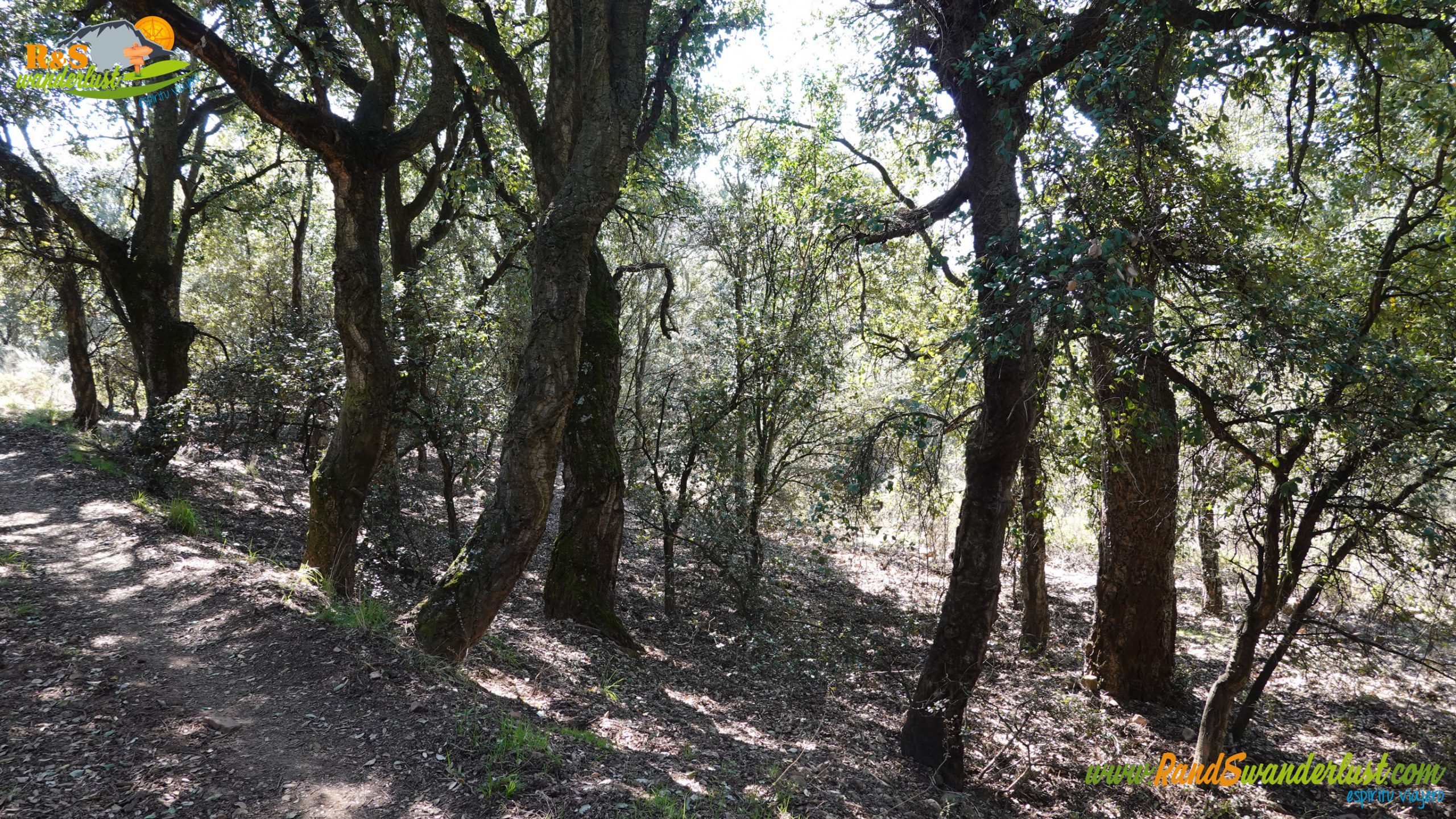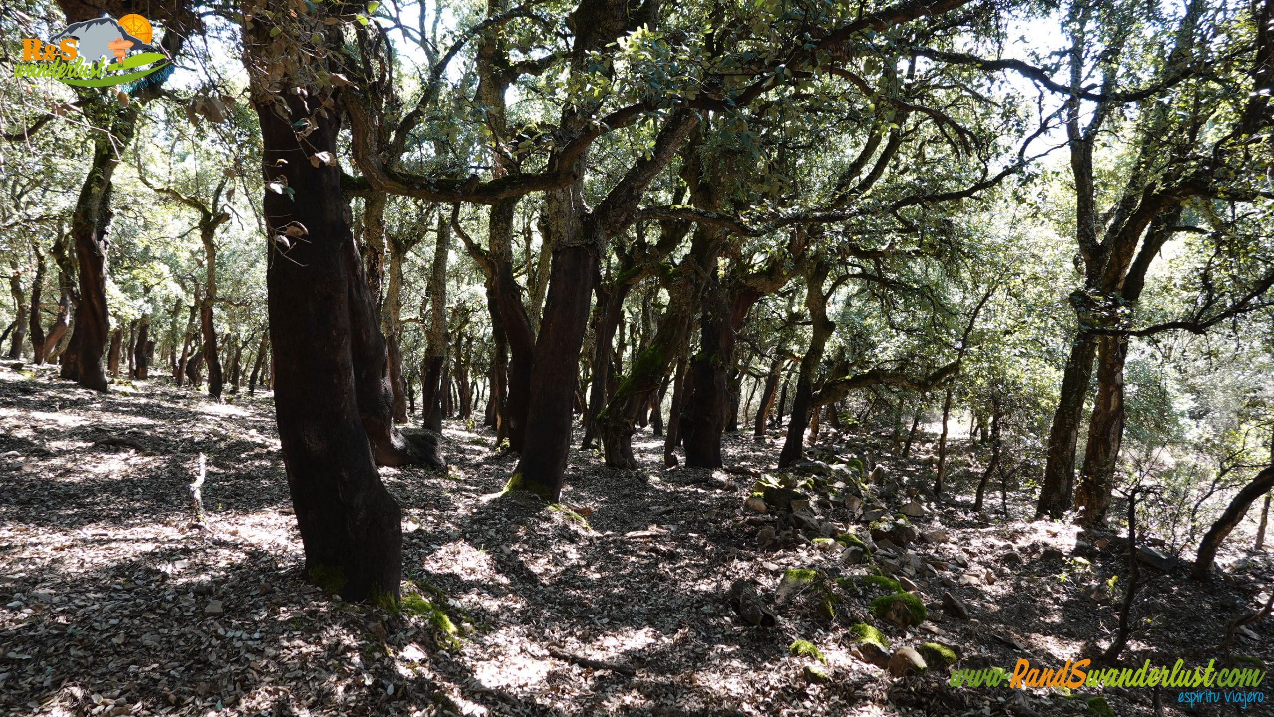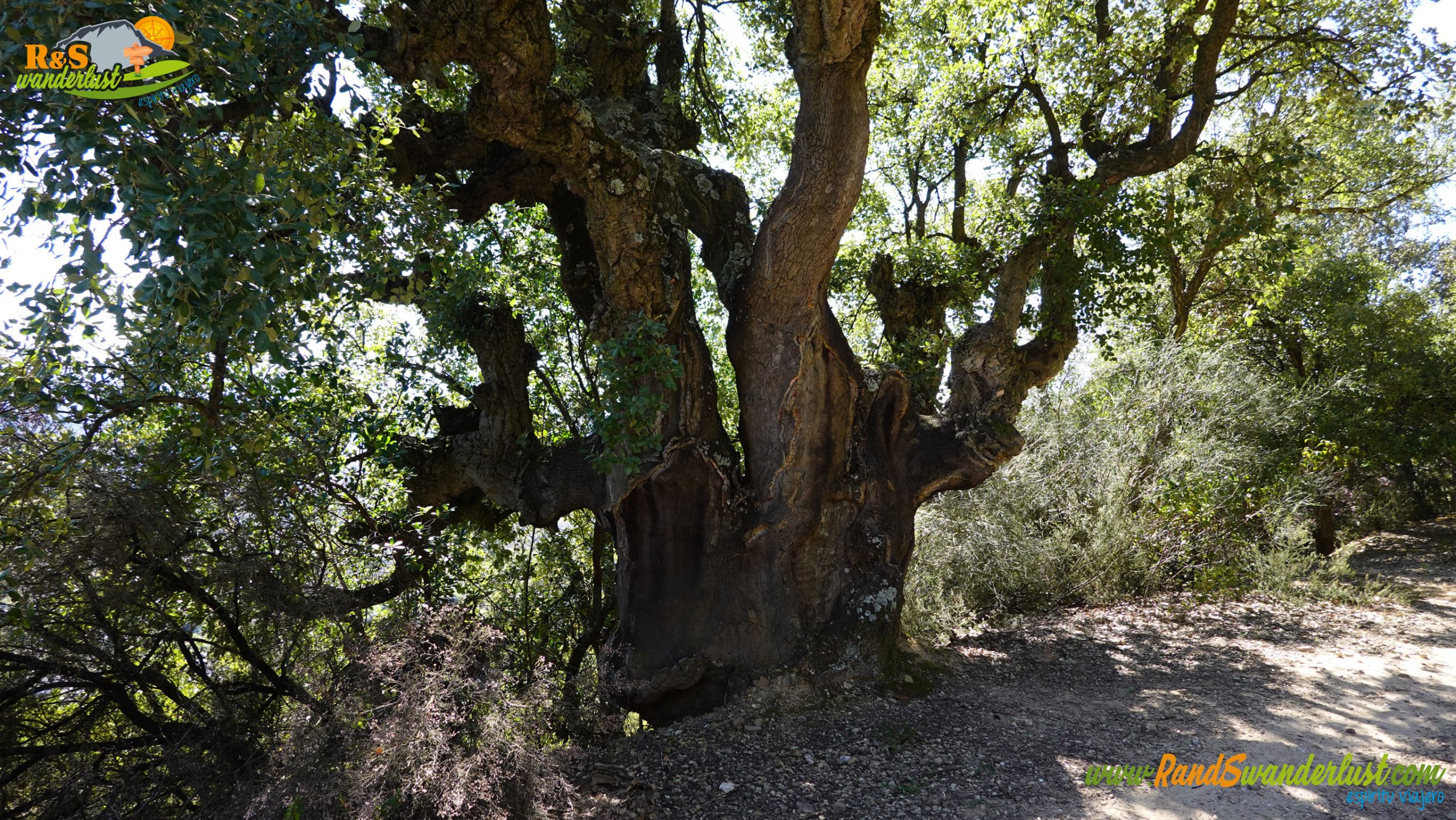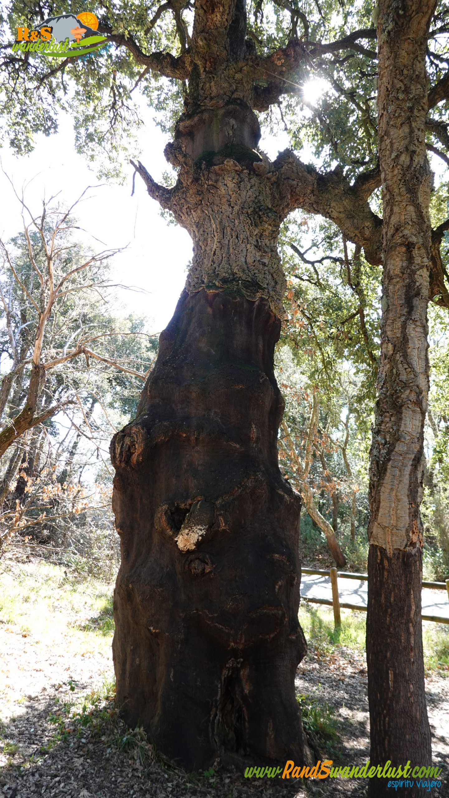Dejamos atrás una de las partes más bonitas de la ruta y comenzamos el descenso hacia Cobrana. La bajada será muy cómoda, de momento por una ancha pista forestal y sin pérdida, pues los desvíos, que son varios, están perfectamente señalizados. Por el camino, podemos disfrutar de algún ejemplar de alcornoque precioso!