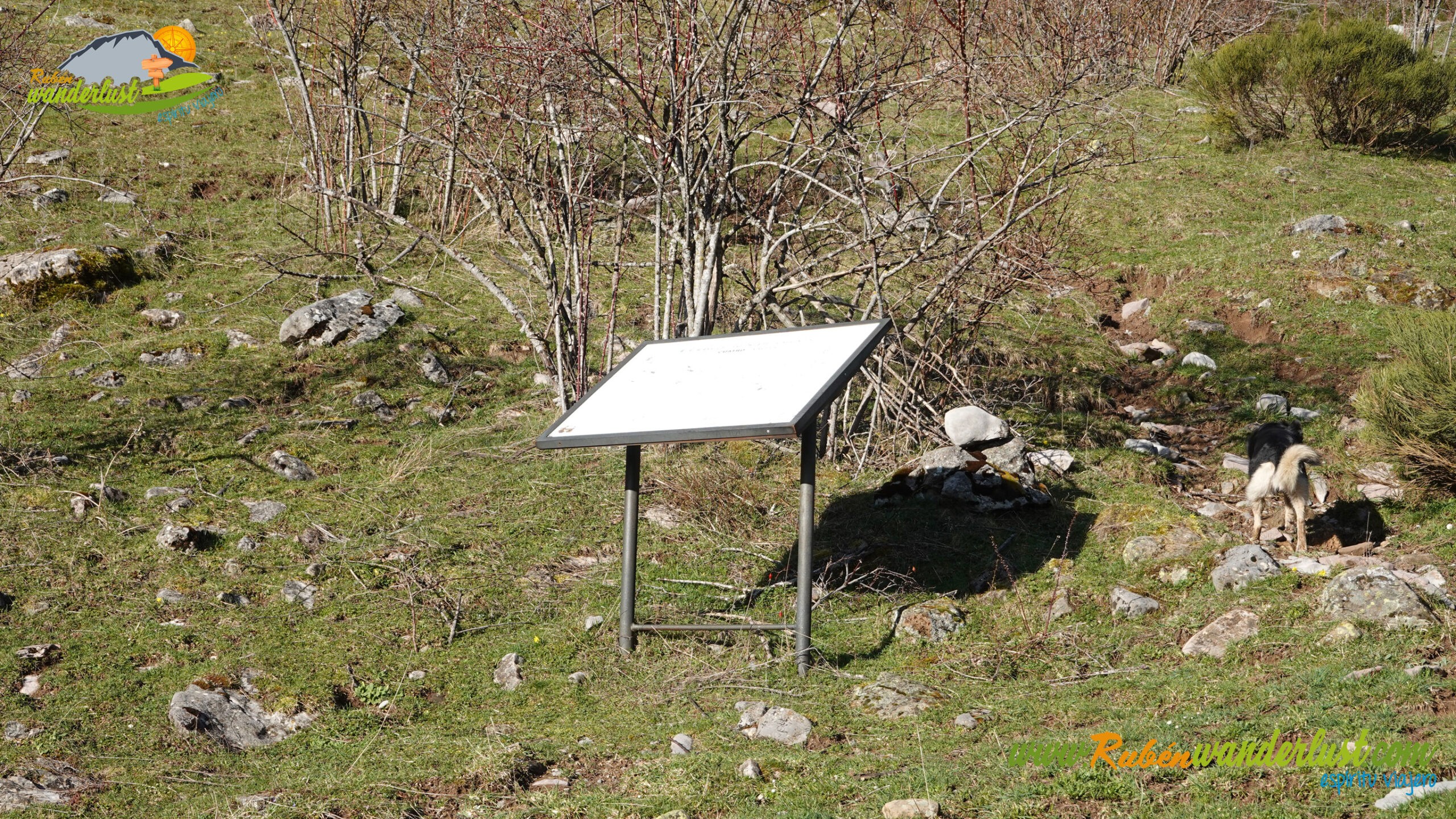 Ya en la senda, giramos a la izquierda y comenzamos el ascenso hacia Sancenas. Varias curvas y algo más de 150 metros de desnivel para cruzar un pequeño arroyo y llegar al entorno de un refugio, donde encontramos también una edificación, seguramente ganadera. Aquí también encontramos un cartel informativo, aunque de dudosa lectura. De momento, la ruta está siendo muy cómoda!