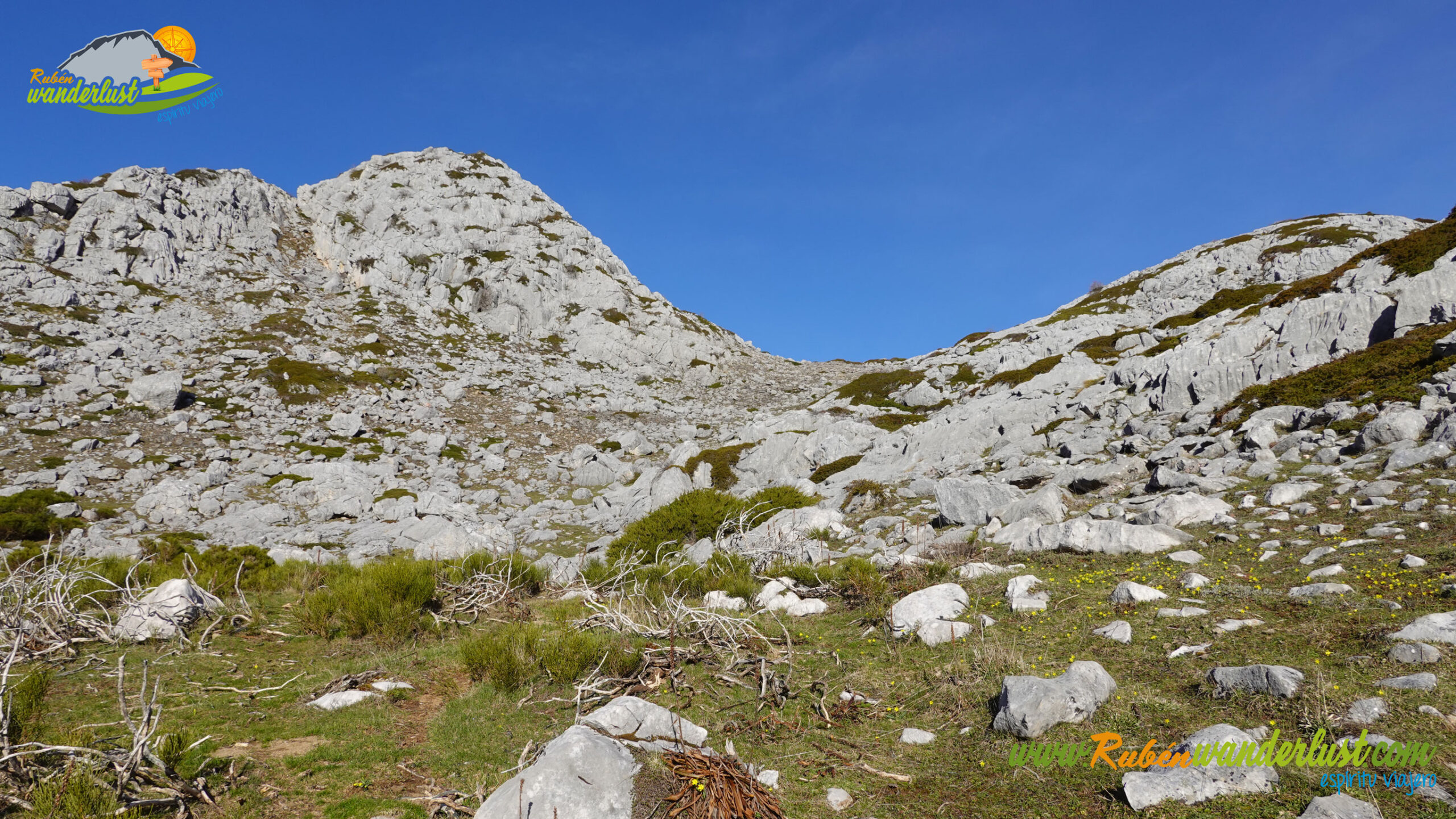 Pronto llegamos al collado que da acceso a Las Vizarreas, territorio kárstico. Seguidamente, un desvío nos permite continuar por Las Vizarreas o girar hacia la derecha para iniciar los distintos ascensos. Son varios, así que allá vamos!