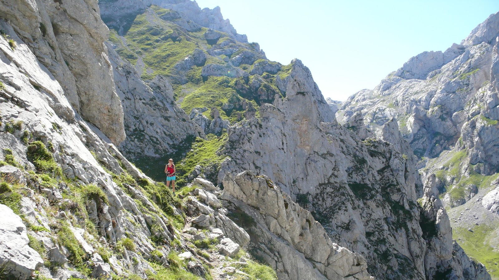 Continuamos nuestra ruta, siempre bien señalizada, marcada con hitos y señales que no dejan lugar a dudas. El hayedo da paso, siguiendo la Riega de la Sotín, a la Vega de la Sotín, una gran pradera en el corazón de Picos de Europa. A nuestra derecha, la Torre del Friero asoma imponente, con la canal estrecha, de más de 1.000 metros de desnivel y tan típica y conocida mundialmente en escalada invernal. Seguimos teniendo unas vistas excepcionales a nuestra espalda, perfecta disculpa para girarse y comprobar que seguimos todos a buen ritmo! En la Vega de la Sotín tenemos dos opciones para continuar hacia Collado Jermoso: la primera y más cómoda, ascender hacia el Collado Solano; la segunda, remontar la Canal Honda, más directa, pero más pedregosa, pindia y peligrosa, ya que avanzar es tarea complicada por la gran cantidad de piedras que hay. Obviamente, a pesar de rodear y hacer algo más larga la ruta, elegimos ascender la canal ancha hacia el Collado Solano, tomando un desvío perfectamente señalizado.