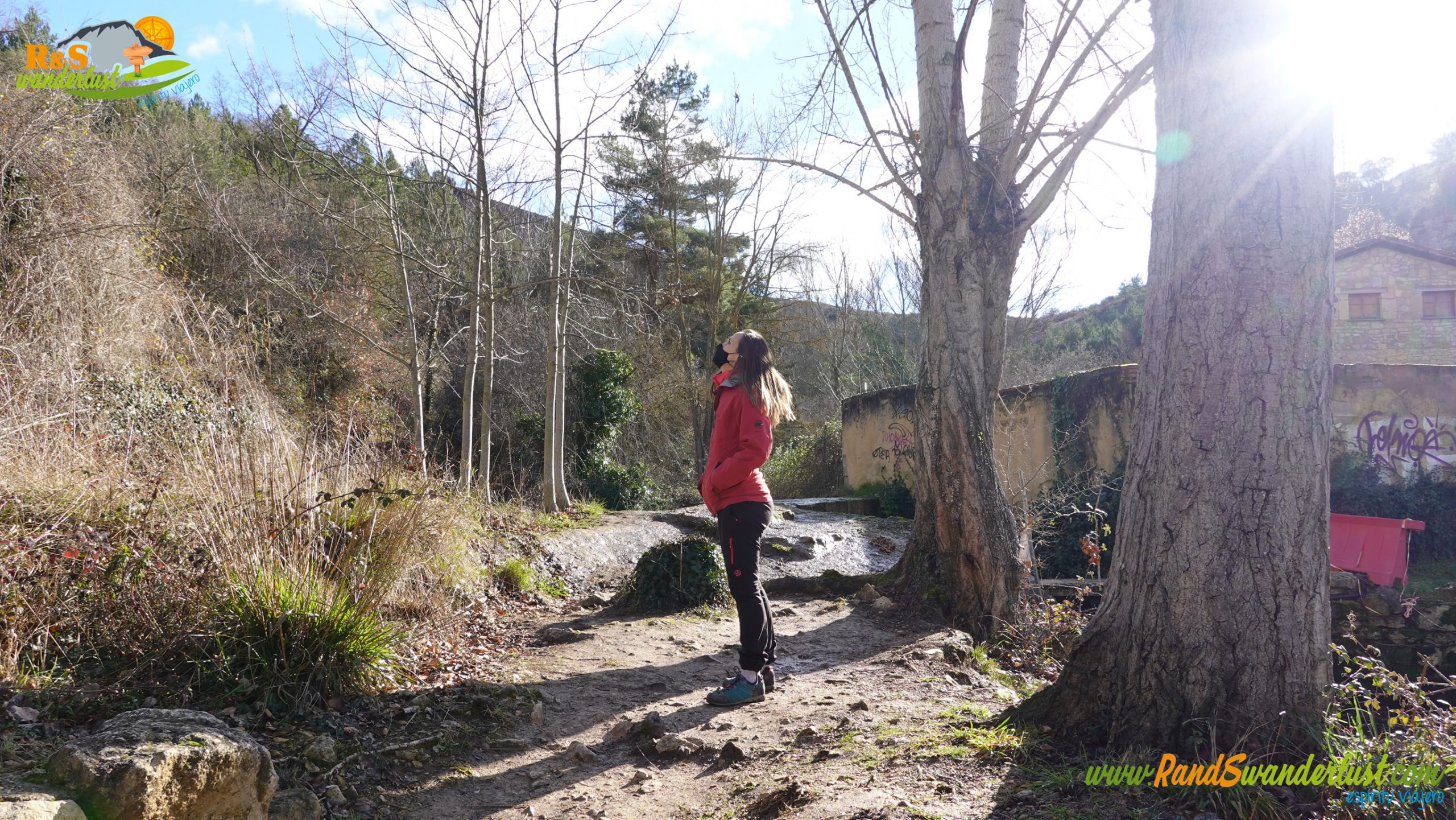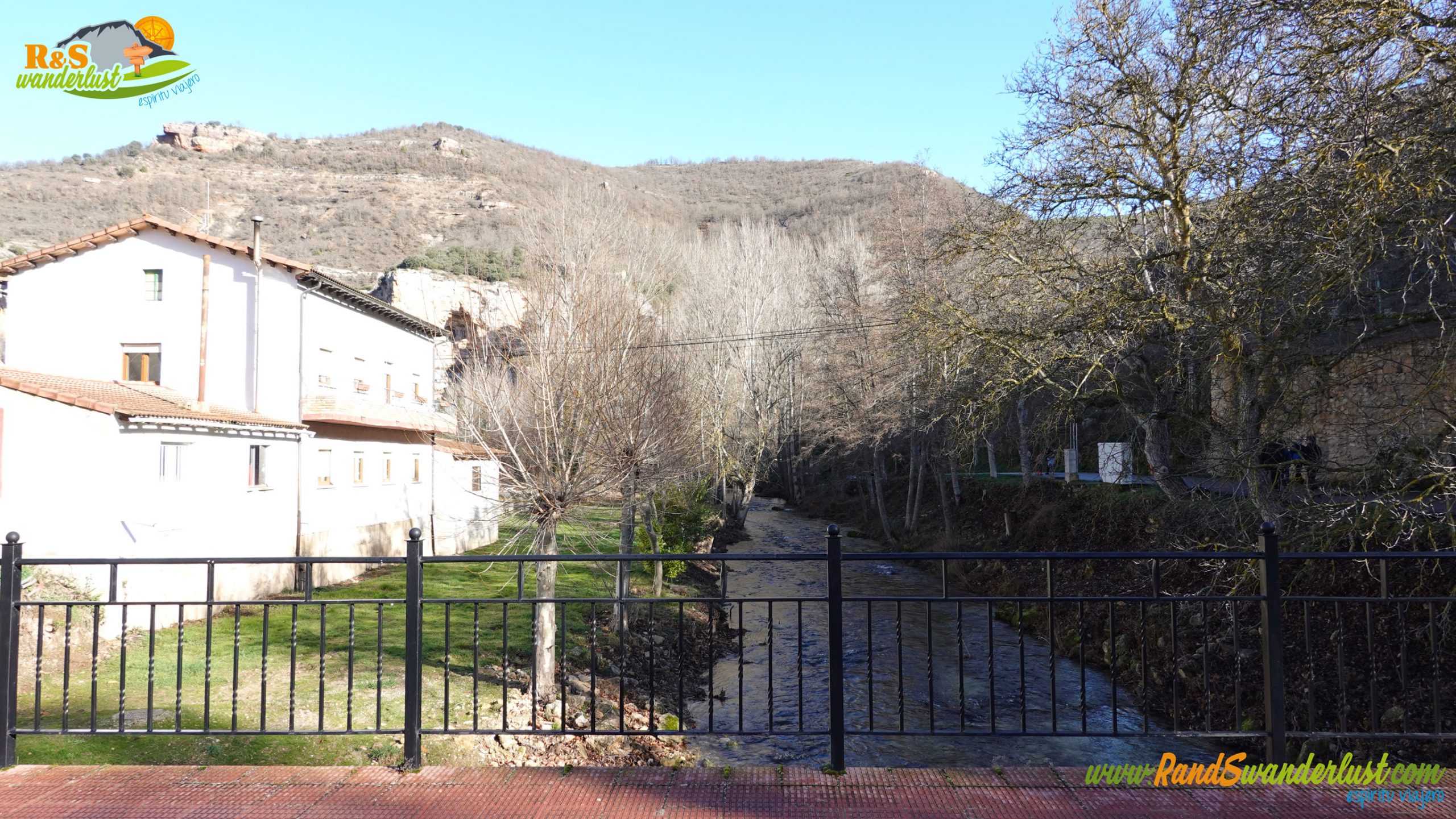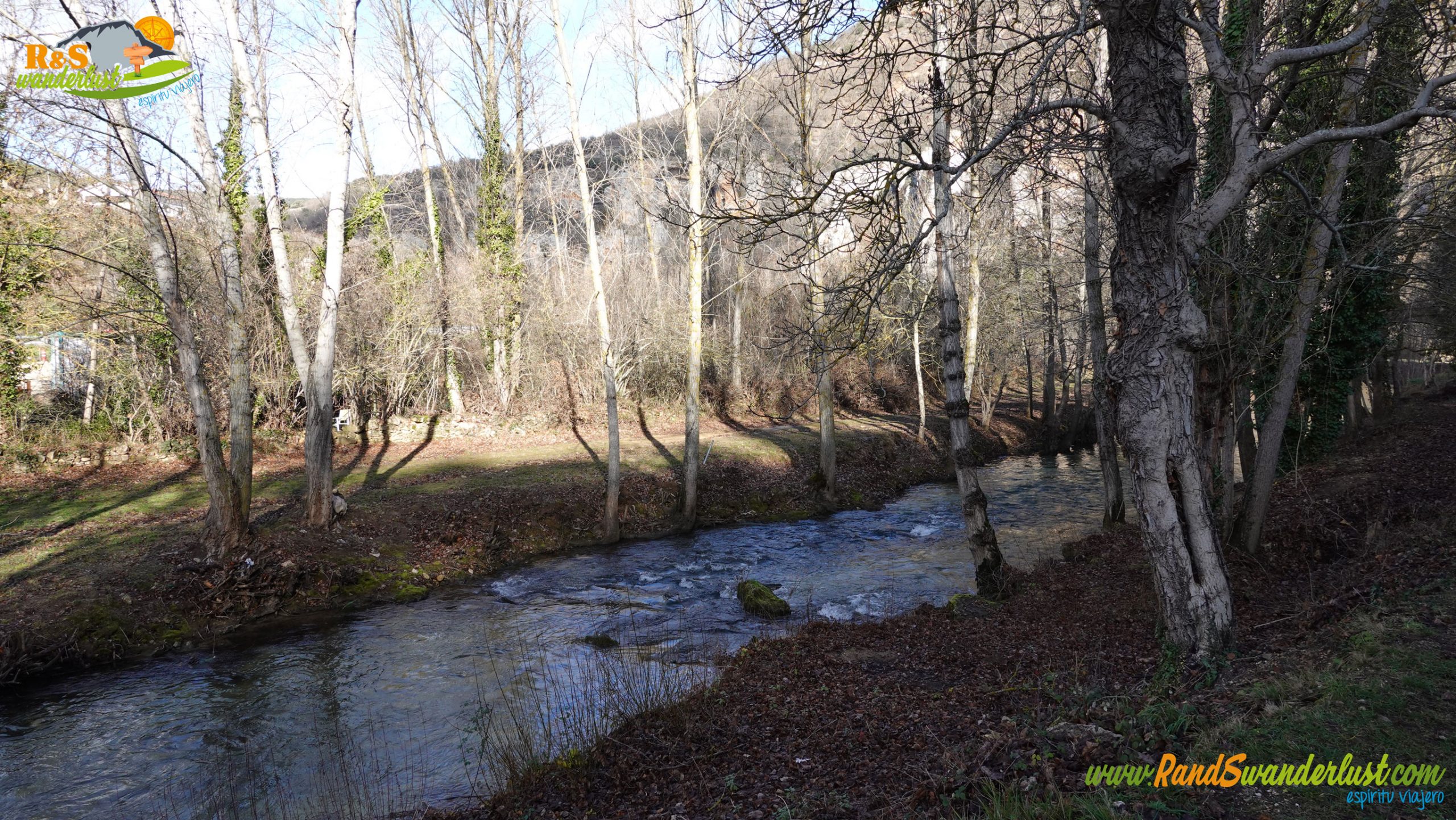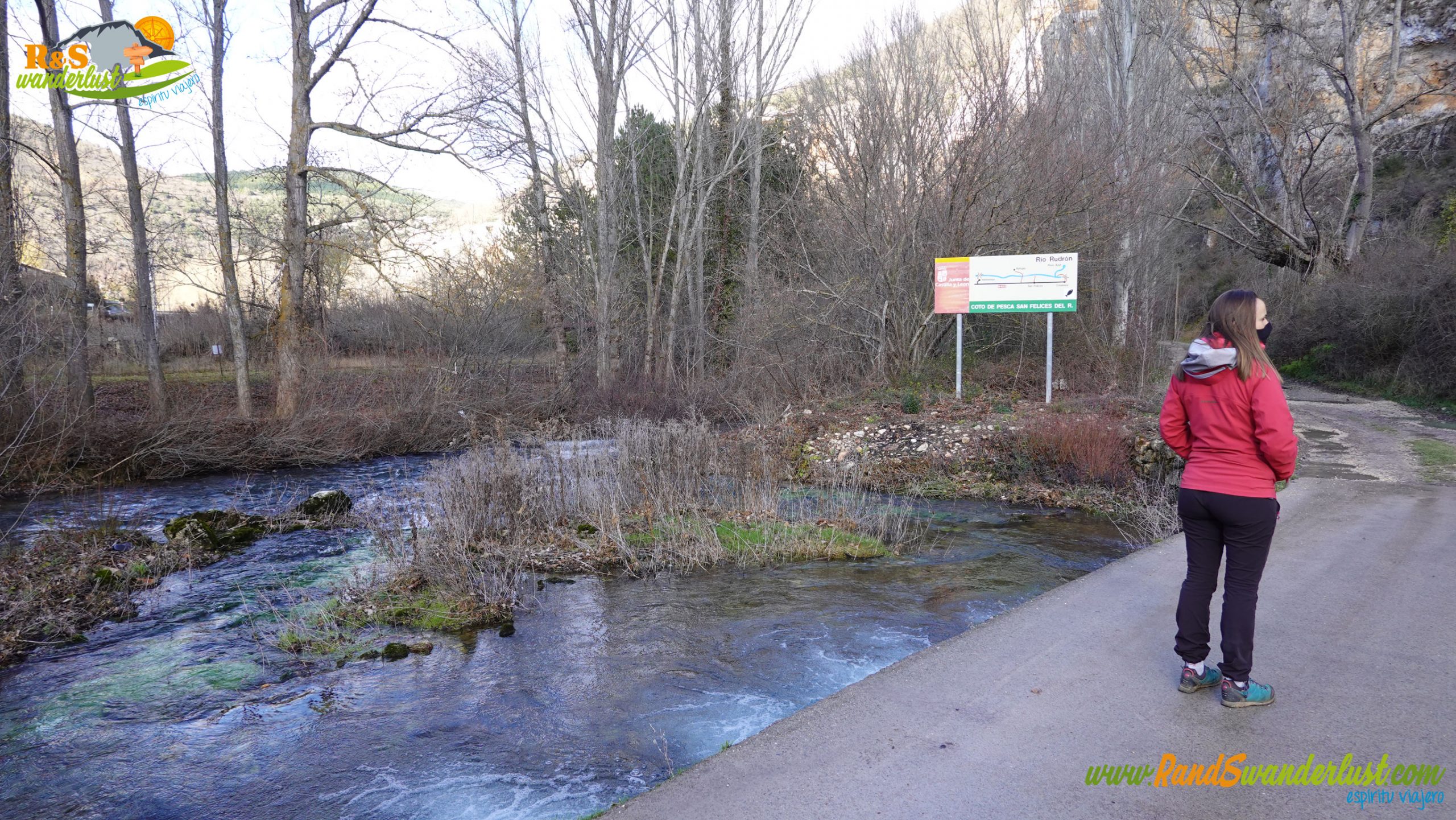 Cruzamos un puente sobre el Río Rudrón y nos desviamos hacia la izquierda para continuar hacia el Pozo Azul. Esta primera parte será un agradable paseo por una pista ancha y sin complicaciones, siempre paralela al río mencionado.
