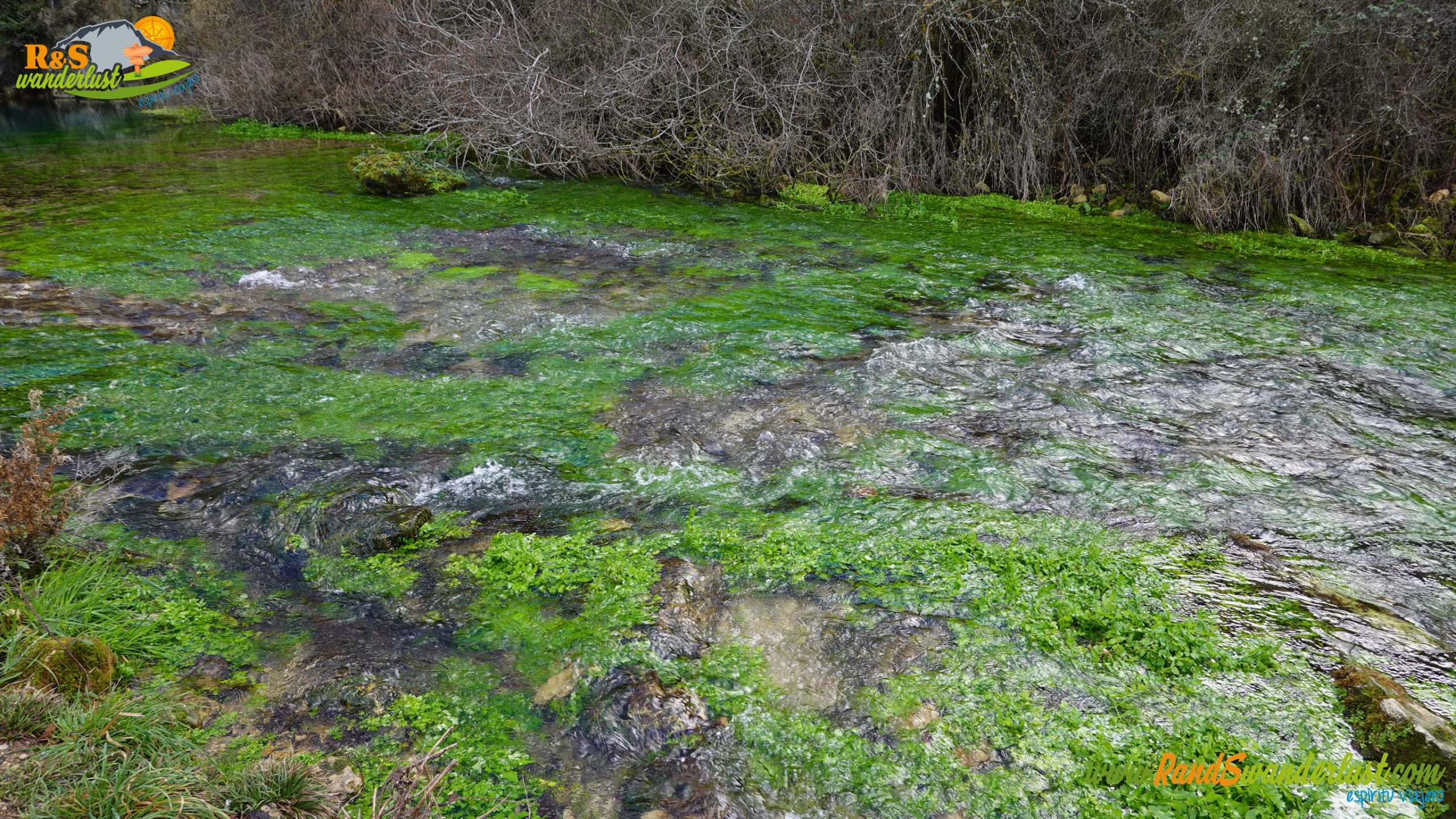 Cambiamos la cómoda pista por un estrecho sendero. El camino sigue siendo sencillo y apenas tiene desnivel, así que vamos avanzando rápidamente. Distinguimos una pequeña cavidad y echamos un vistazo al arroyo, a nuestra derecha, que nos brinda unas aguas muy curiosas, con tonos verdosos y cristalinos.