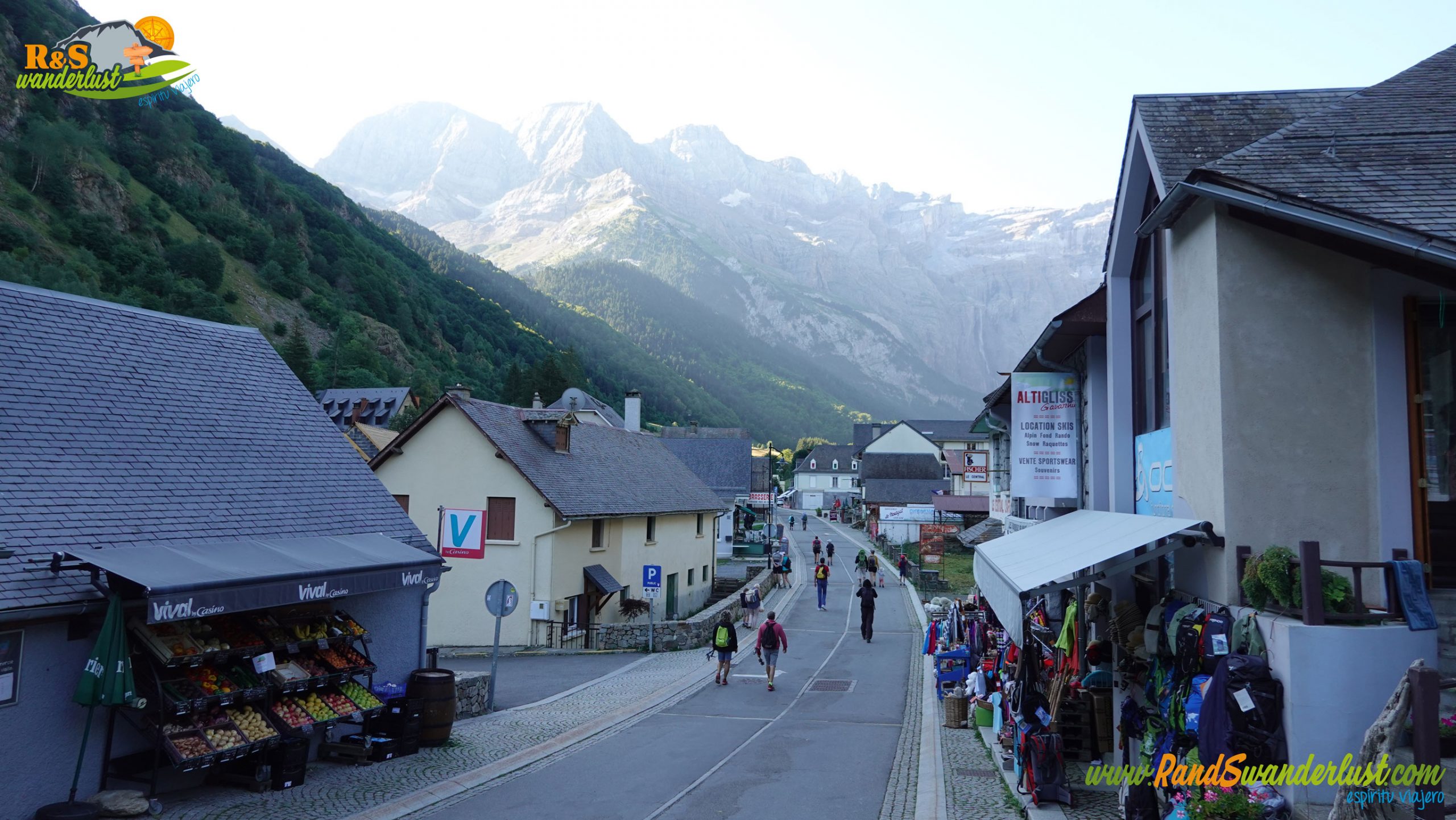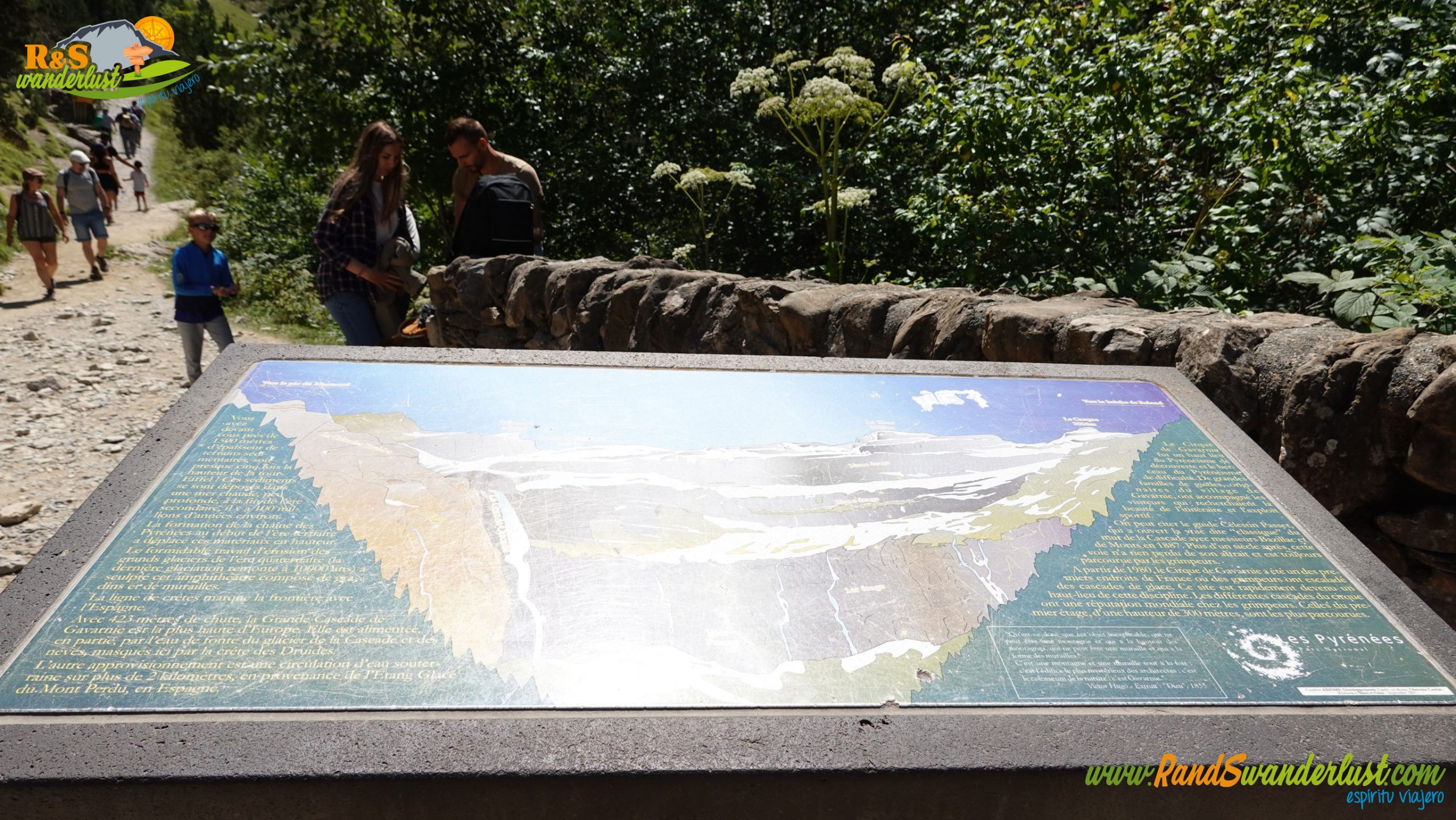 Iniciamos la marcha cruzando Gavarnie hacia el sur. Incluso desde aquí, ya podemos ver la Grande Cascade del Cirque de Gavarnie, uno de los principales atractivos de la ruta. Seguimos un desvío y ponemos atención a un cartel informativo sobre la zona. También compramos pan, que la jornada será larga!