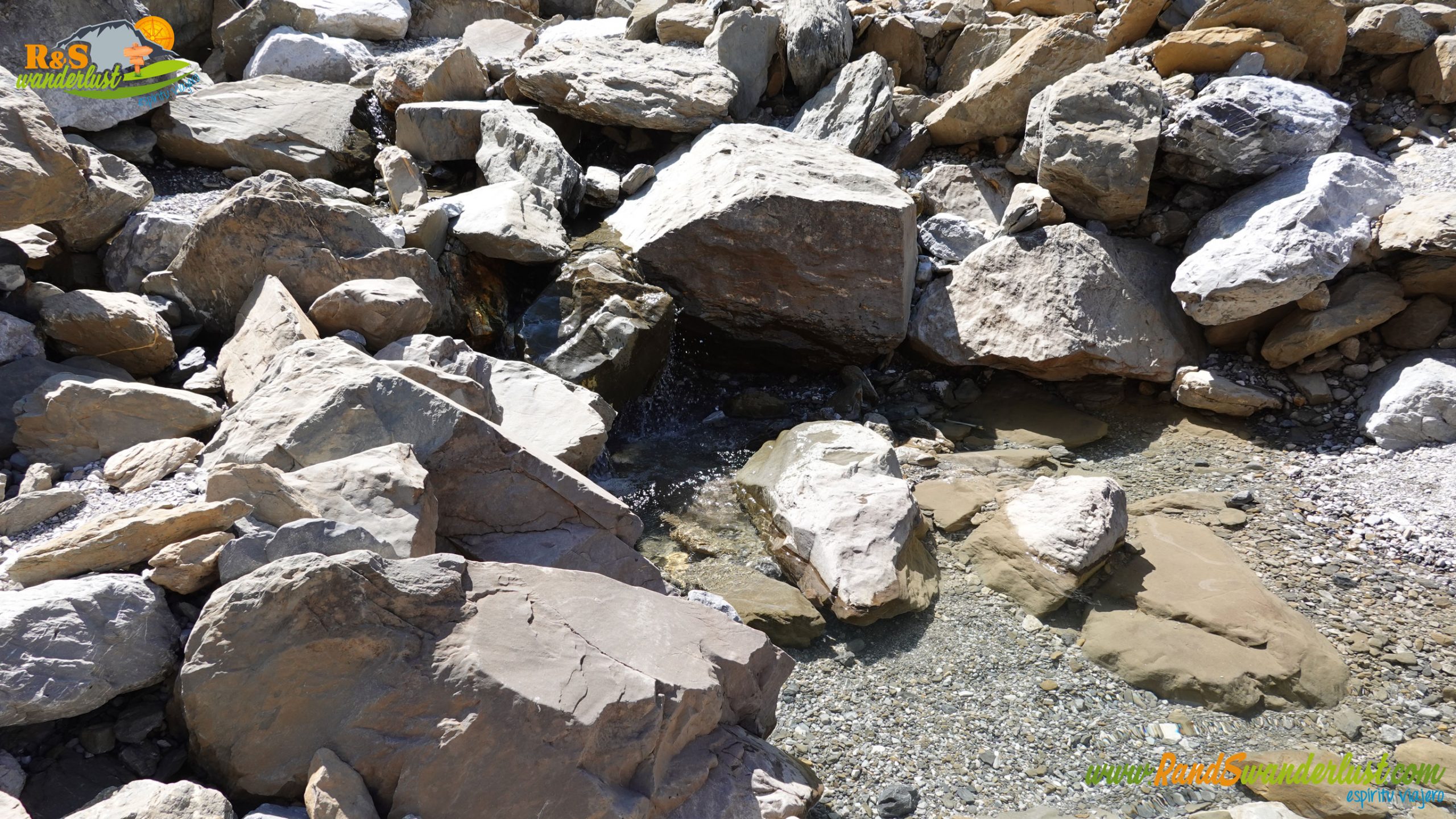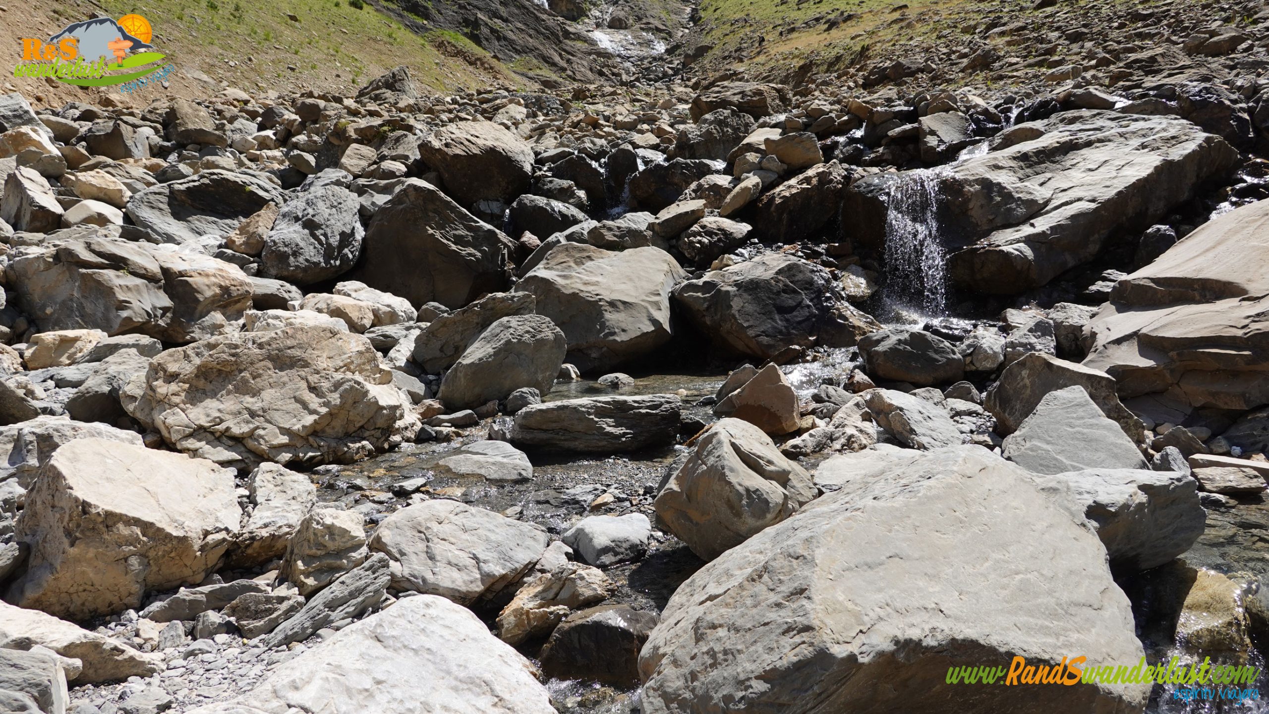 Sobre terreno de alta montaña y muy pedregoso, de esos que das un paso hacia delante y dos hacia atrás, vamos ganando los metros que nos separan de la base de la Grande Cascade. Llegar aquí es muy divertido, pues el terreno es muy inclinado y subir y bajar se supone una tarea bastante graciosa!