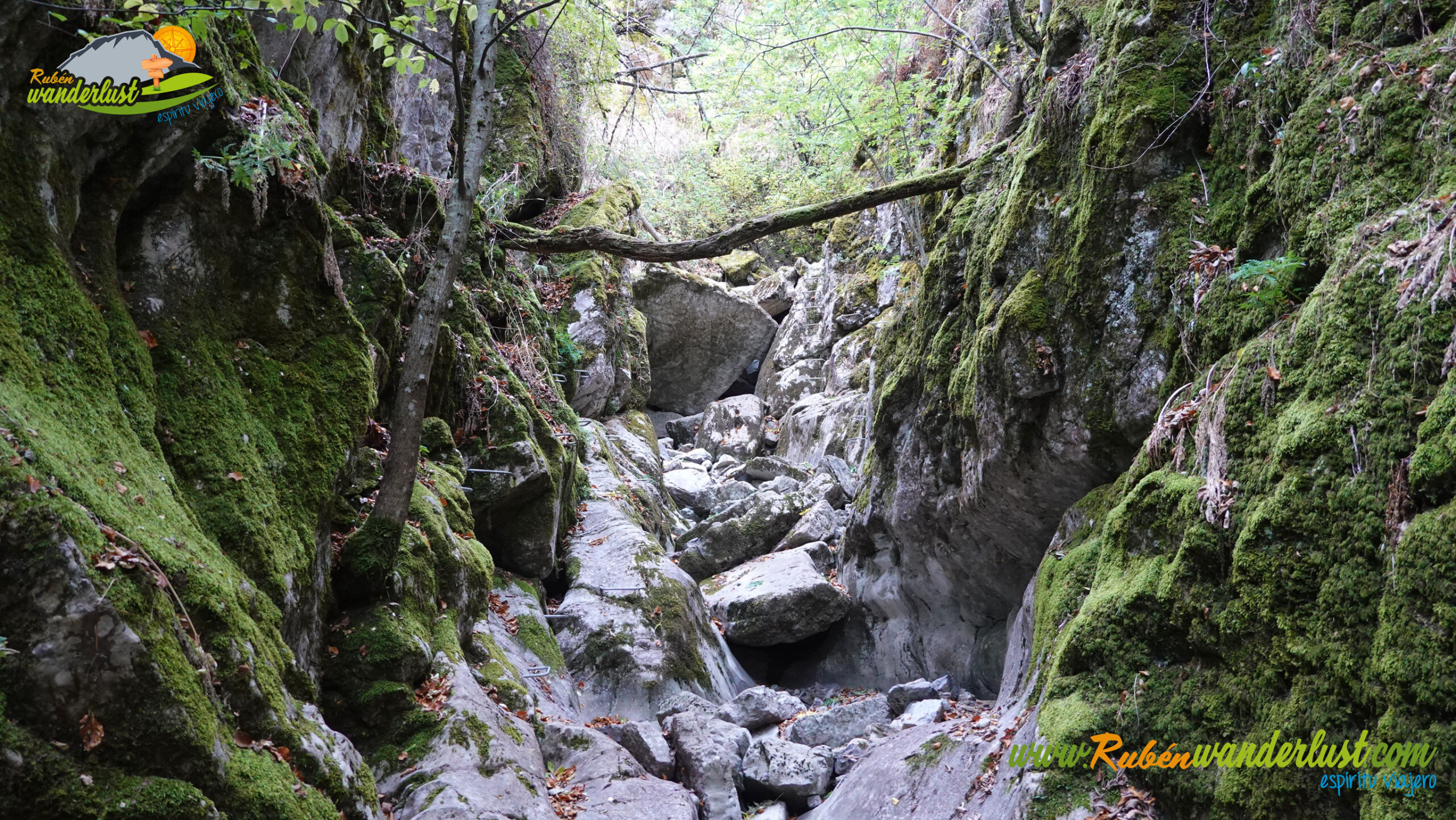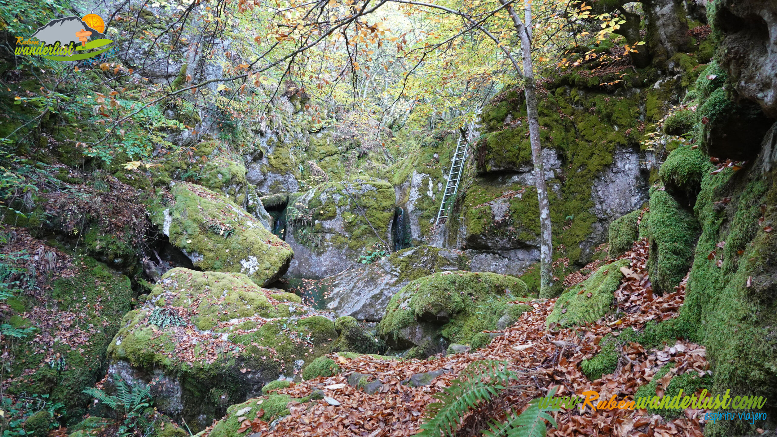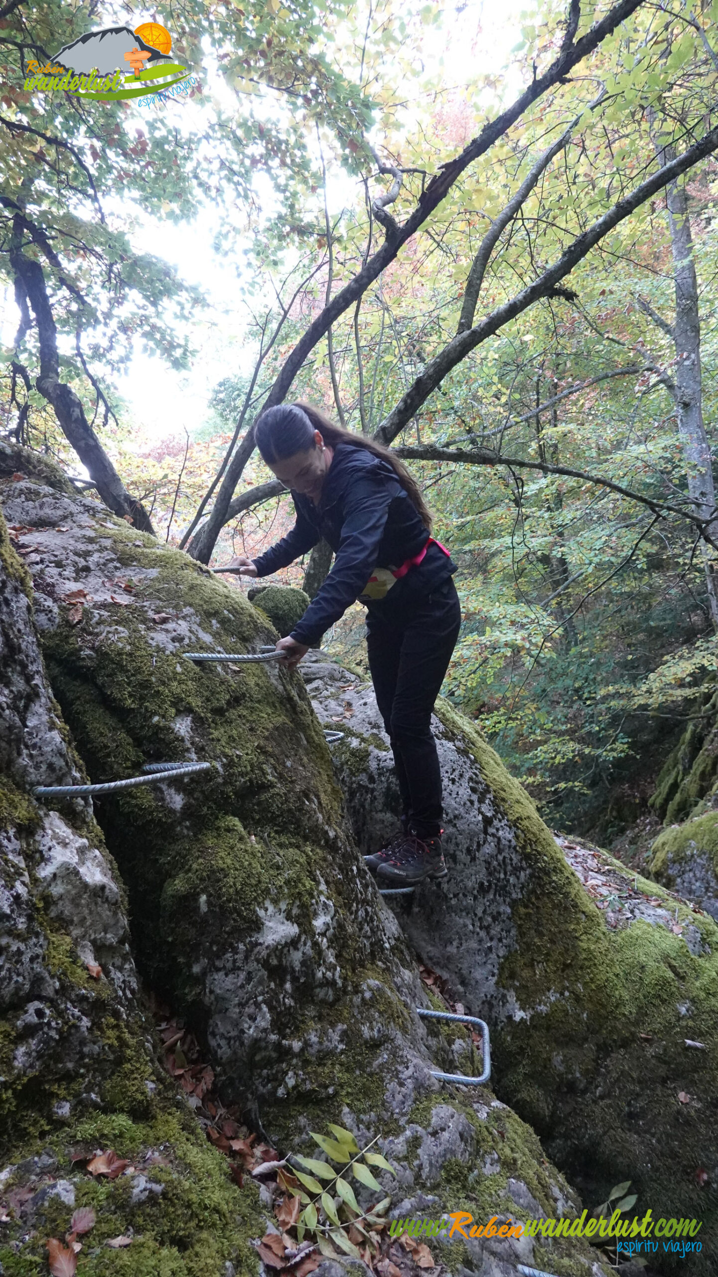 Andrea flipa a cada paso y se da cuenta de lo que ofrece la Foz de Meleros! Comenzamos un tramo que es una delicia, tan espectacular como agreste, y que nos obligará a superar muchos pasos equipados con grapas y escaleras. Un mar de musgo, agua, hayas y tejos, un rincón brutal y que disfrutamos muchísimo! El Arroyo de Meleros se muestra increíble! Incluso vemos una lechuza surcar las zonas más estrechas!