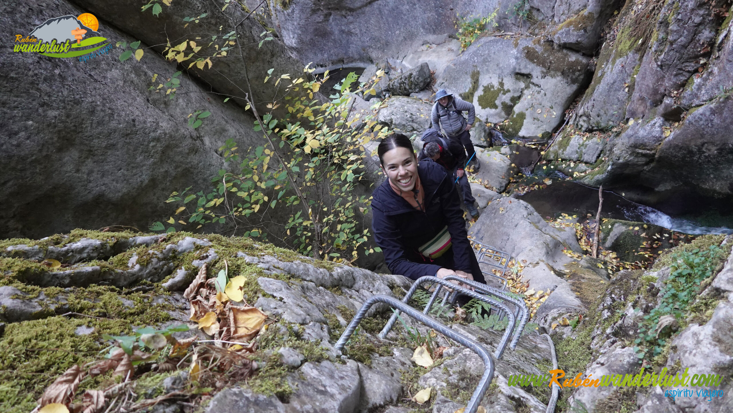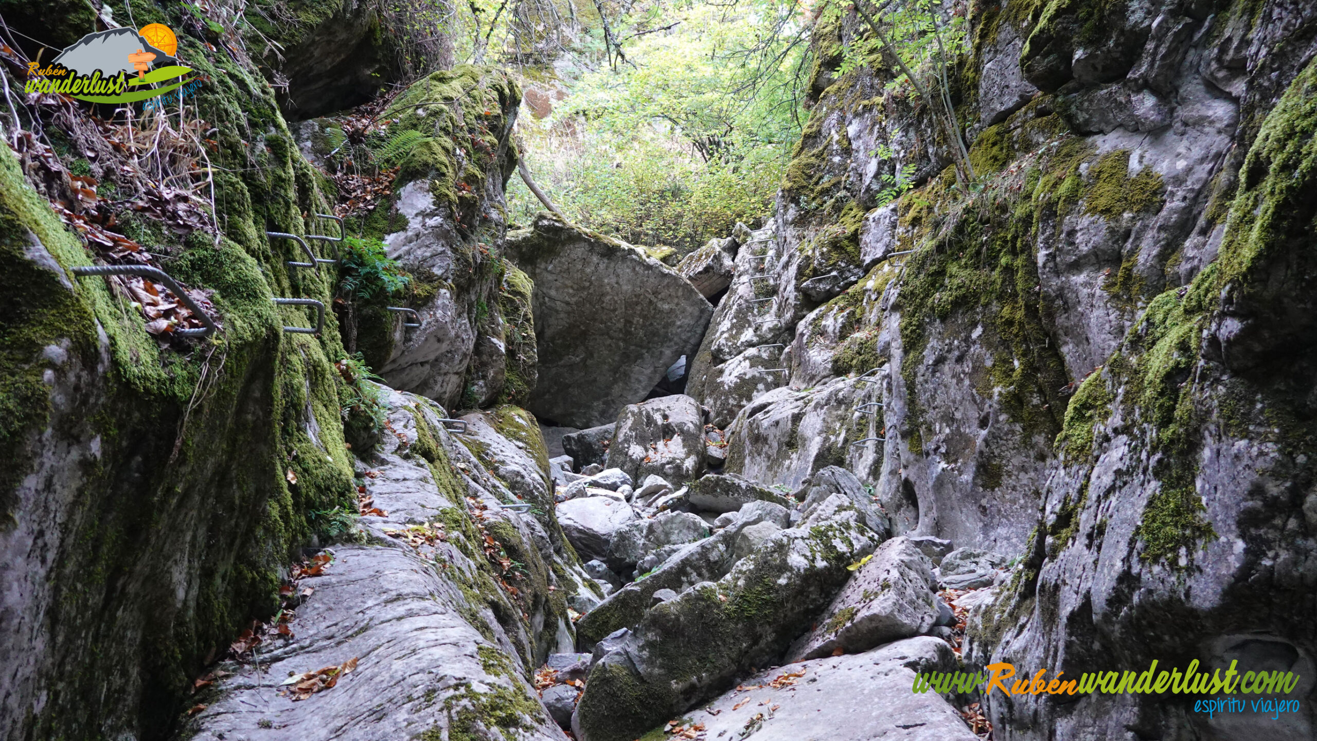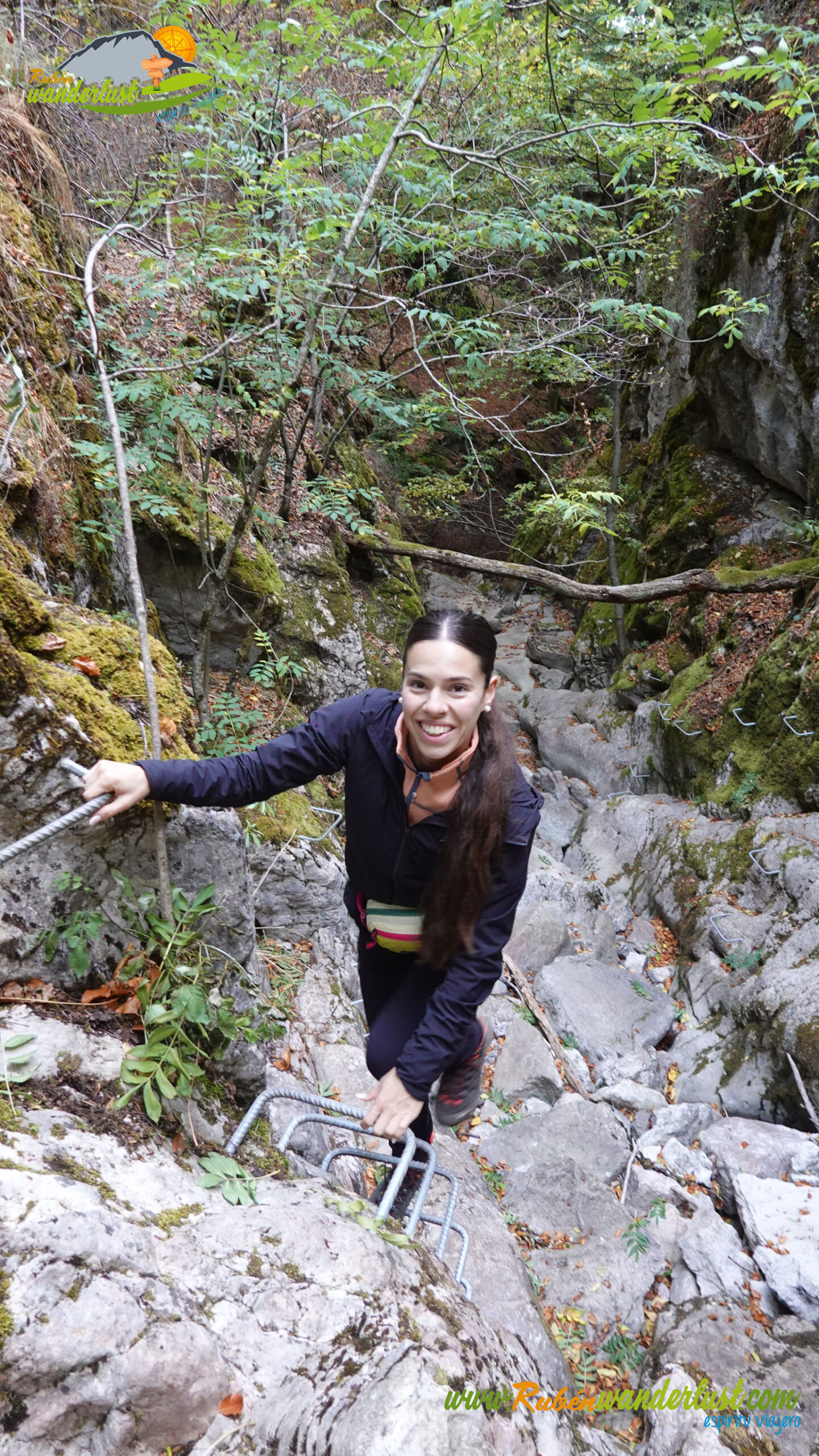Andrea flipa a cada paso y se da cuenta de lo que ofrece la Foz de Meleros! Comenzamos un tramo que es una delicia, tan espectacular como agreste, y que nos obligará a superar muchos pasos equipados con grapas y escaleras. Un mar de musgo, agua, hayas y tejos, un rincón brutal y que disfrutamos muchísimo! El Arroyo de Meleros se muestra increíble! Incluso vemos una lechuza surcar las zonas más estrechas!