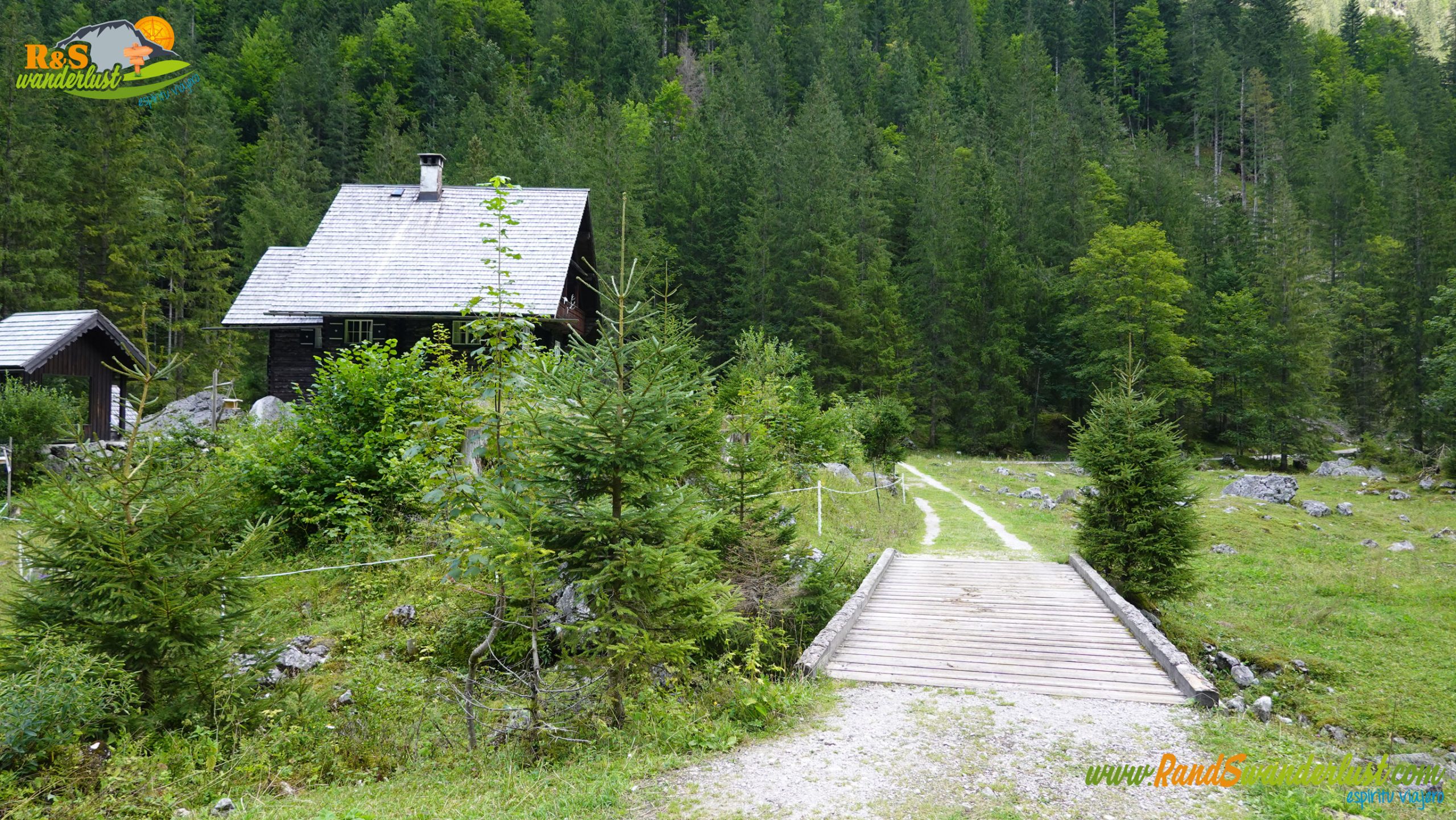 Tras el puente, llegamos a la senda principal que se dirige hacia Hinterer Gosausee. Aquí giramos hacia la derecha y continuamos el recorrido con rumbo sureste. Vemos Gosaulacke (otra pequeña laguna), una cabaña y un puente.