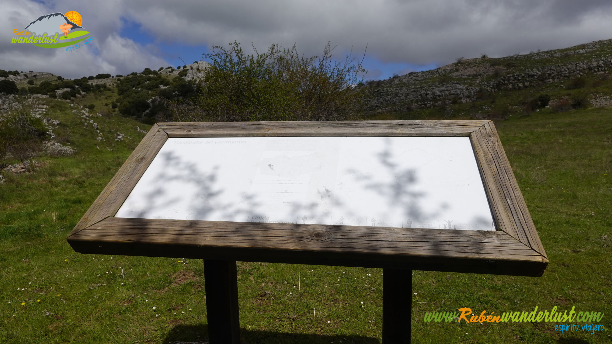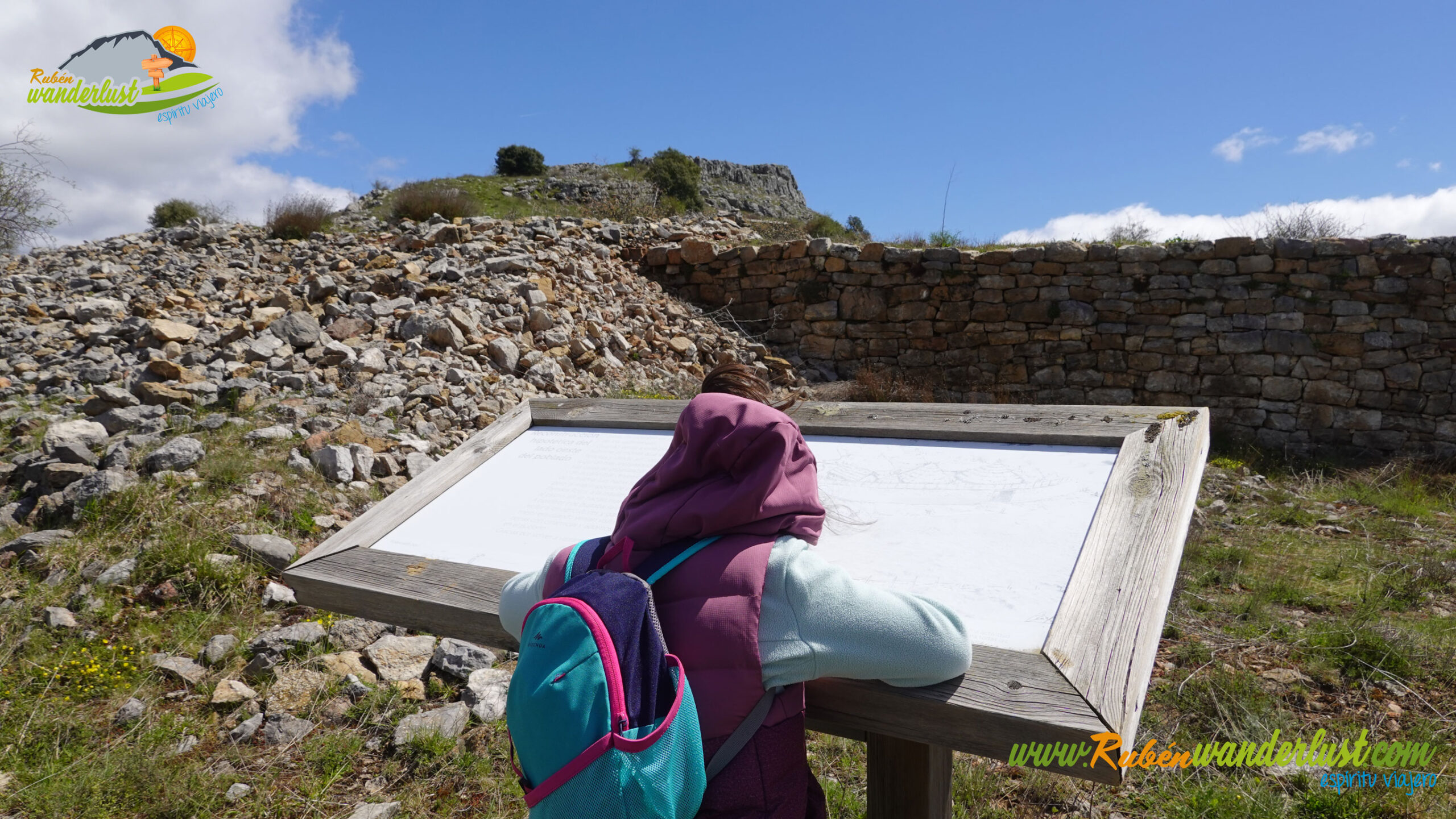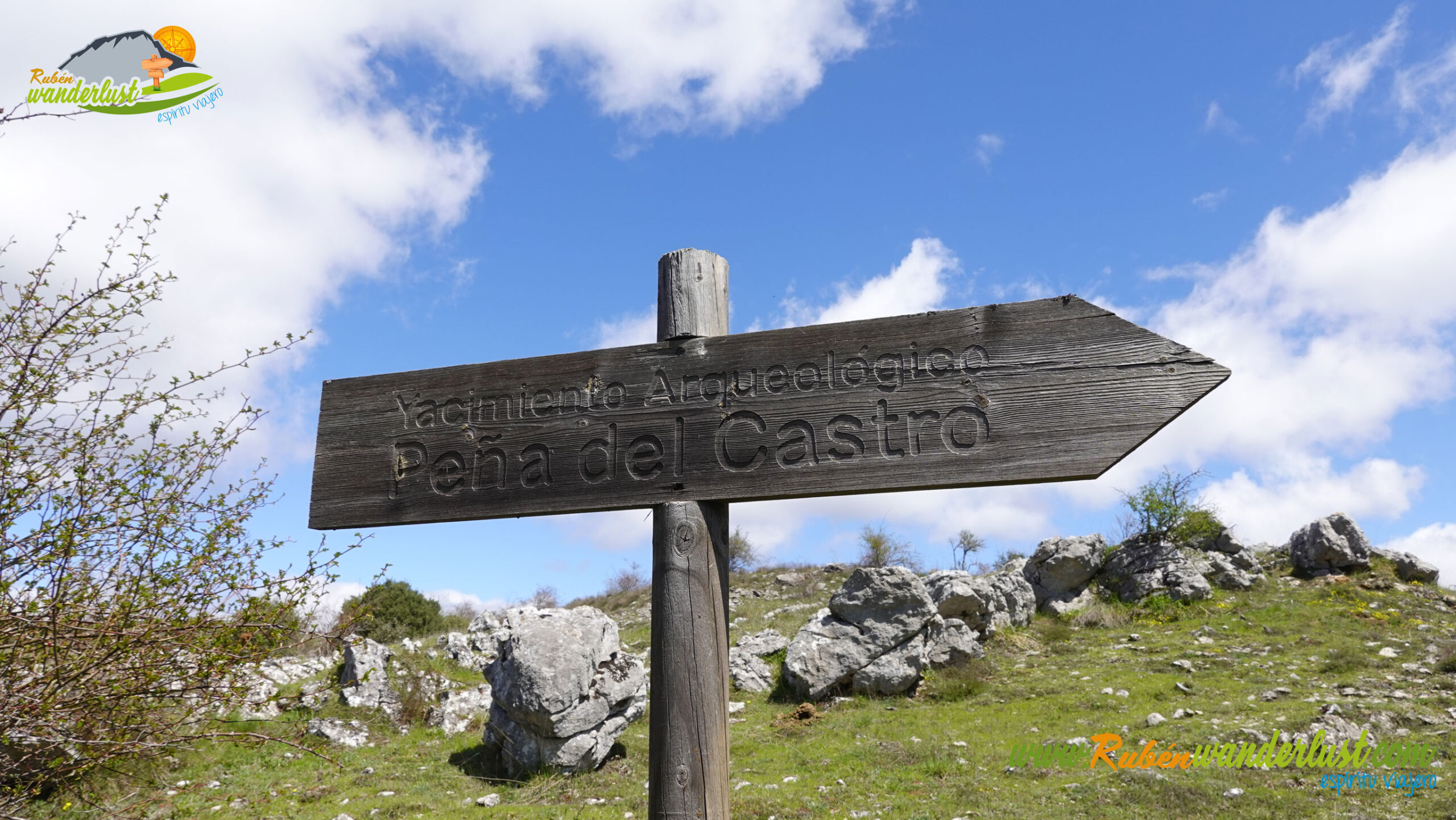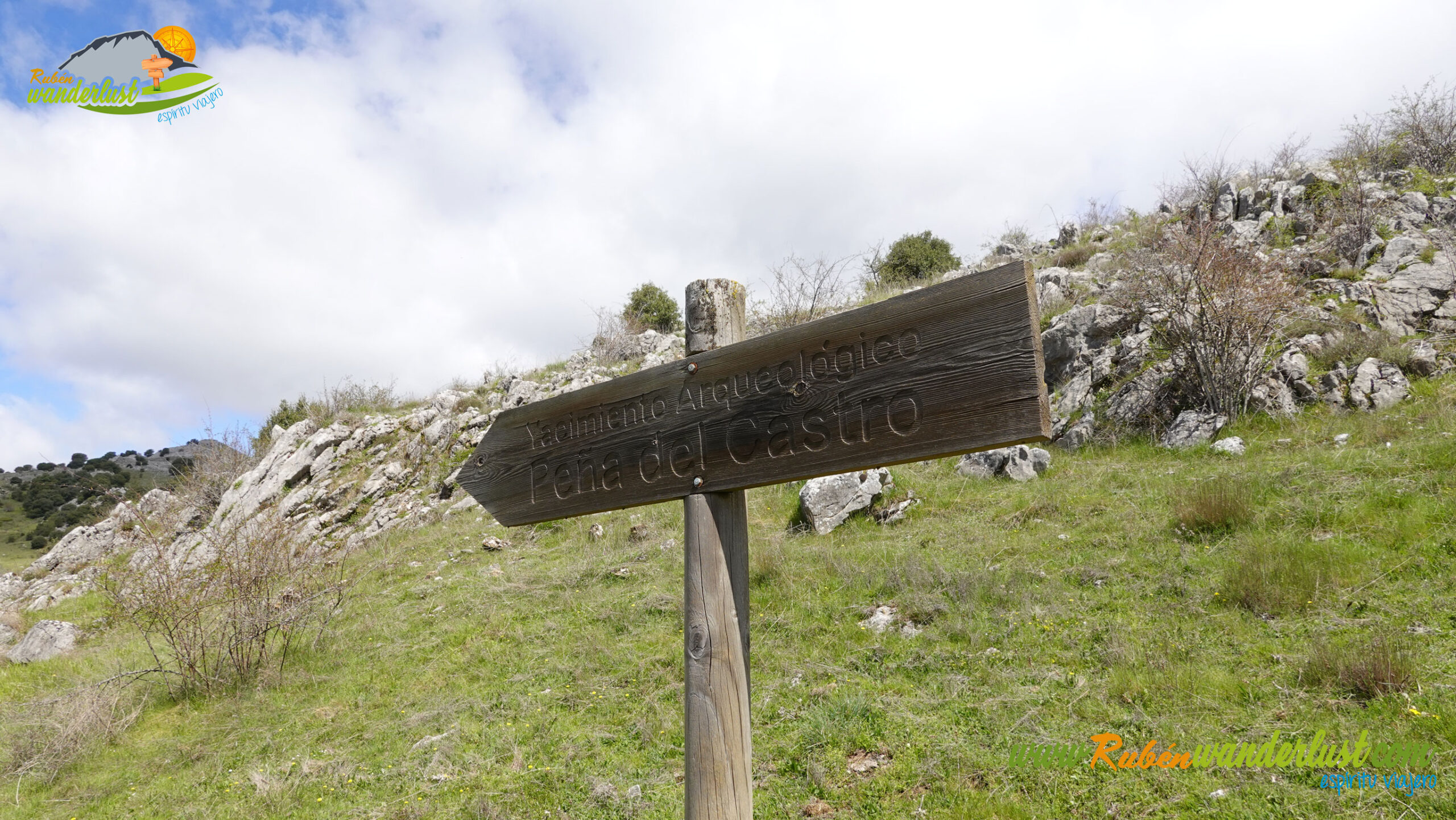 Descendemos unos pocos metros del collado y nos desviamos hacia la derecha para dirigirnos al yacimiento. Otro desvío más, a la derecha, nos llevará hacia un cartel informativo de complicada lectura. Aquí abandonamos la senda principal, hacia la izquierda, y continuamos el trazado hacia el Yacimiento Arqueológico Peña del Castro.