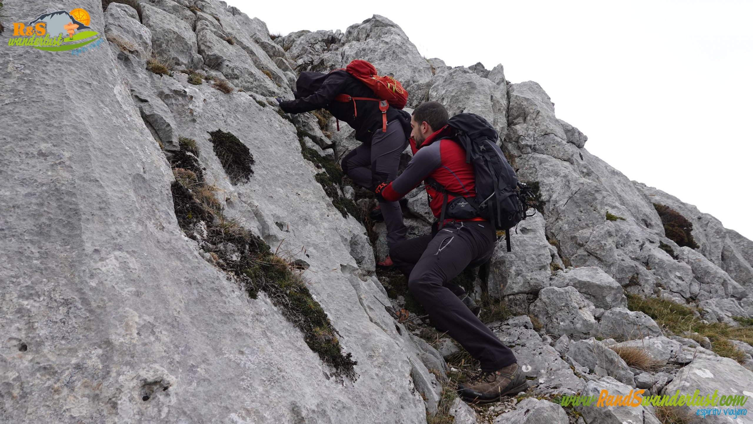 La última parte del ascenso la realizamos por una pequeña grieta en la gran mole rocosa del Pico Cabachín. Su ascensión no es muy evidente y tampoco se encuentra señalizada, pero parece que es la vía más sencilla para llegar arriba. Tan sólo debemos realizar una sencilla trepada antes de llegar a la arista cimera, donde encontramos una trinchera. Espectacular panorámica desde la arista!