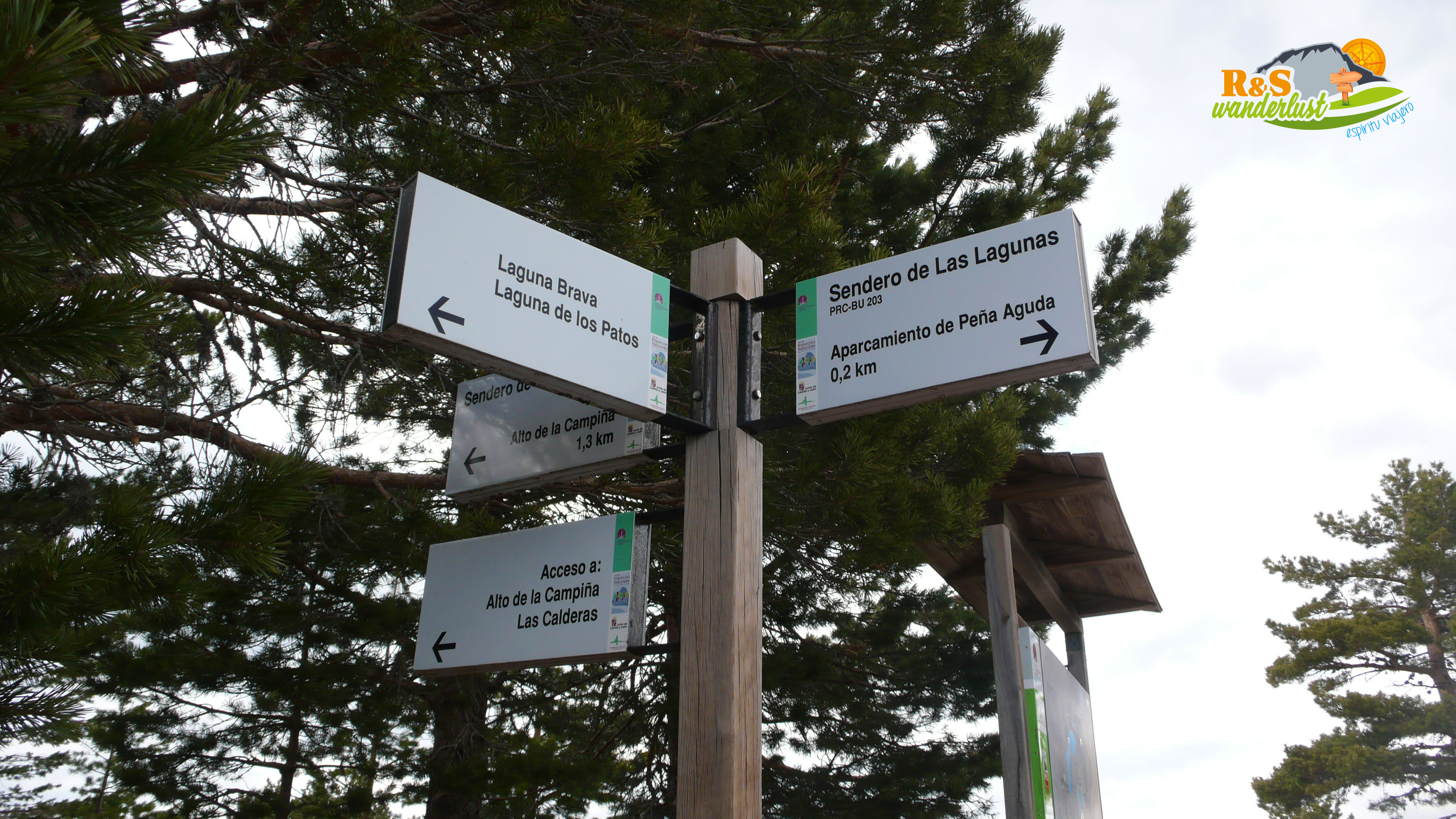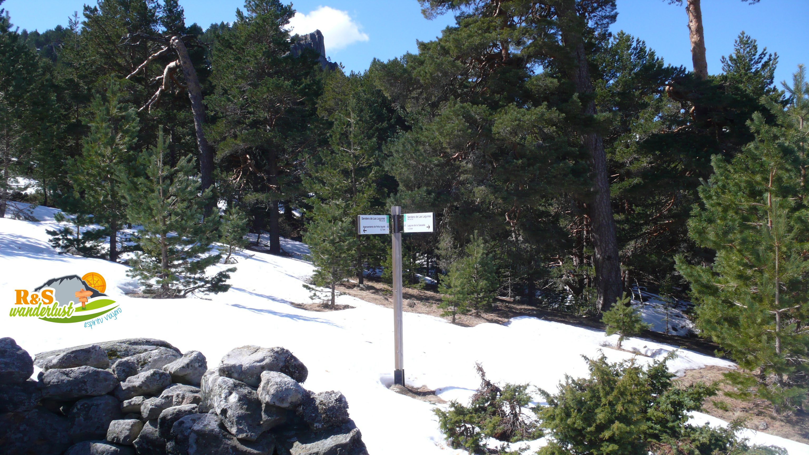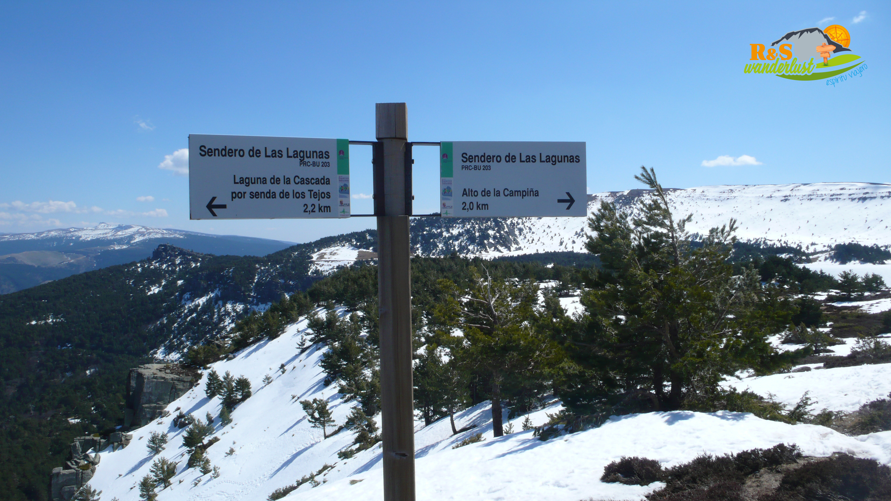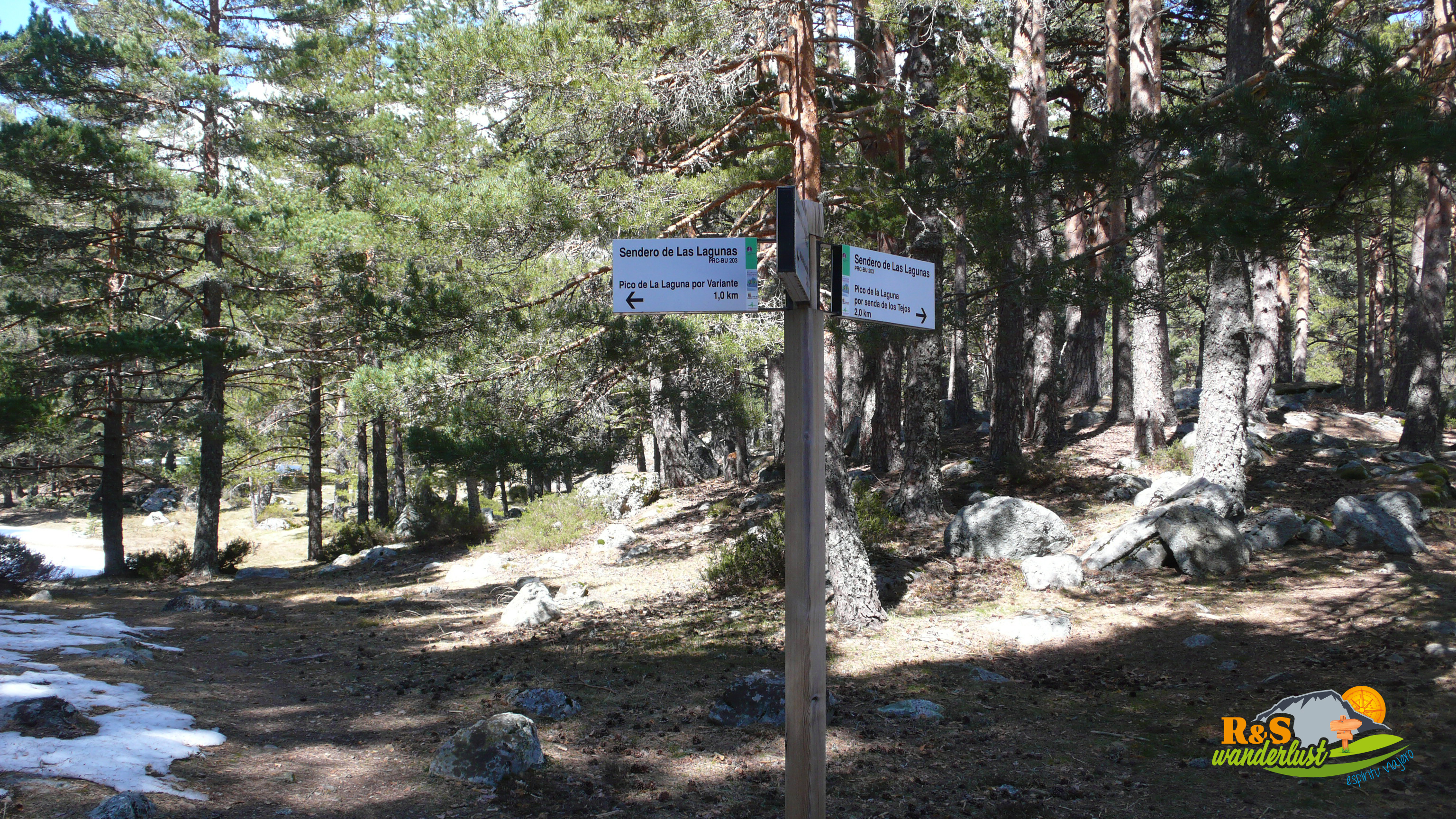 Tras un buen rato subiendo, a muy buen ritmo, llegamos a la altura del cordal, donde encontramos un bonito mirador de piedras y un desvío que nos indica por dónde llega la Senda de los Tejos que descartamos en la Laguna de la Cascada. Aparece la Laguna Negra en primer término y la Laguna Larga al fondo. Breve descanso y muchas fotos, antes de continuar hacia el Pico de la Laguna, perfectamente visible desde aquí.