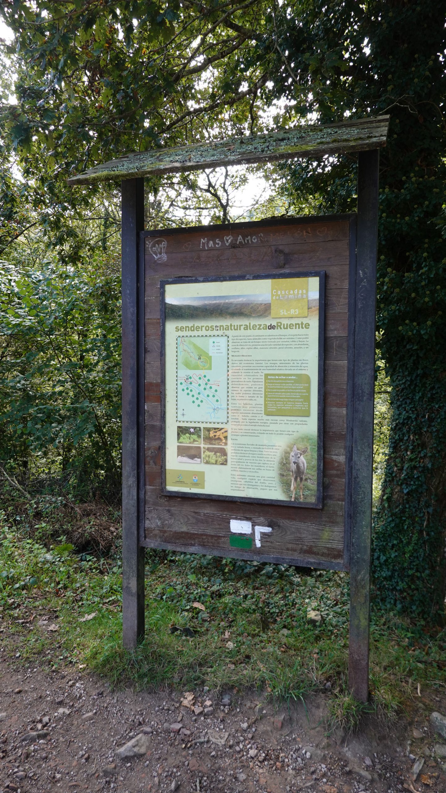 Seguimos caminando por la pista forestal hasta llegar al desvío hacia las Cascadas de Úrsula, lugar donde abandonamos la senda por la que llegamos y donde podemos visitar un cartel informativo sobre dichas cascadas. En este desvío iniciamos uno de los tramos circulares de la ruta.