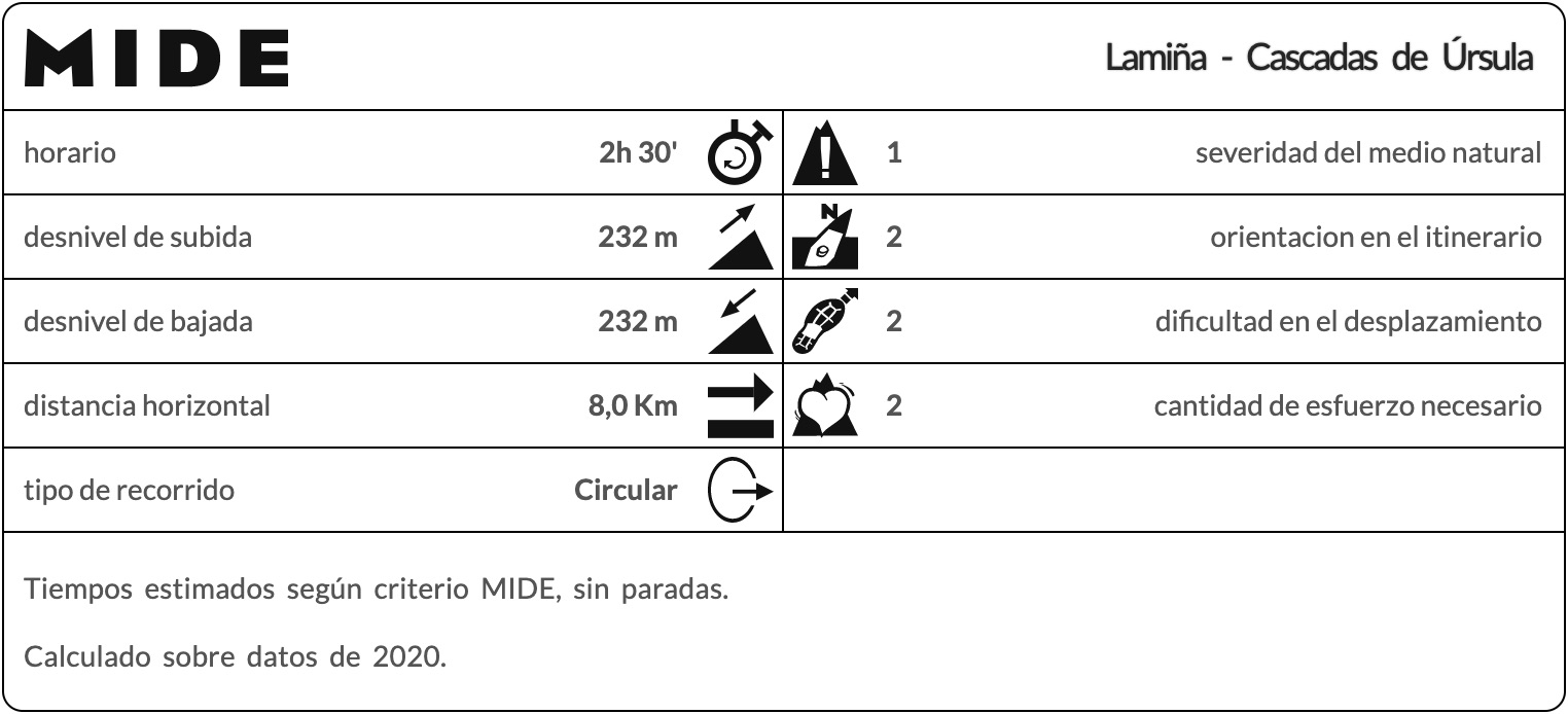 Comenzamos a caminar a lo largo de Lamiña, encontrando una fuente y varios carteles informativos sobre la zona. En el mismo pueblo, un desvío nos indicará el rumbo a seguir para llegar a las Cascadas de Úrsula, donde debemos girar hacia la derecha. Por la izquierda regresaremos, completando la parte circular de la ruta.