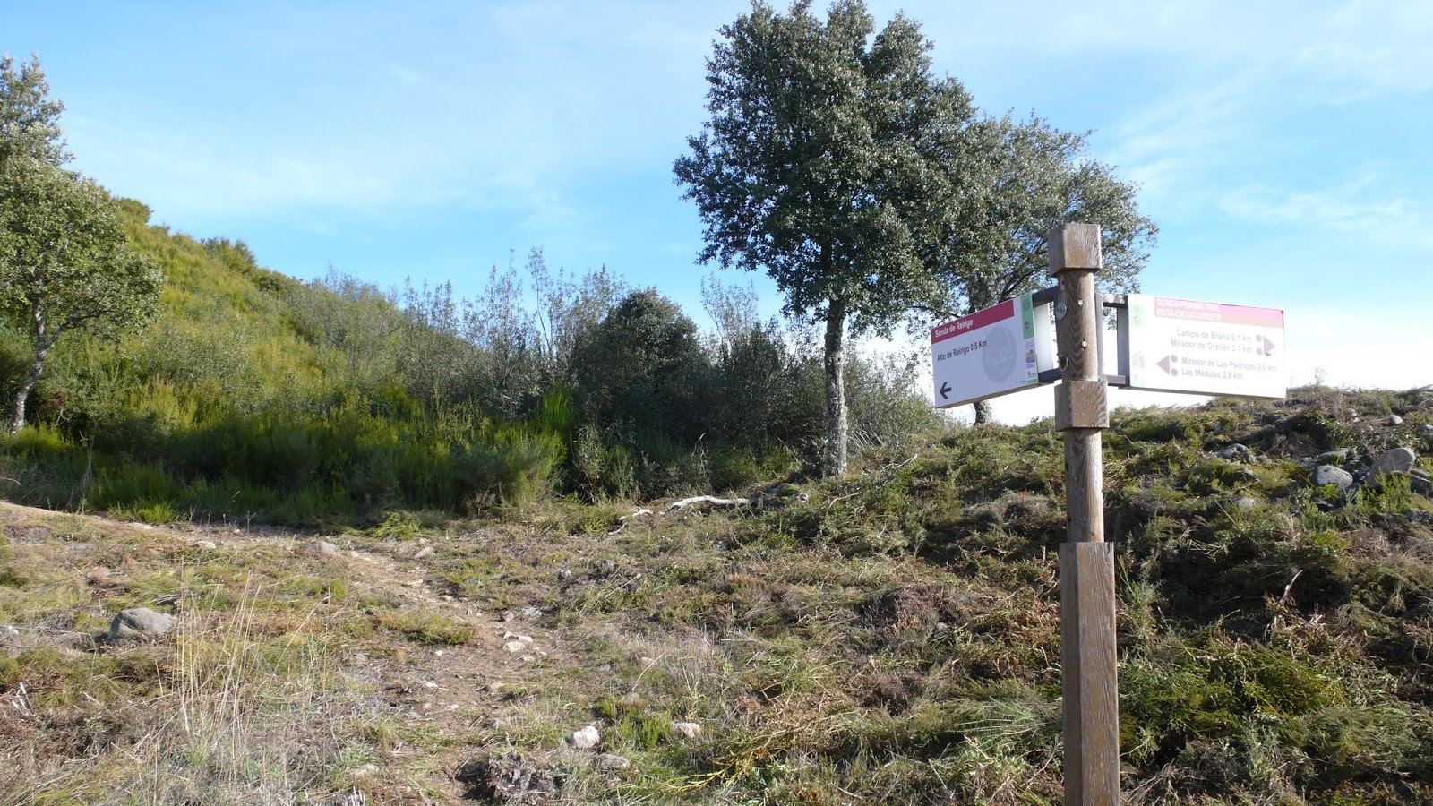 Tras superar la subida, llegamos al Alto de Reirigo (979 m.), desde donde obtenemos unas vistas preciosas de Las Médulas y de toda la hermosa zona que nos rodea. Varias fotos del lugar y continuamos por la senda, rumbo hacia las Galerías de Reirigo y el resto del cordal que nos guiará hacia el Pico de Placias.