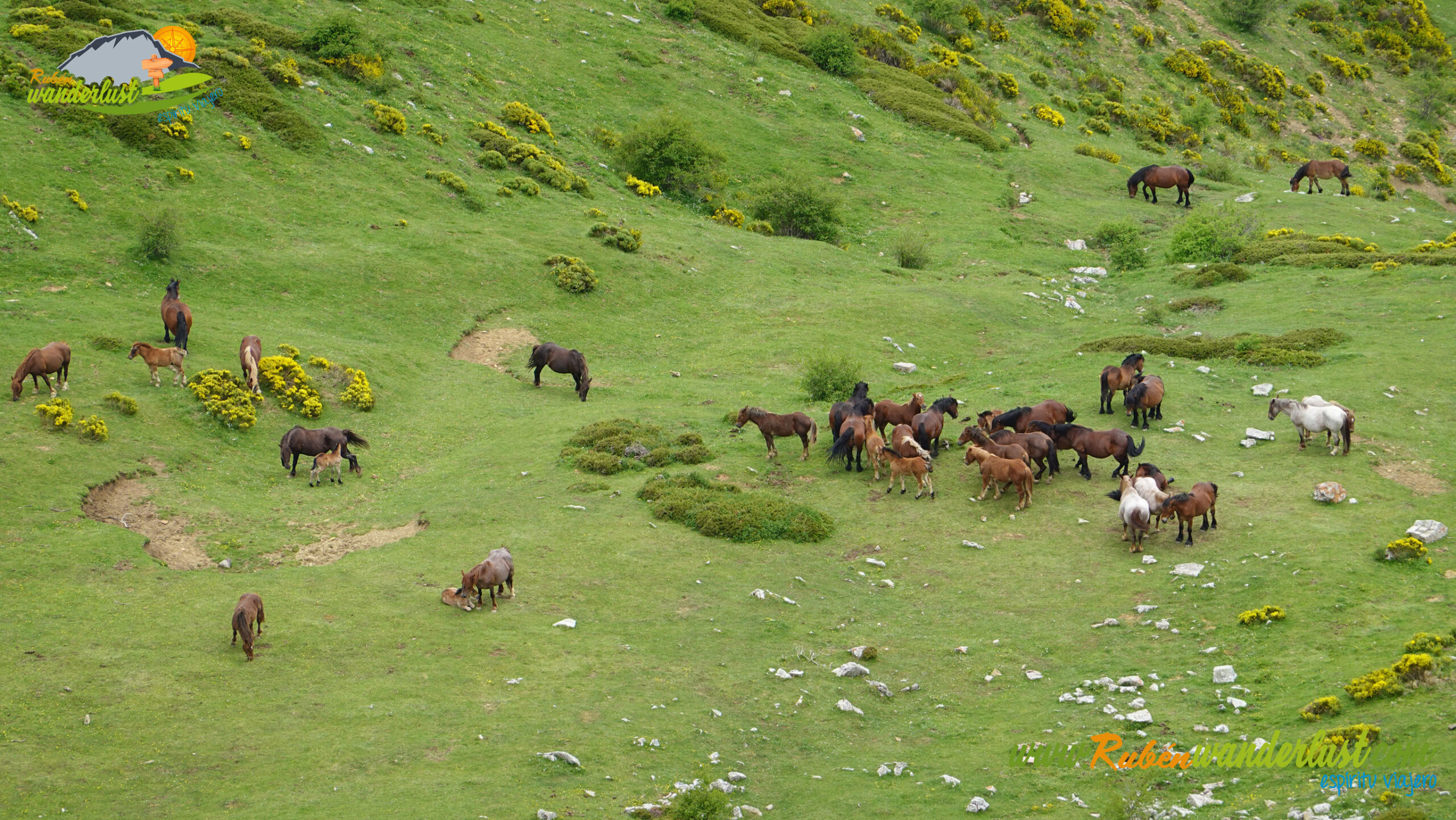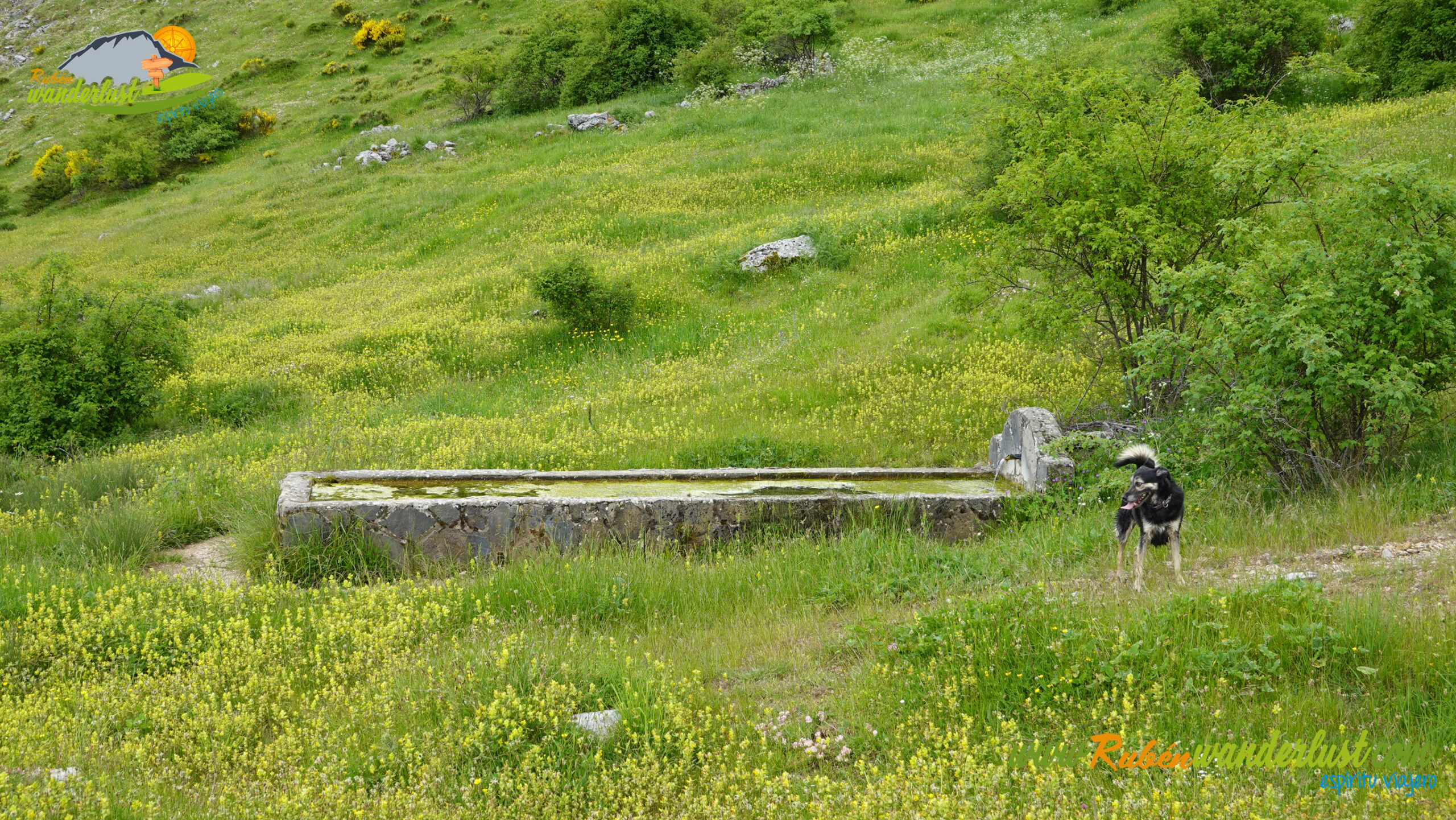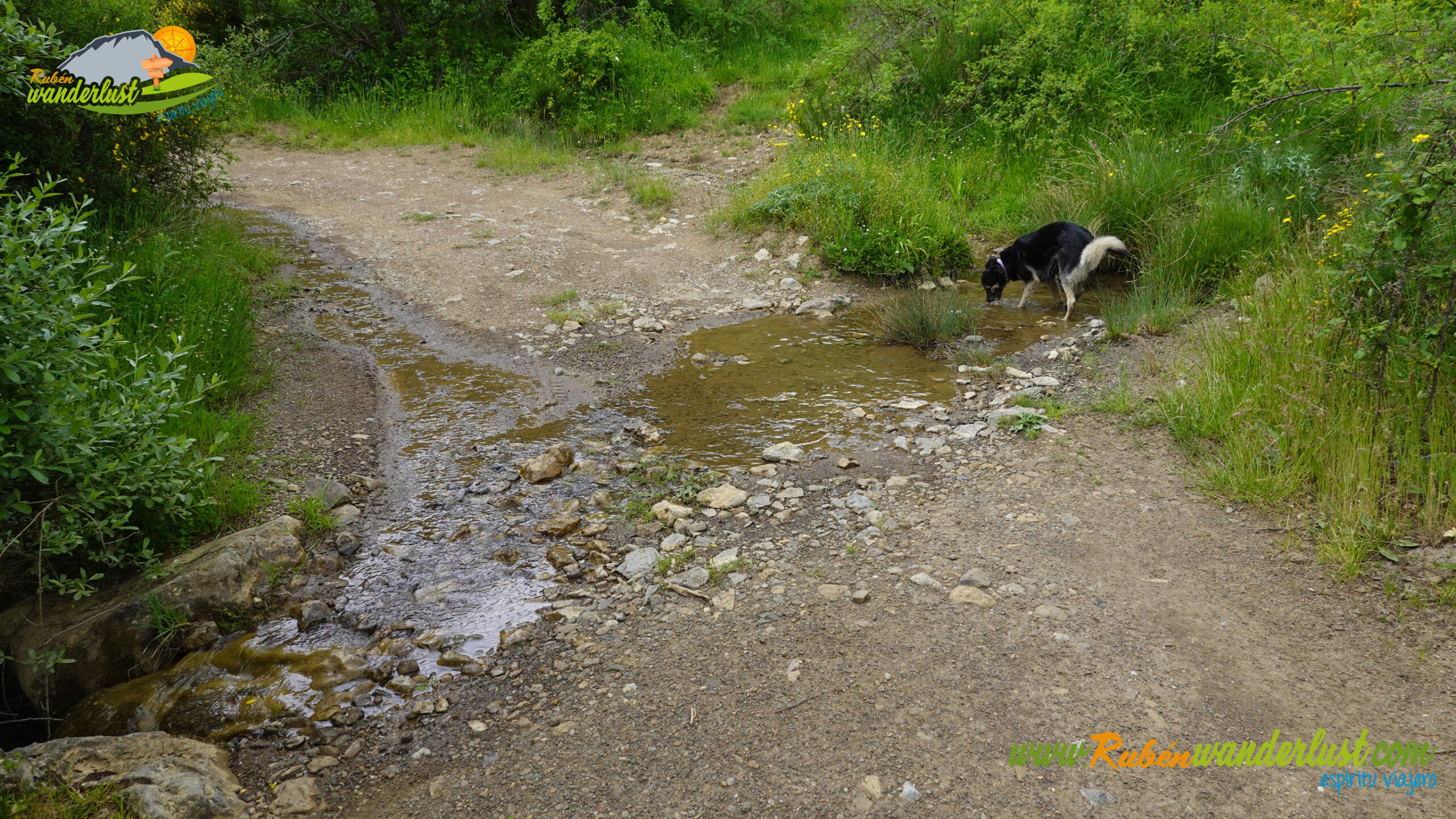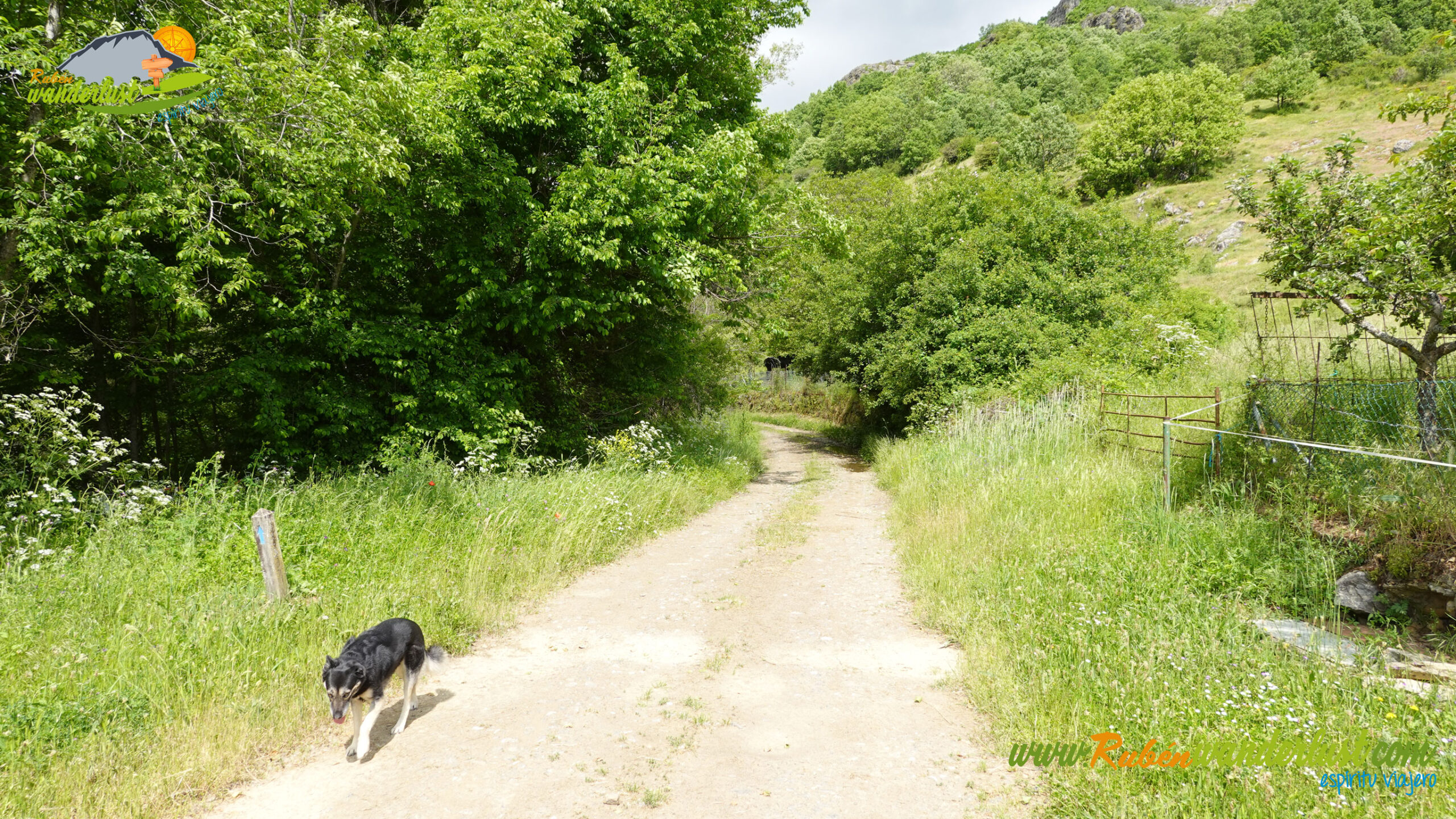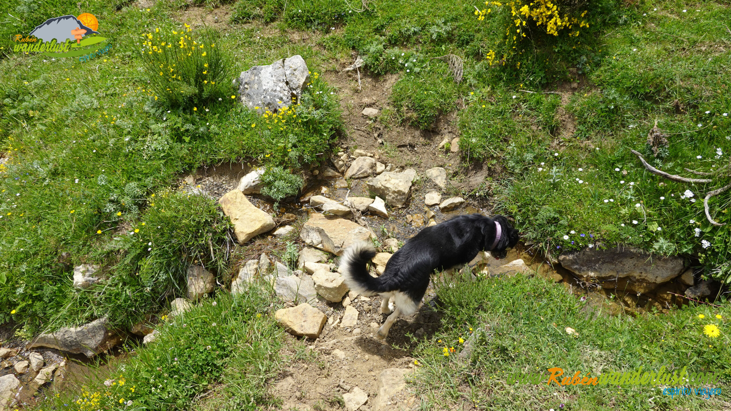 Toca afrontar el resto del descenso, siempre por el Valle del Manaorio, un valle precioso y que se camina perfectamente. Tan sólo un buen grupo de caballos hace que debamos rodear un poco, aunque nada importante. Por el margen izquierdo, según vamos perdiendo altura, se baja muy bien! Tendremos que cruzar el pequeño Arroyo del Manaorio en un par de ocasiones, lugares que Olivia aprovecha para refrescarse!