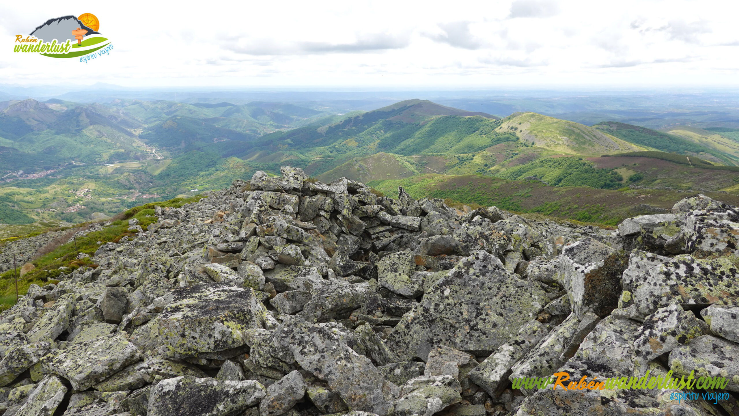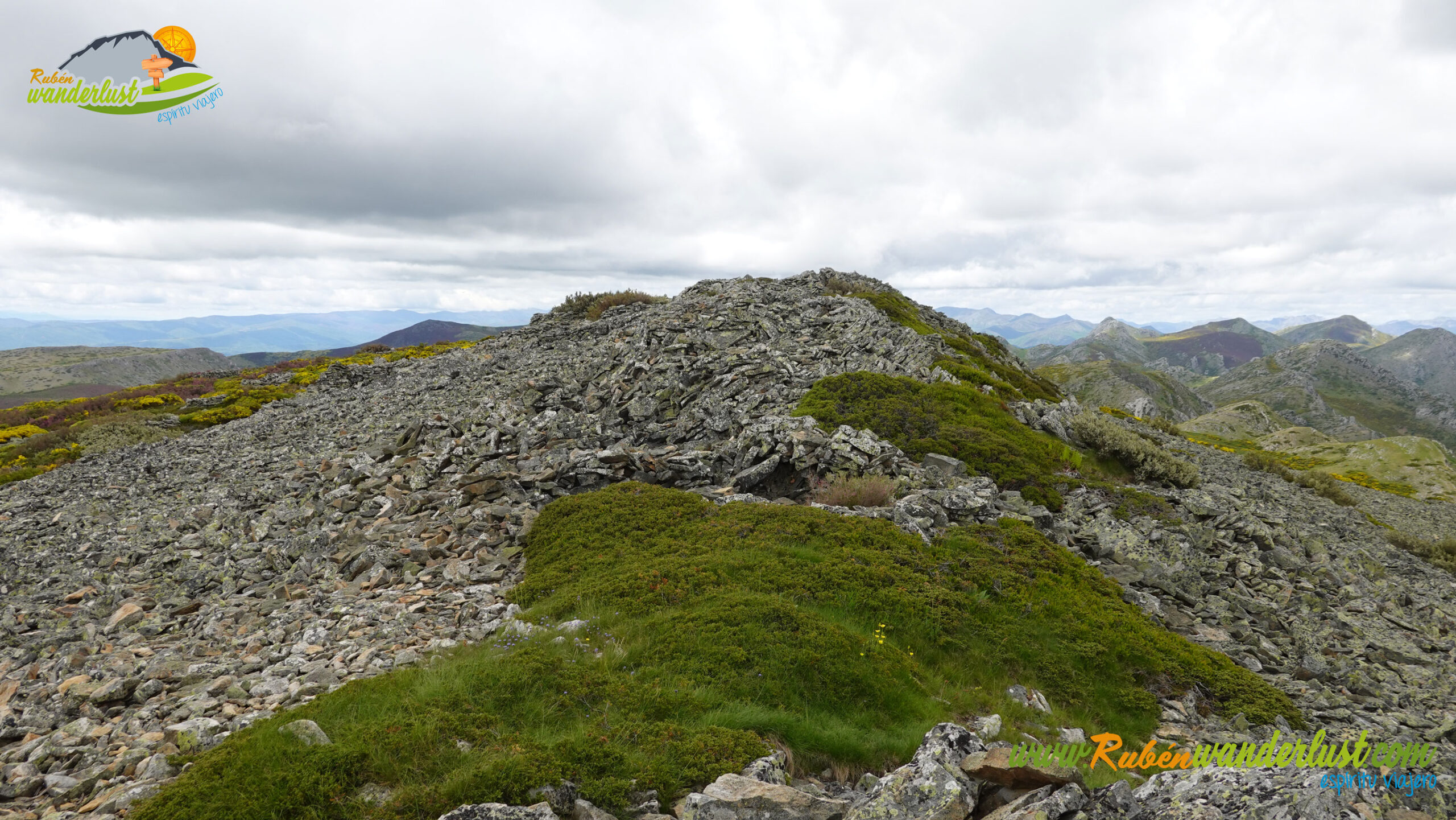 Finalizada la subida, llegamos a la cumbre del Pico Bustillo (1.859 m). Vistas excepcionales y una panorámica que disfrutamos durante un buen rato! Vemos el Pico Amargones, el Pico Santiago, Peña Miezca, el Pico Fontañán, el Cueto San Mateo, el Pico Fontún, el Pico Polvoreda, Las Tres Marías y un sinfín de montañas más de la Cordillera Cantábrica. Unos minutos disfrutando de las vistas y del entorno del Pico Bustillo, donde encontramos una casamata y varias trincheras más!