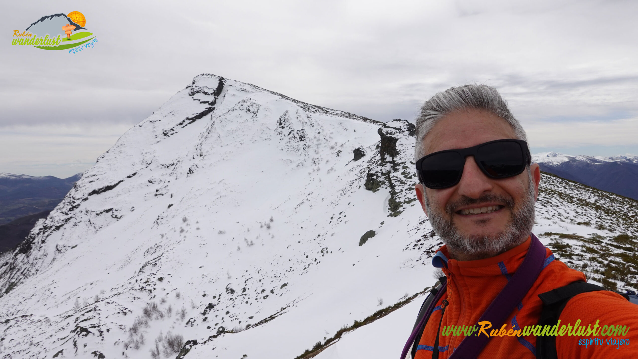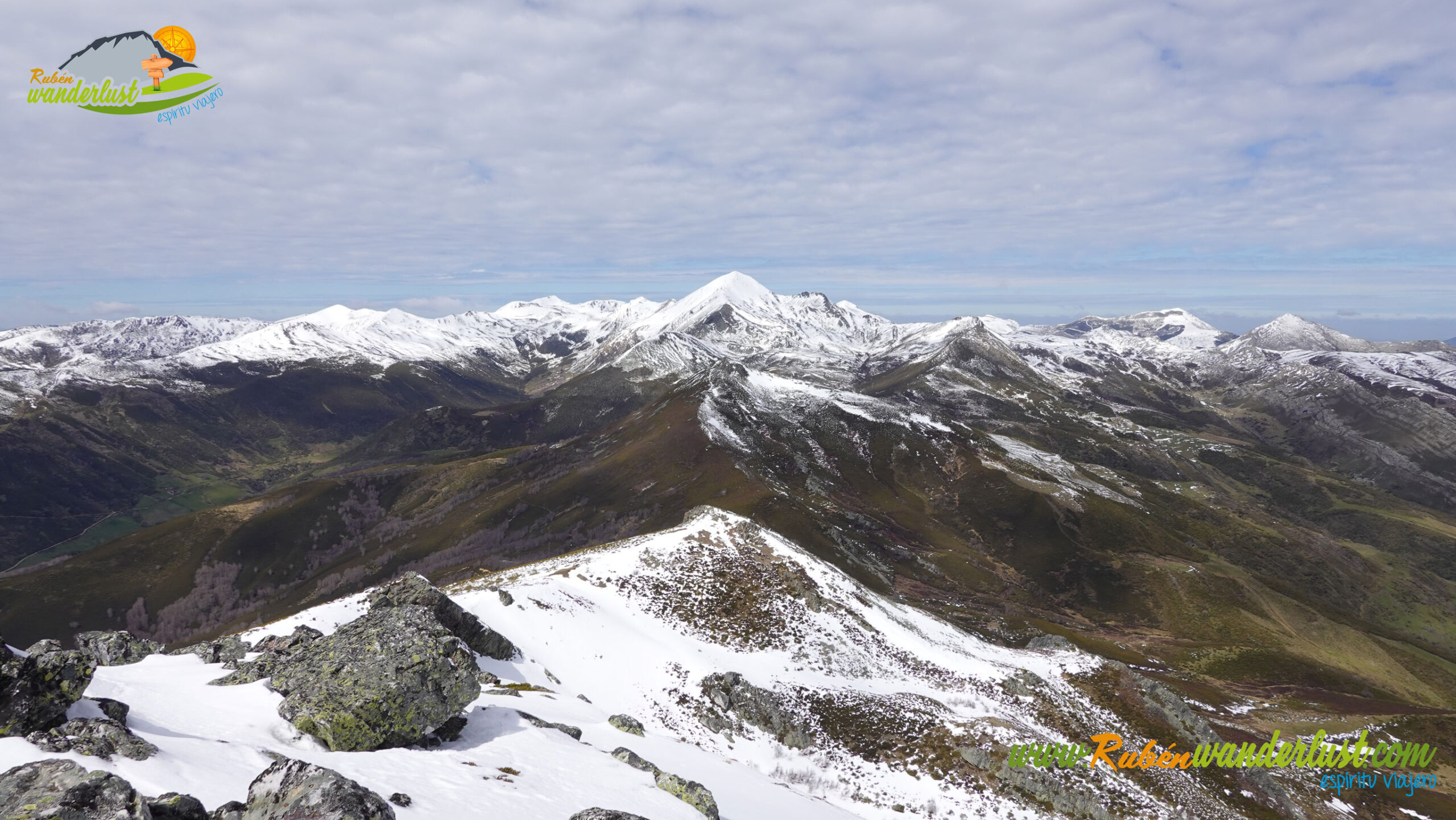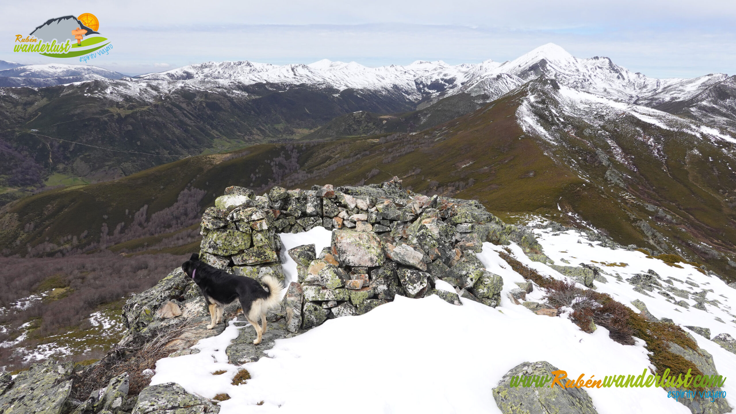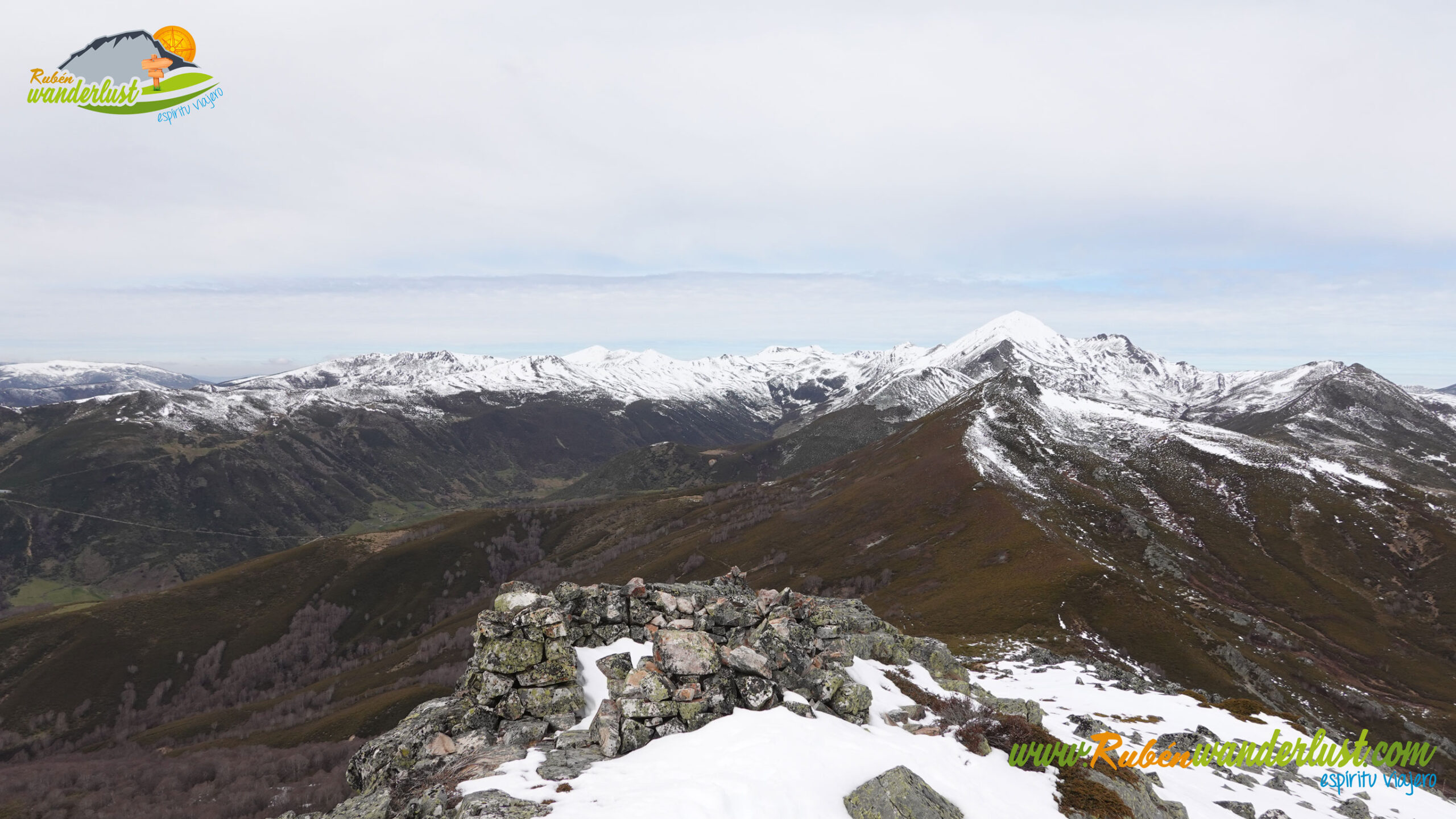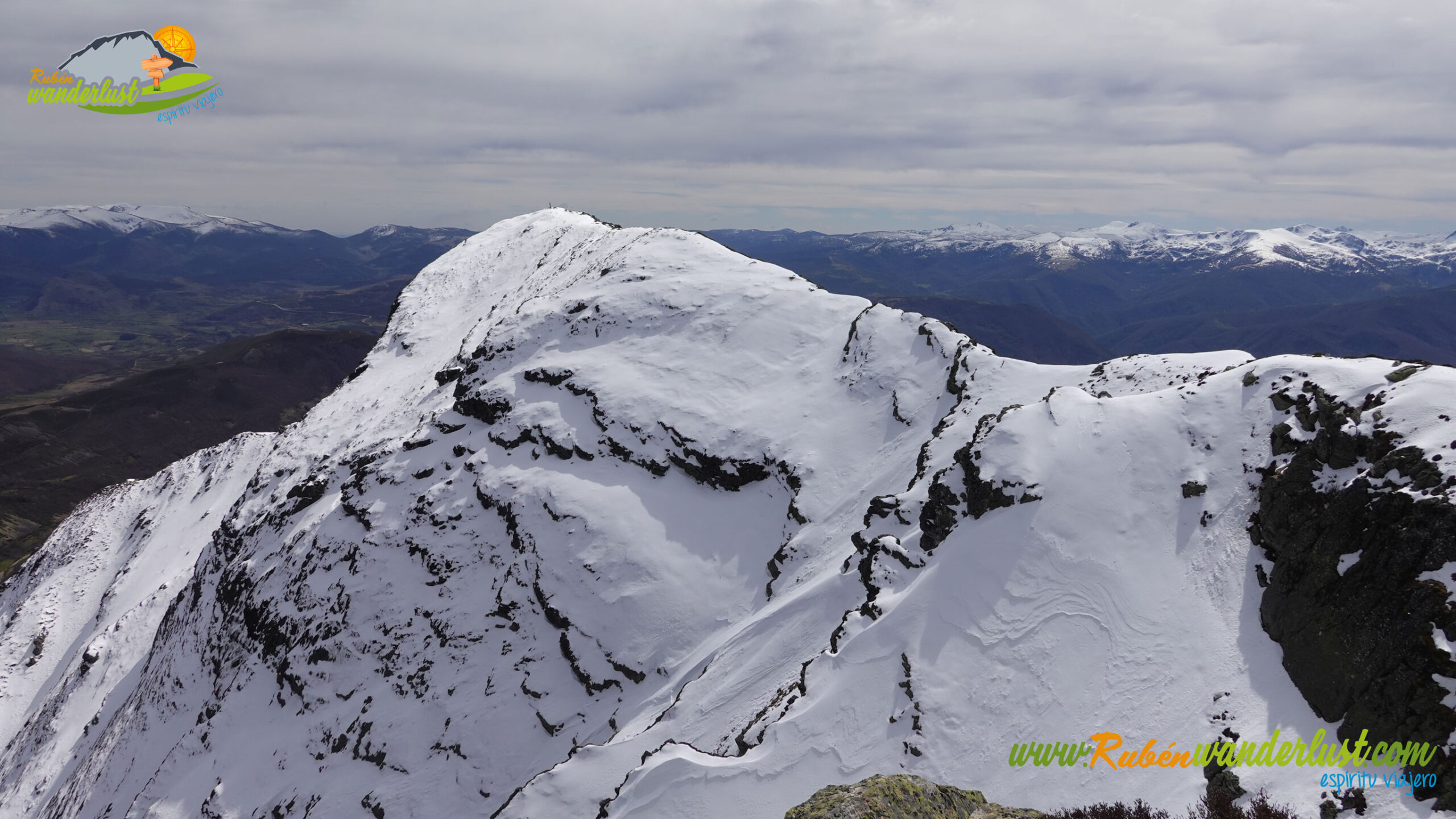 Finalizada la arista noroeste, llegamos a la cima del Pico Muxivén (2.027 m). Desde aquí obtenemos unas vistas espectaculares! Divisamos gran parte de las montañas de Laciana, los Ancares Leoneses, la Sierra de Gistredo, la Sierra de Villabandín, las montañas de Babia y un sinfín de montañas más a nuestro alrededor. El aire es muy frío y no nos permite estar mucho tiempo en la cumbre, pero lo suficiente para disfrutar del logro conseguido! Llegar al Pico Muxivén es algo espectacular!