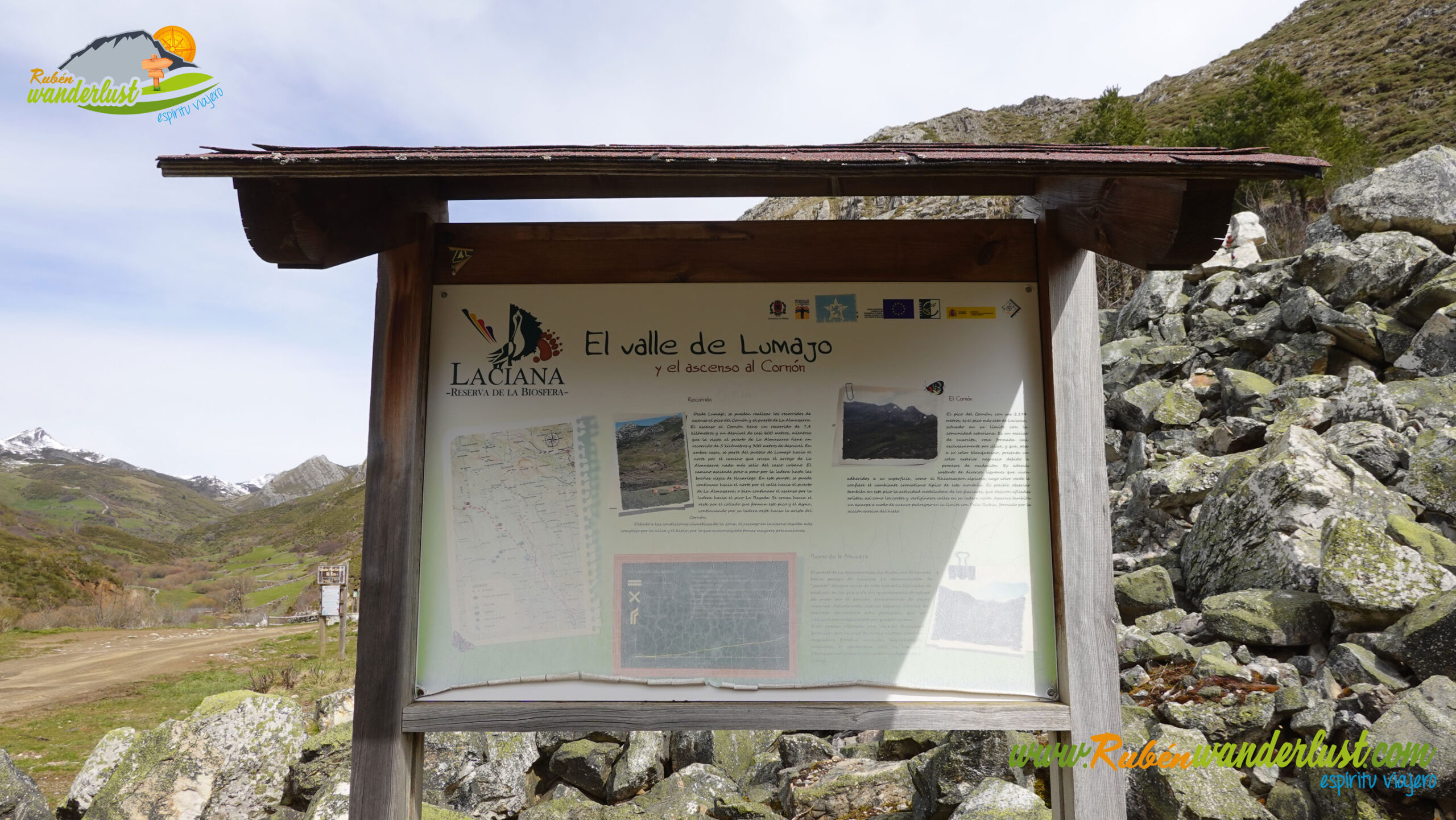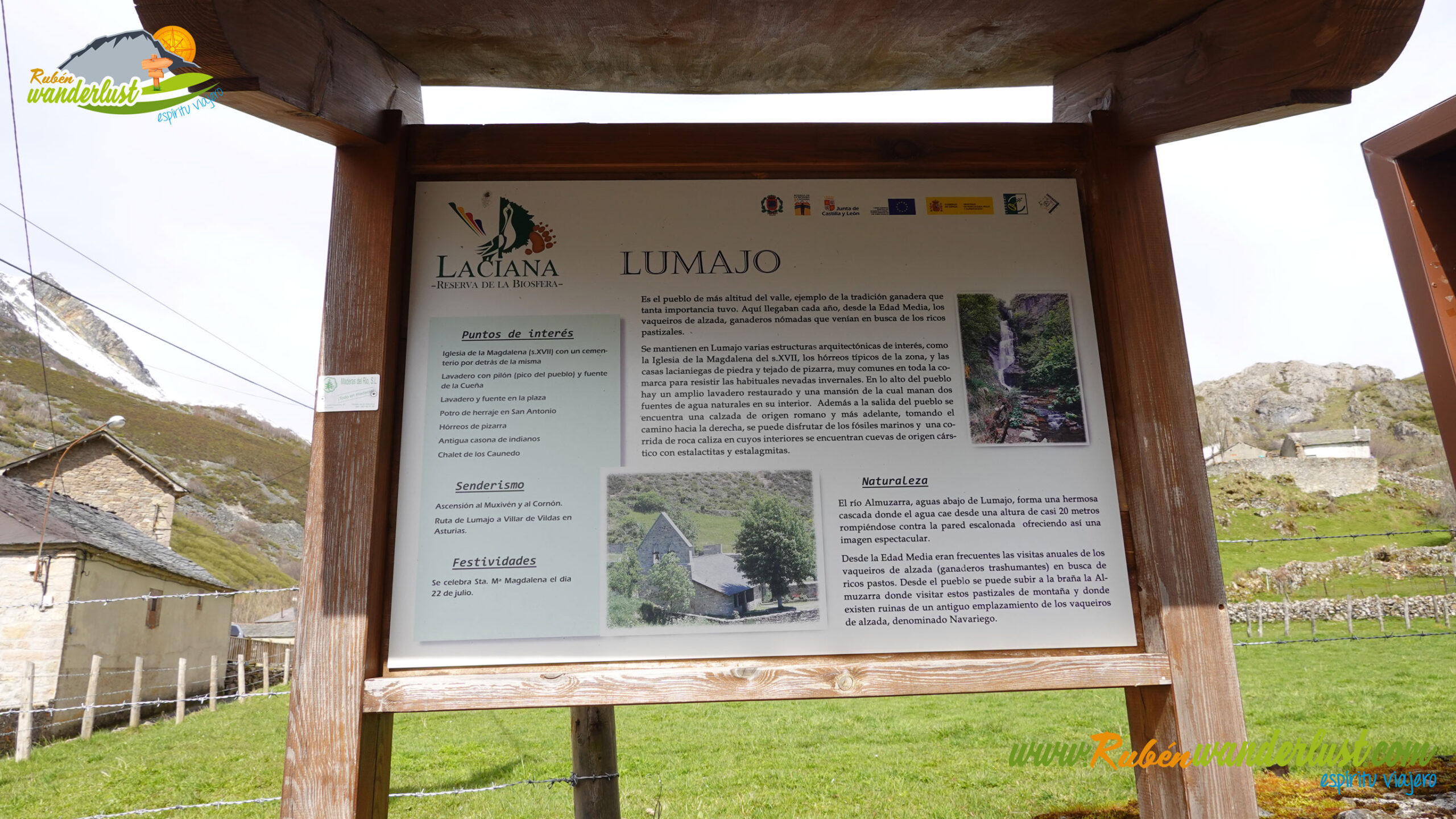 Antes de iniciar la ruta, preparamos la mochila con todo tipo de material invernal, pues no sabemos qué tipo de nieve nos vamos a encontrar. Comenzamos a caminar recorriendo el pueblo de Lumajo, ya con vistas al Pico Muxivén, nuestro principal objetivo del día. Dejamos atrás un cartel informativo y una fuente perfecta para recargar agua. Al final del pueblo, otro cartel informativo sobre la zona nos da más información.
