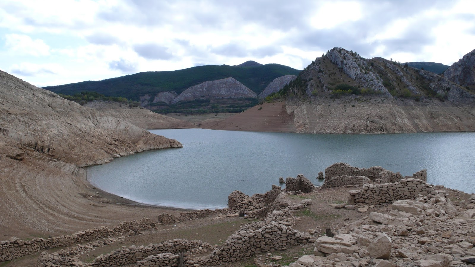 Comenzamos en ligero descenso hasta llegar al comienzo del antiguo pueblo, ahora sumergido la mayor parte del año. Aquí mismo, un pequeño desvío nos guiará hacia la derecha para adentrarnos en las ruinas del antiguo pueblo, visible gran parte de la temporada estival.