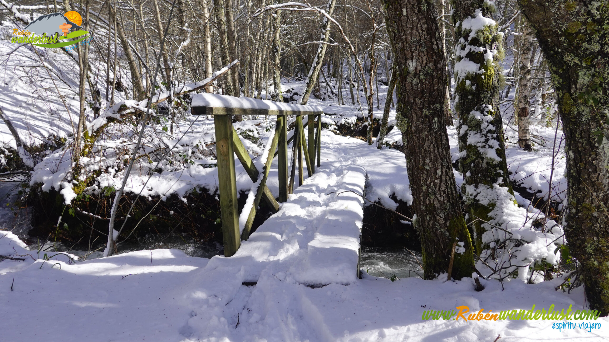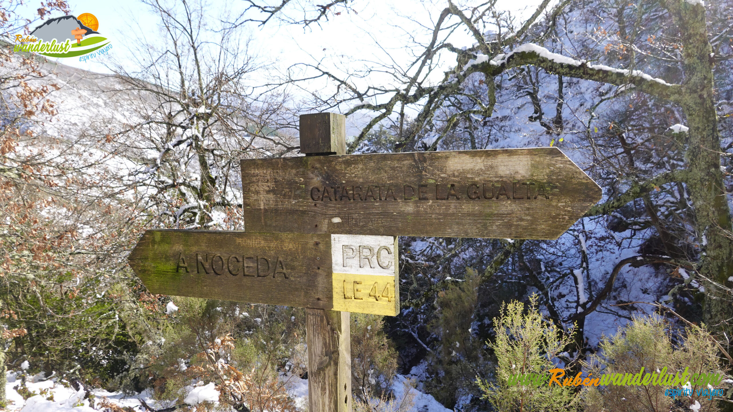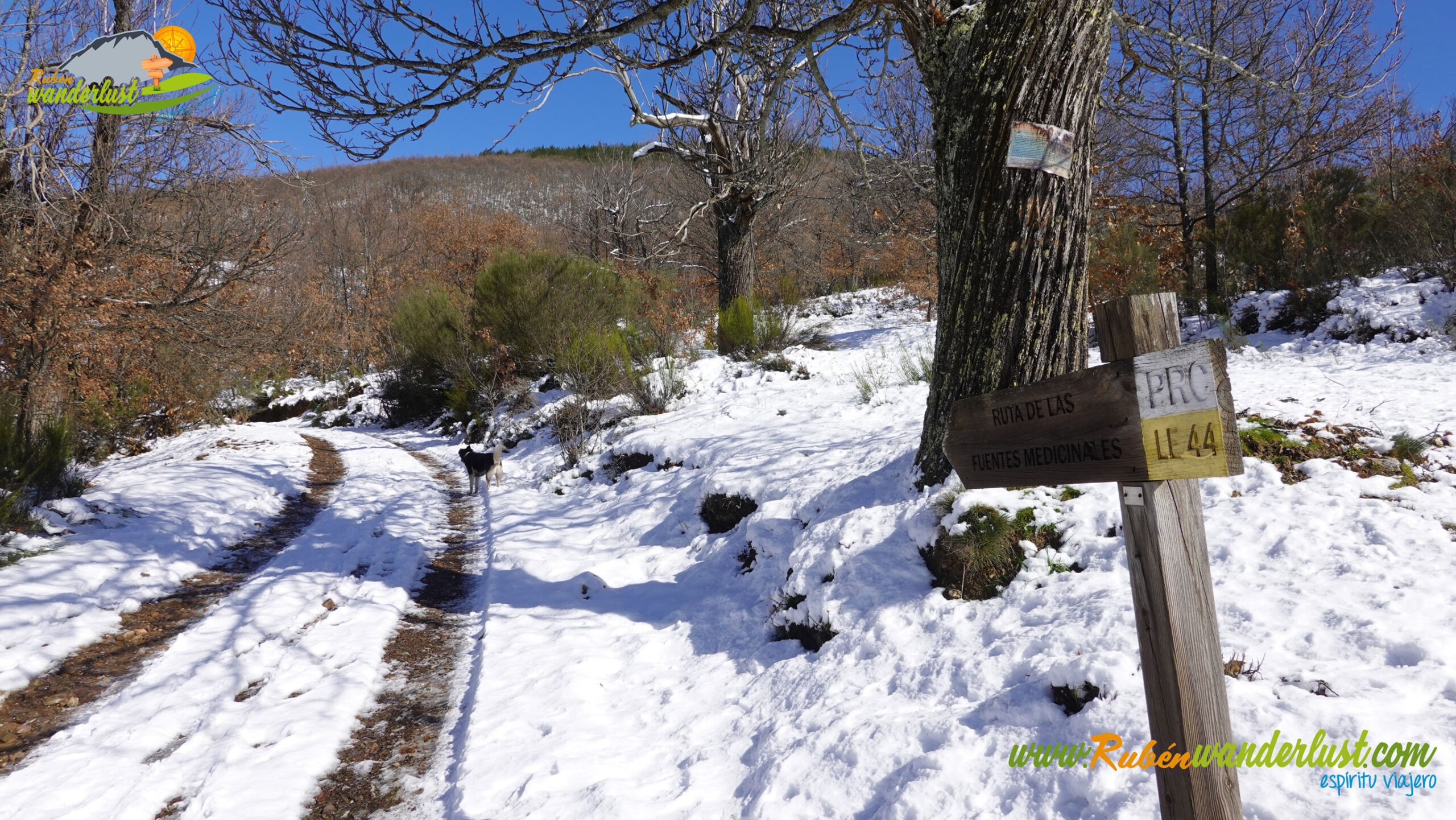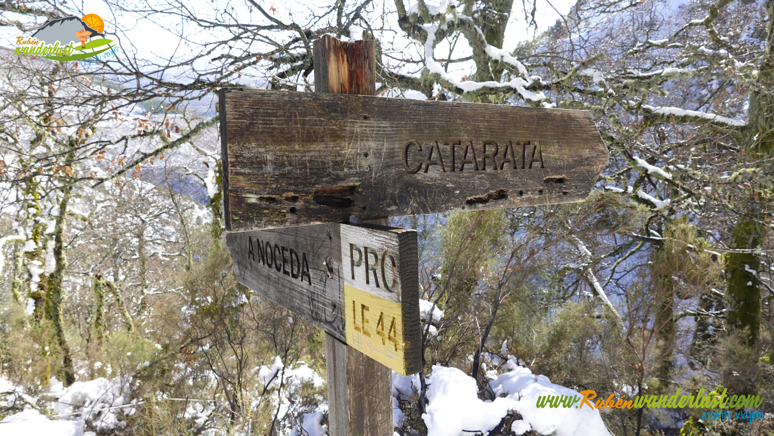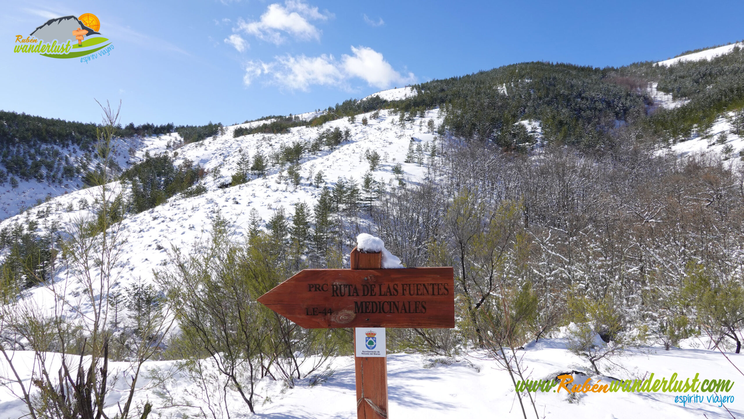 Con nieve recién caída durante la última noche, nos preparamos para afrontar un recorrido que promete! Bien equipados con polainas y ropa de invierno, iniciamos la marcha cruzando un puente sobre el Río Noceda y dejando atrás una fuente. Pronto llegamos al cartel informativo sobre la ruta que nos ocupa, así que echamos un ojo a lo que nos espera, que es mucho! Nos desviamos hacia la izquierda, hacia el norte!