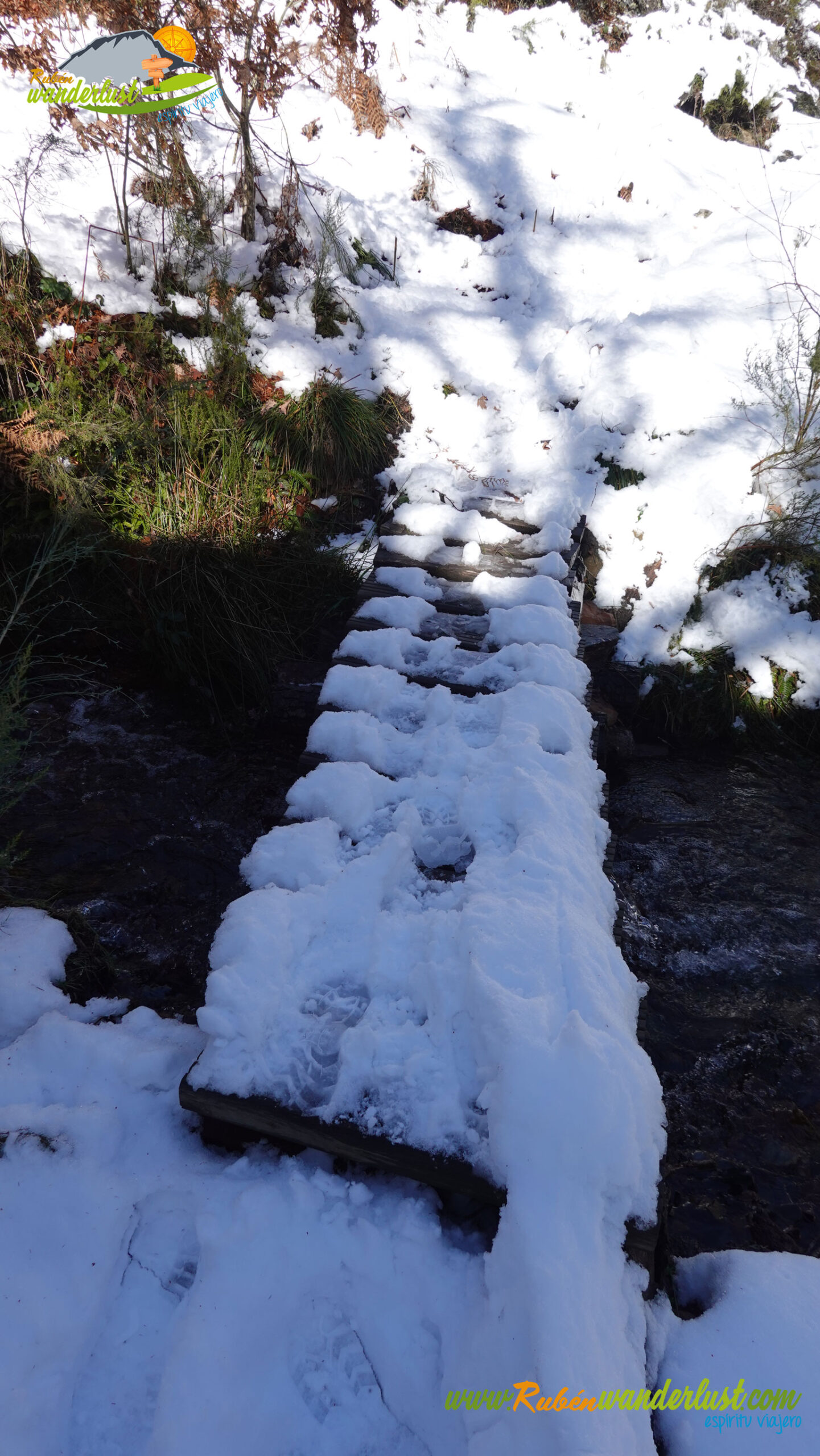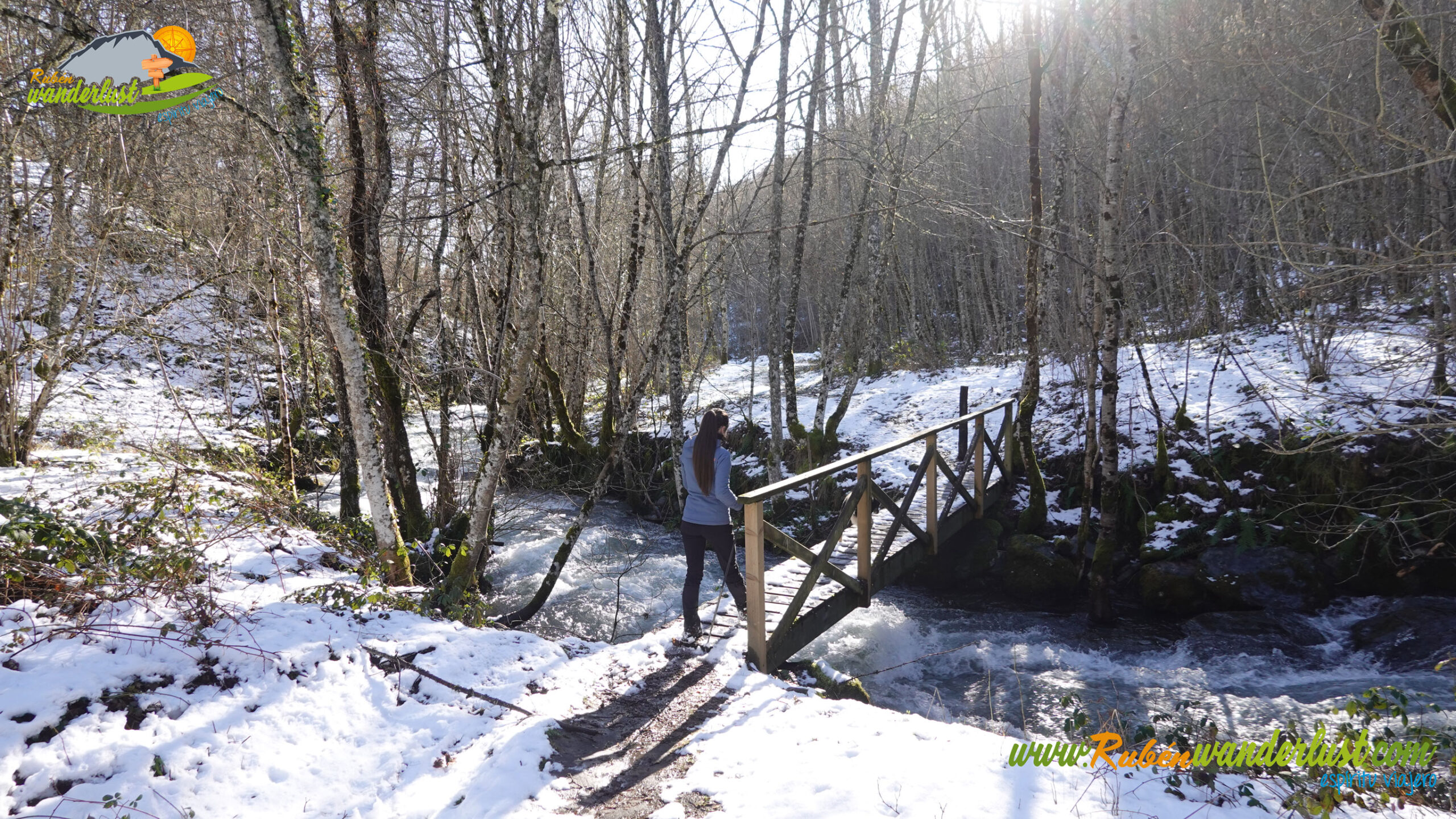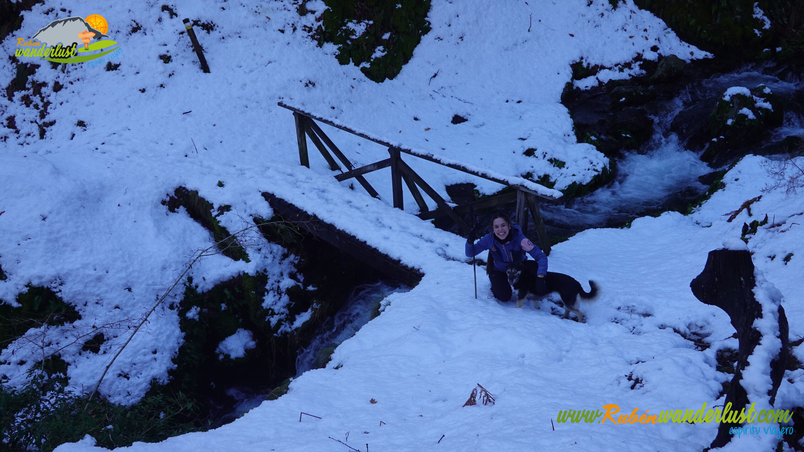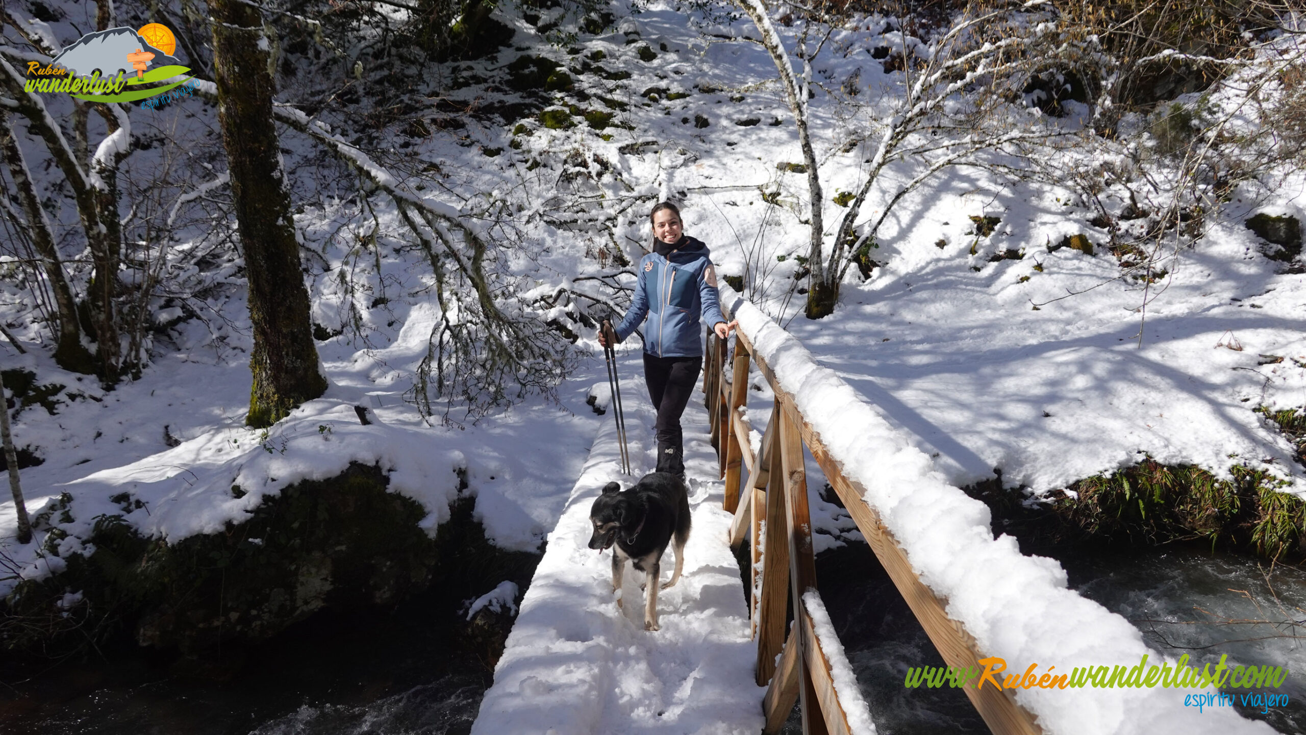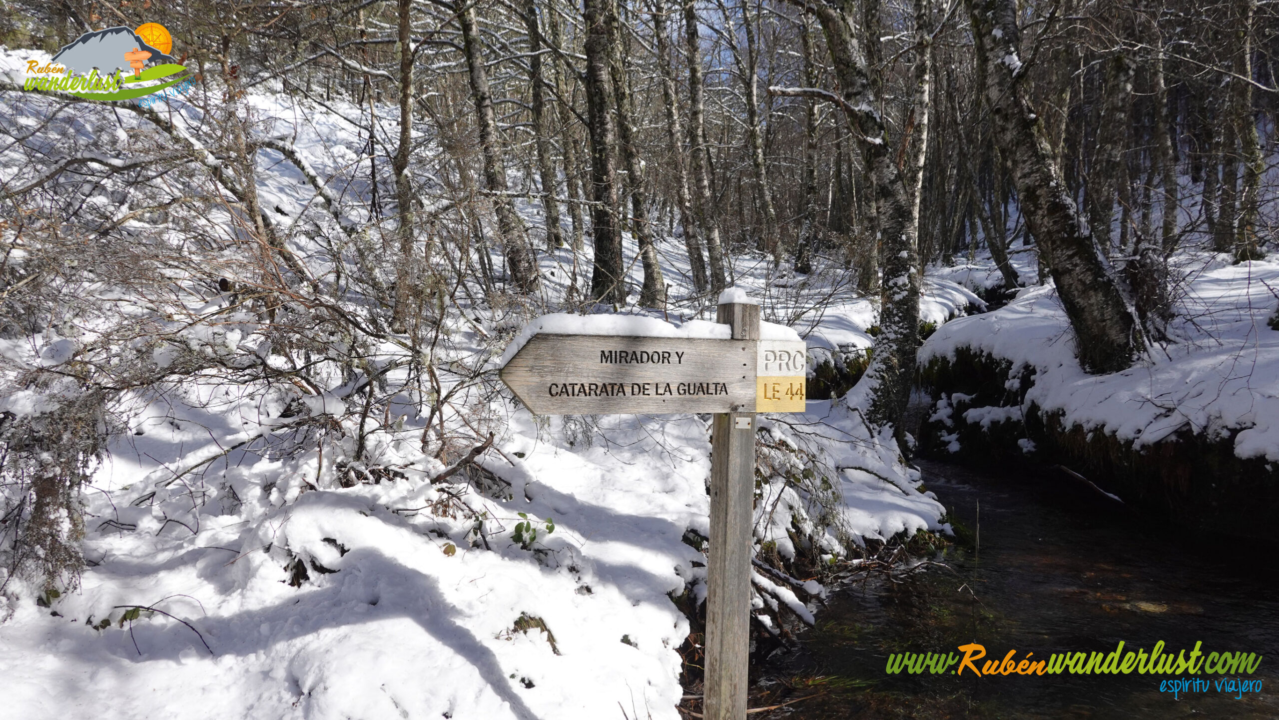 Con nieve recién caída durante la última noche, nos preparamos para afrontar un recorrido que promete! Bien equipados con polainas y ropa de invierno, iniciamos la marcha cruzando un puente sobre el Río Noceda y dejando atrás una fuente. Pronto llegamos al cartel informativo sobre la ruta que nos ocupa, así que echamos un ojo a lo que nos espera, que es mucho! Nos desviamos hacia la izquierda, hacia el norte!