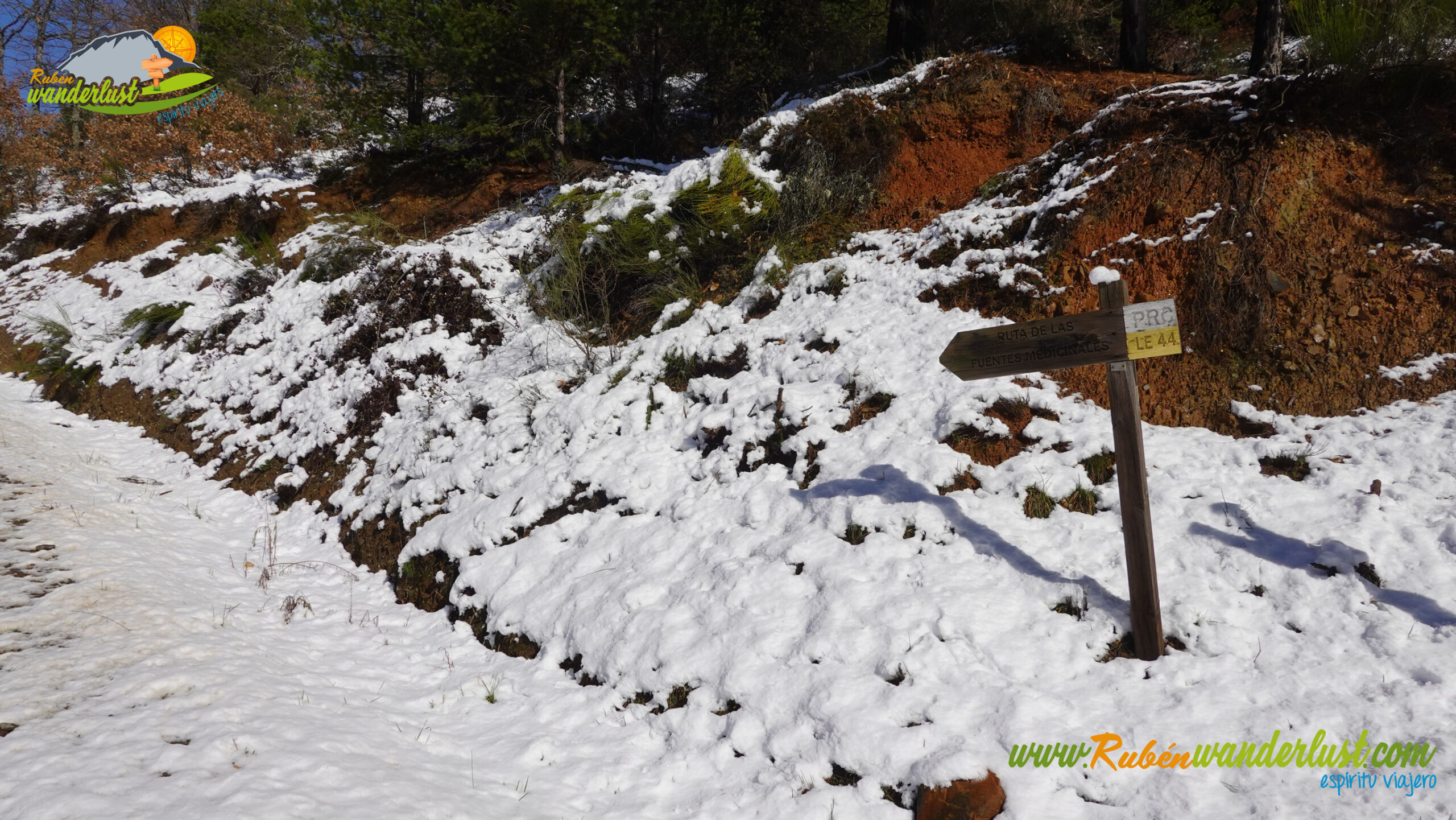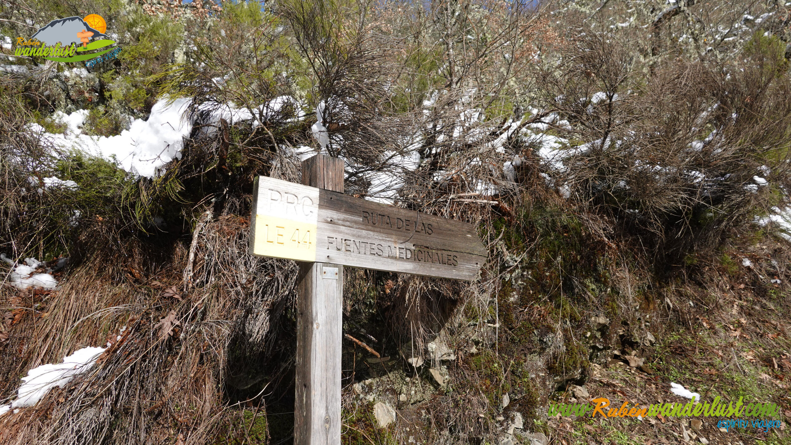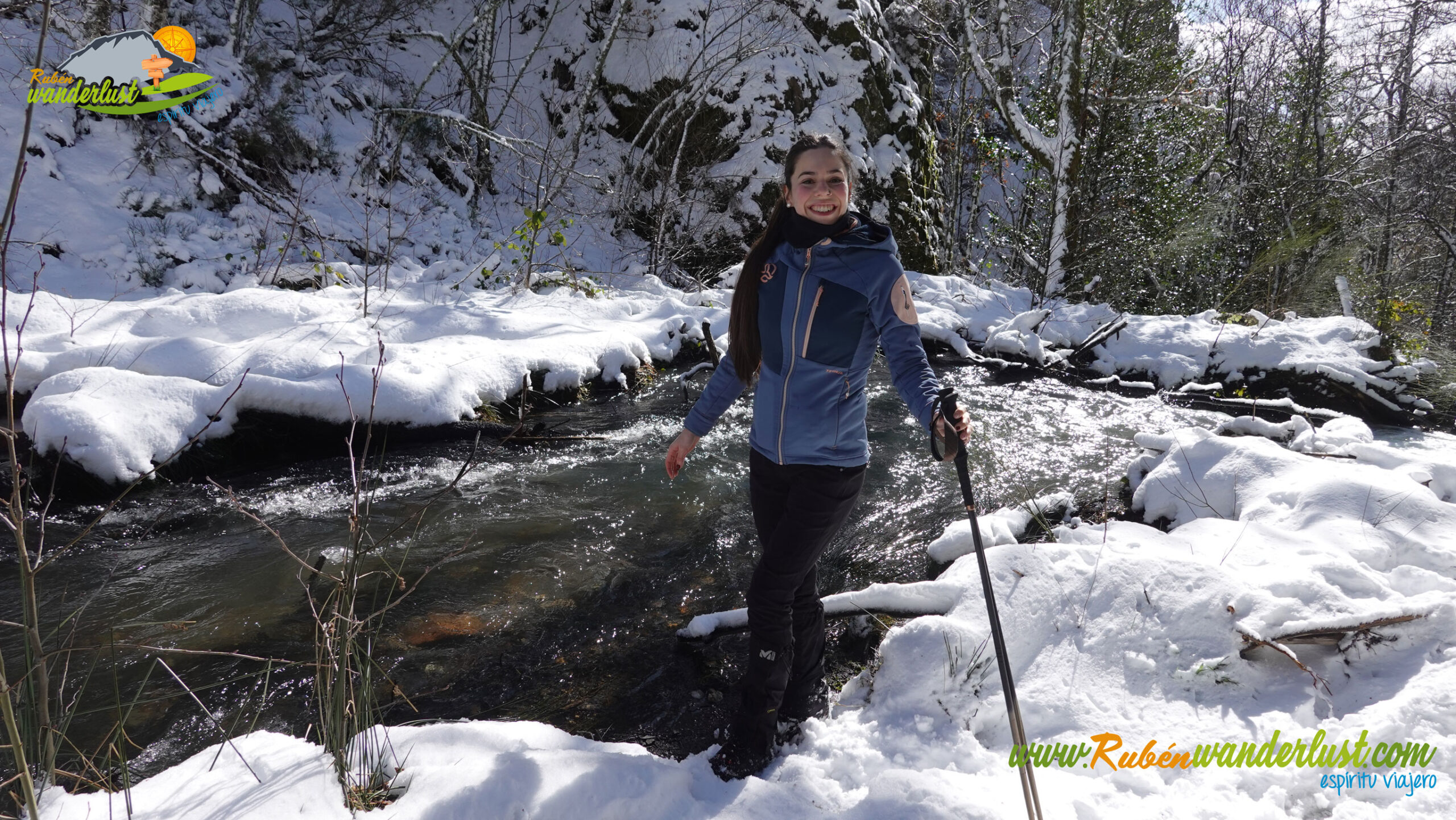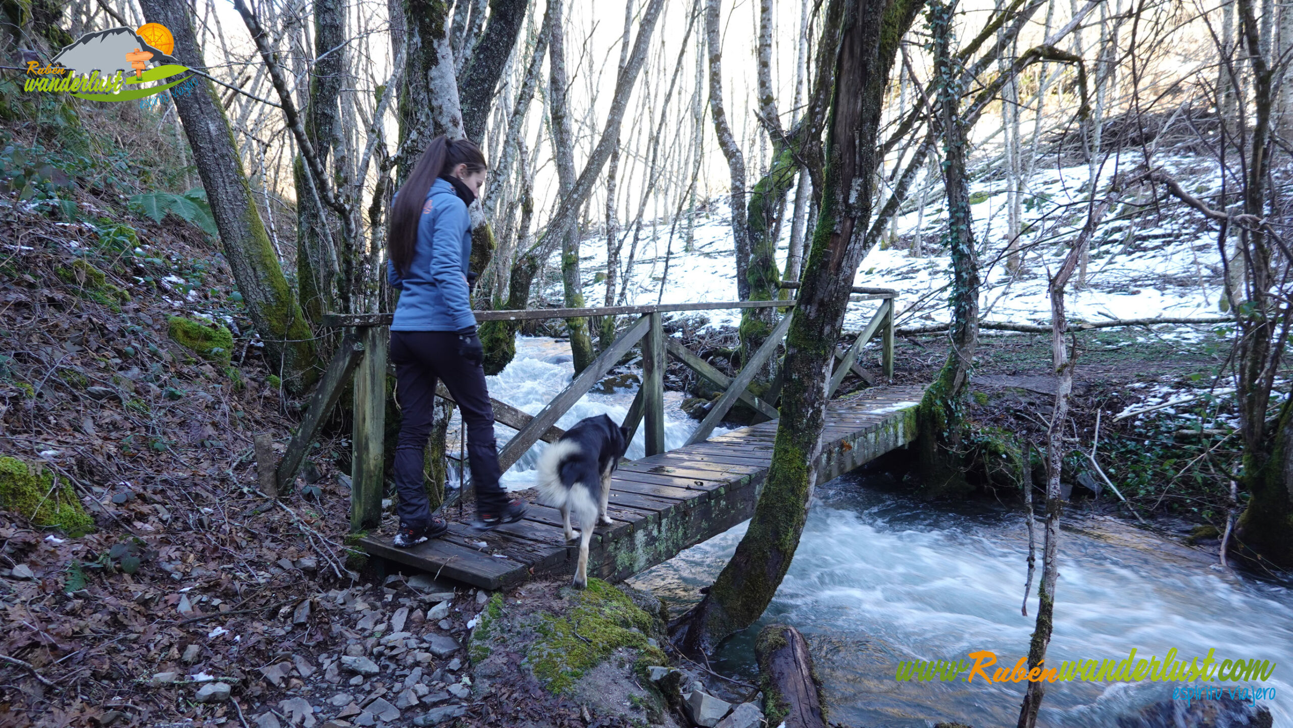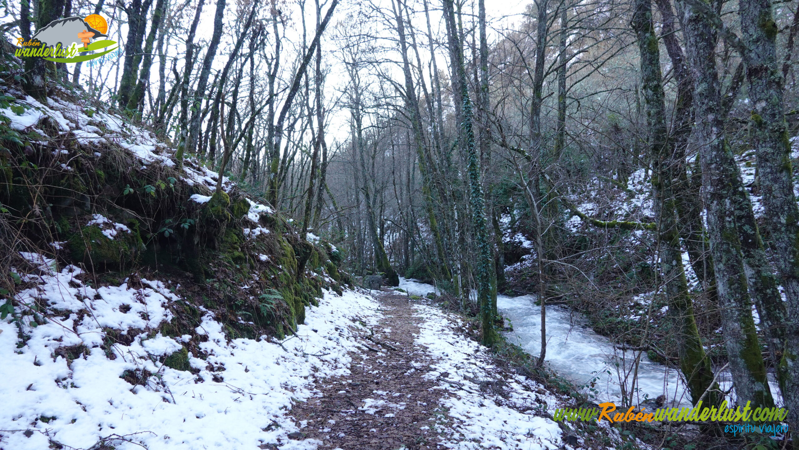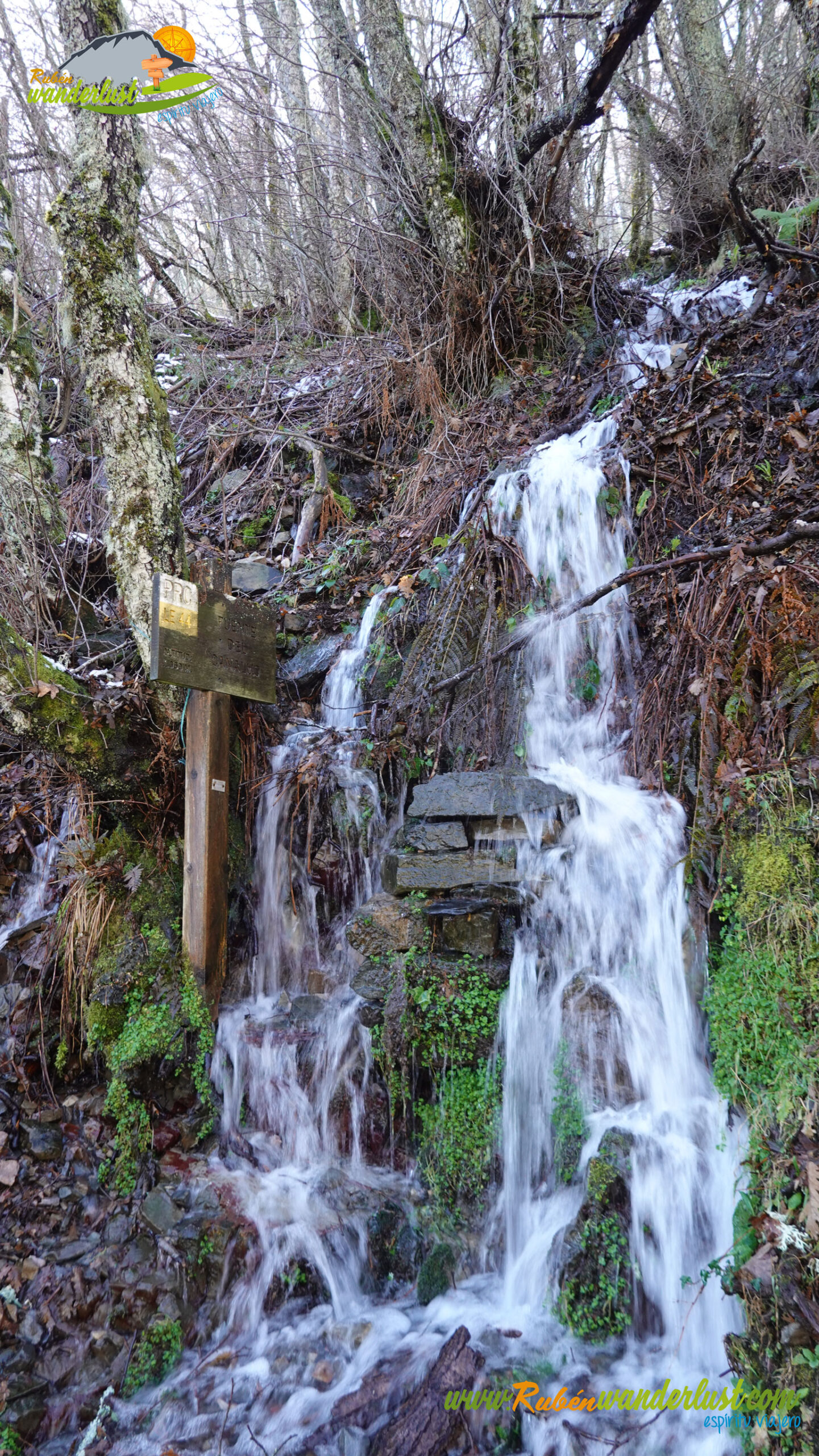 Con nieve recién caída durante la última noche, nos preparamos para afrontar un recorrido que promete! Bien equipados con polainas y ropa de invierno, iniciamos la marcha cruzando un puente sobre el Río Noceda y dejando atrás una fuente. Pronto llegamos al cartel informativo sobre la ruta que nos ocupa, así que echamos un ojo a lo que nos espera, que es mucho! Nos desviamos hacia la izquierda, hacia el norte!