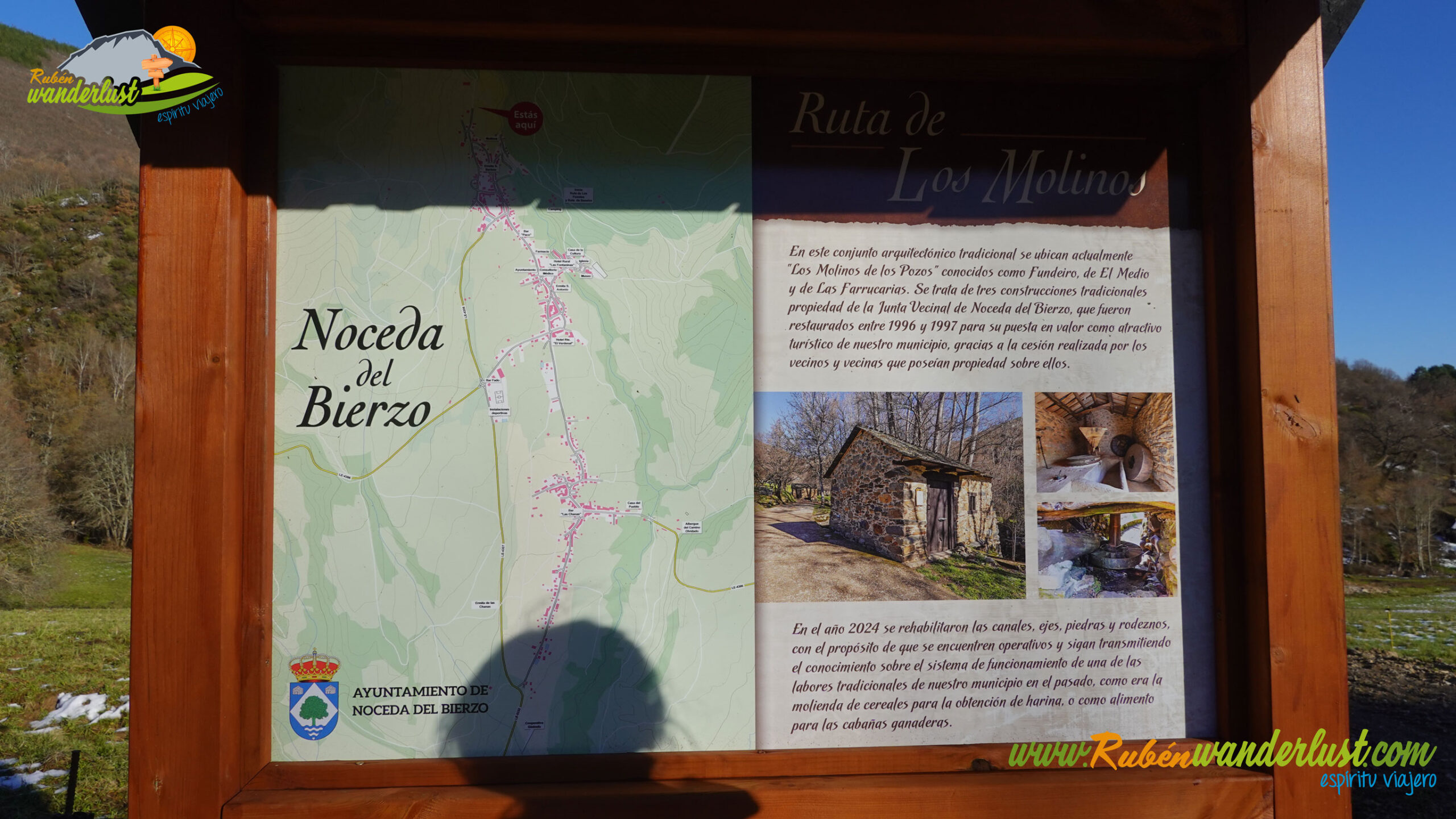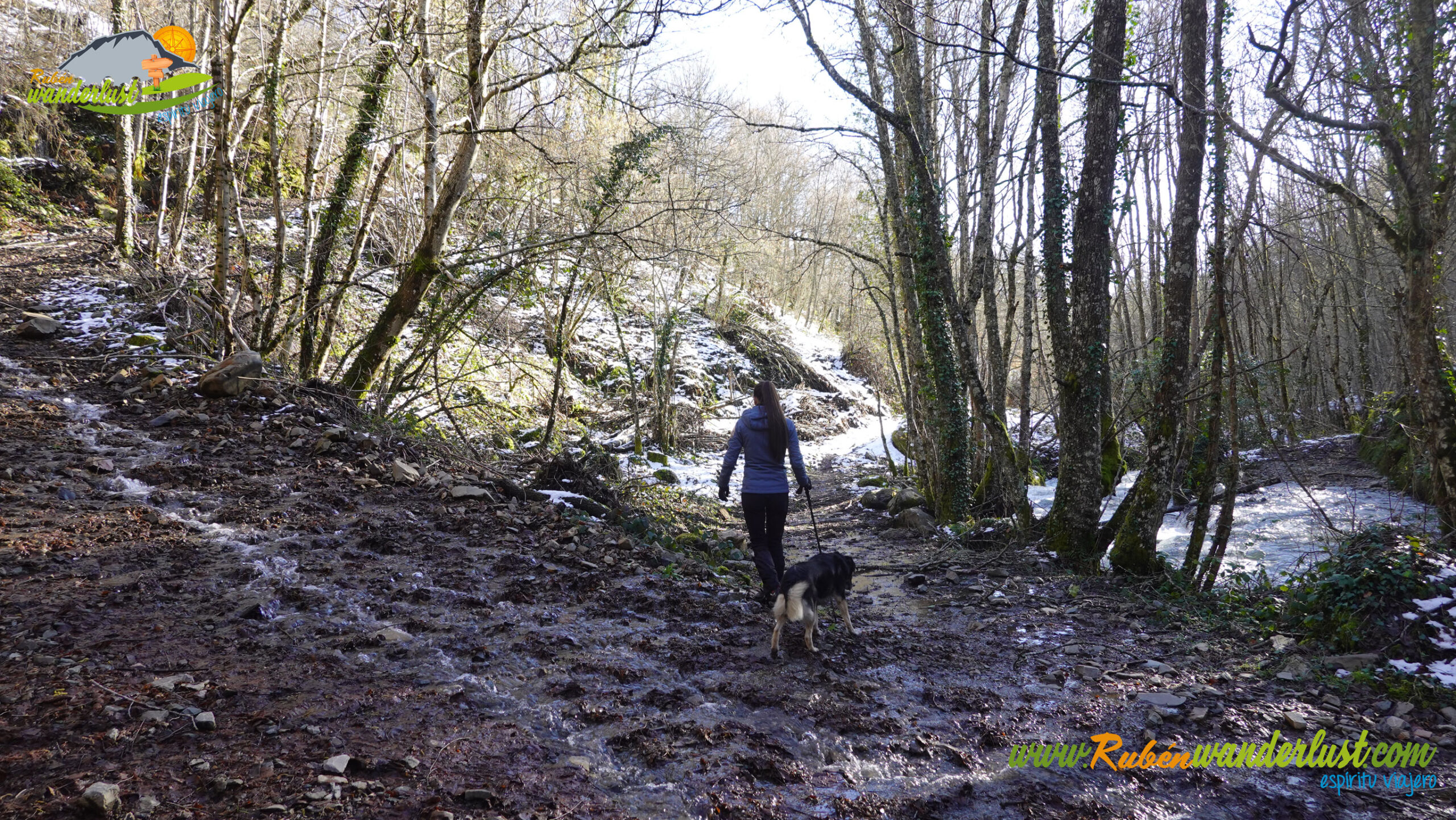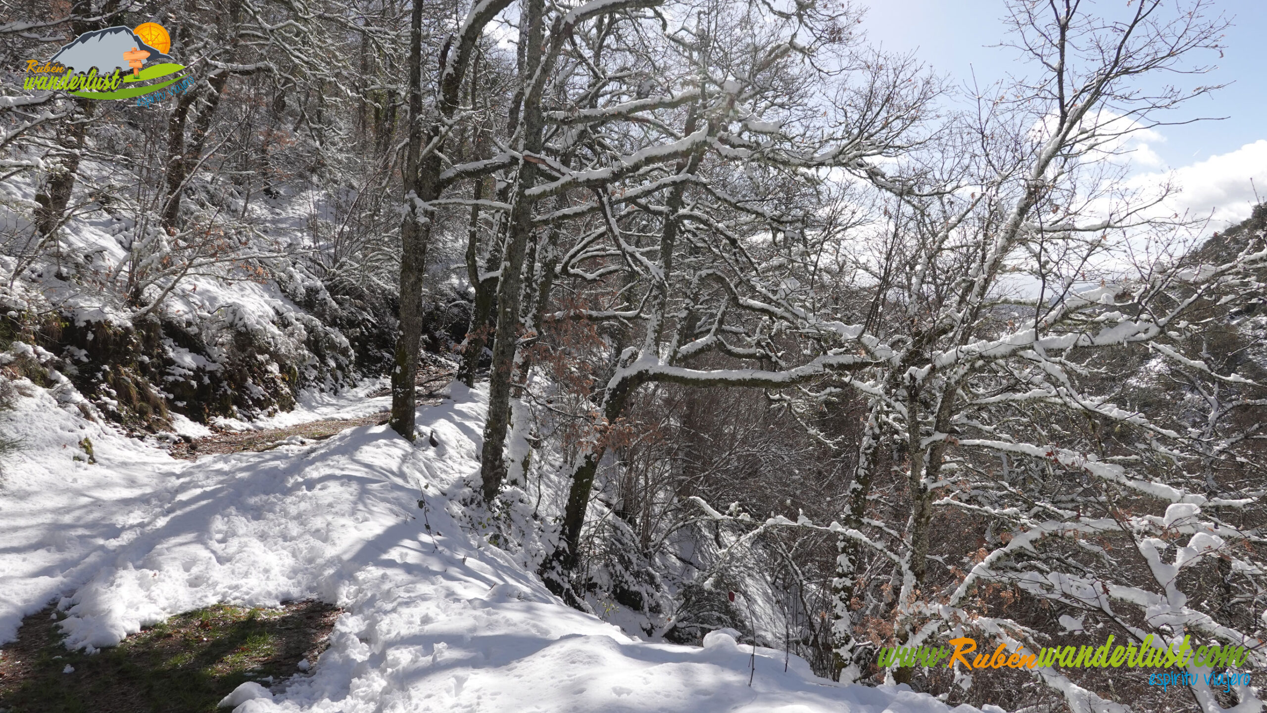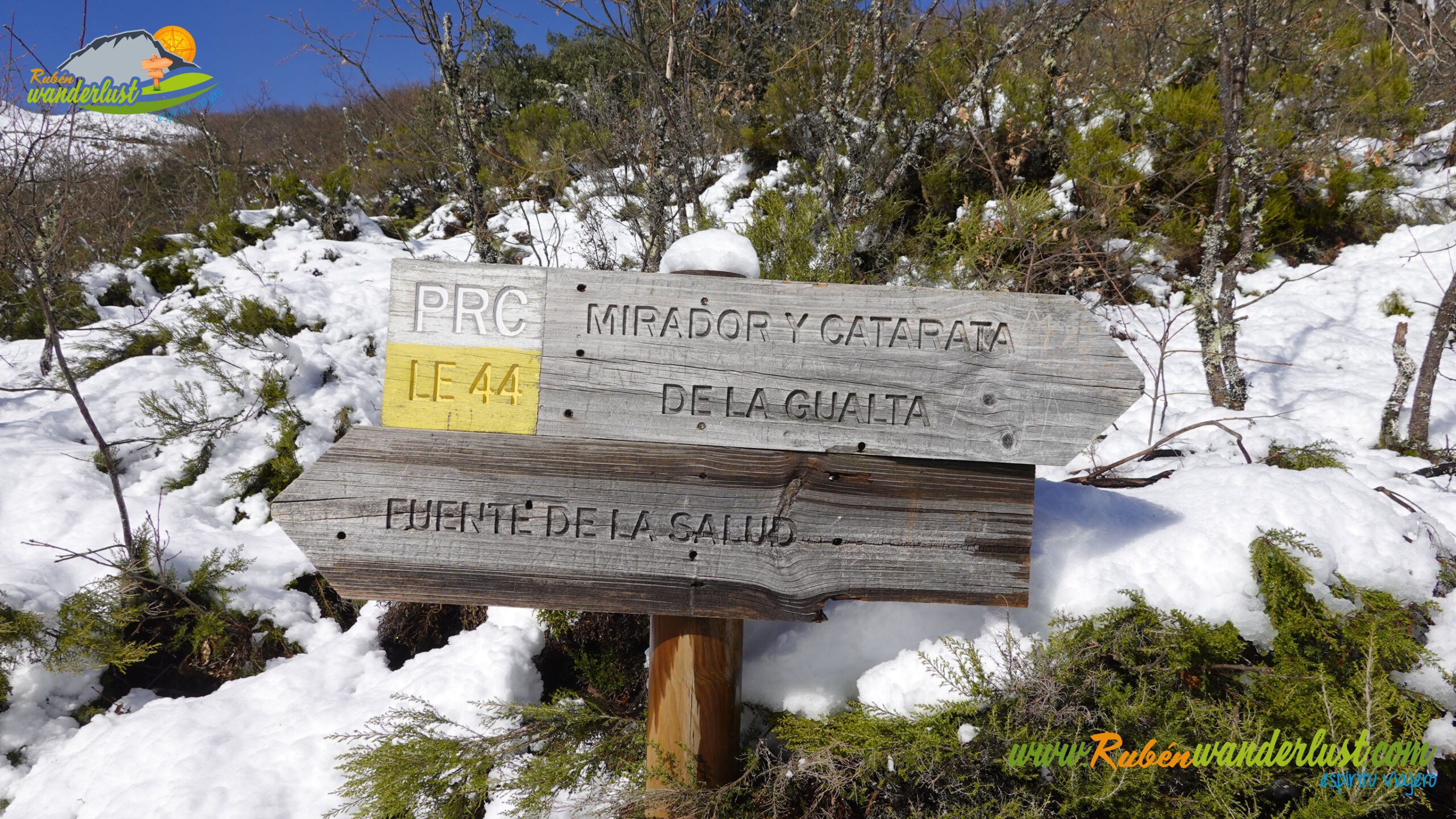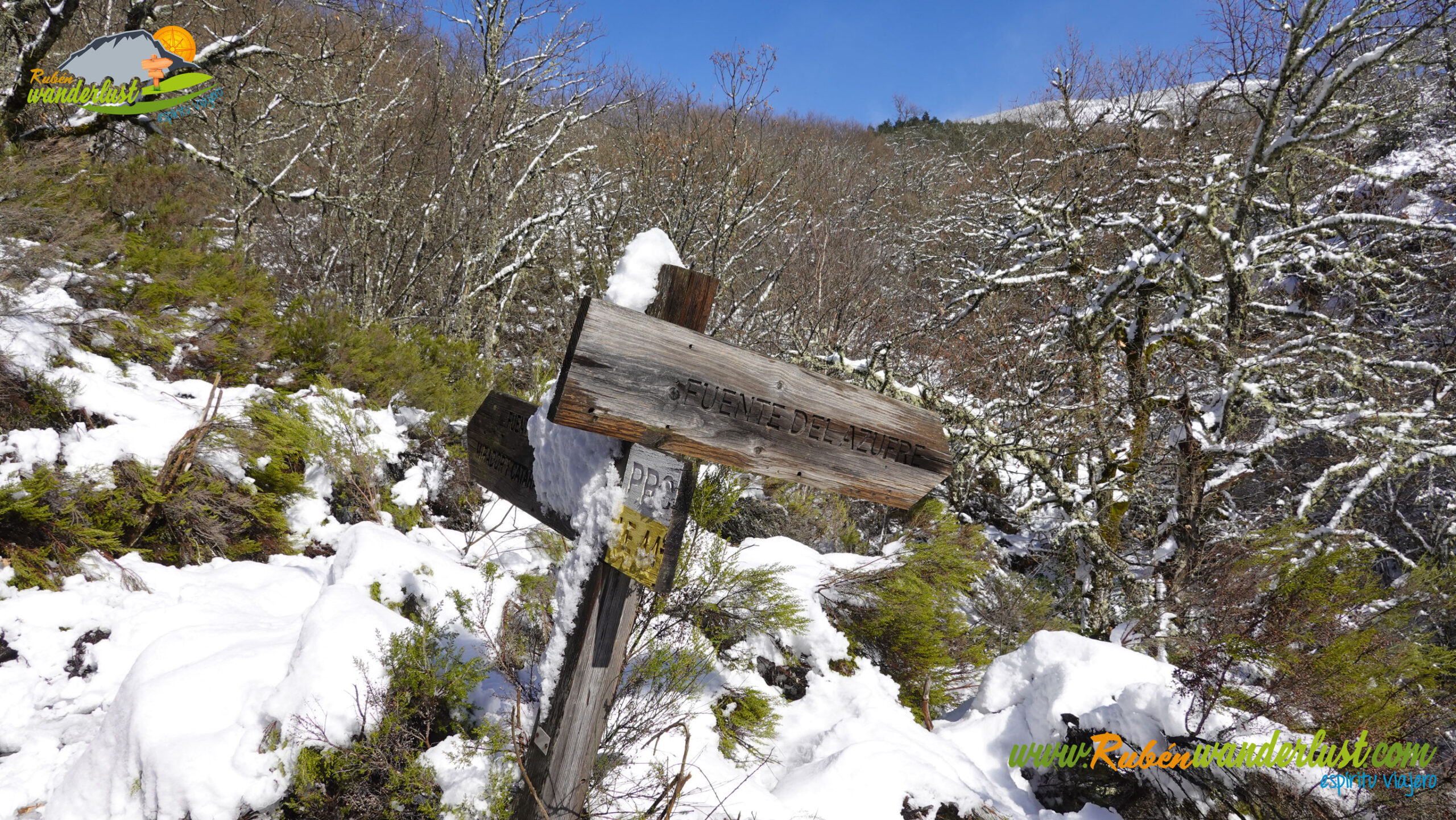 Con nieve recién caída durante la última noche, nos preparamos para afrontar un recorrido que promete! Bien equipados con polainas y ropa de invierno, iniciamos la marcha cruzando un puente sobre el Río Noceda y dejando atrás una fuente. Pronto llegamos al cartel informativo sobre la ruta que nos ocupa, así que echamos un ojo a lo que nos espera, que es mucho! Nos desviamos hacia la izquierda, hacia el norte!