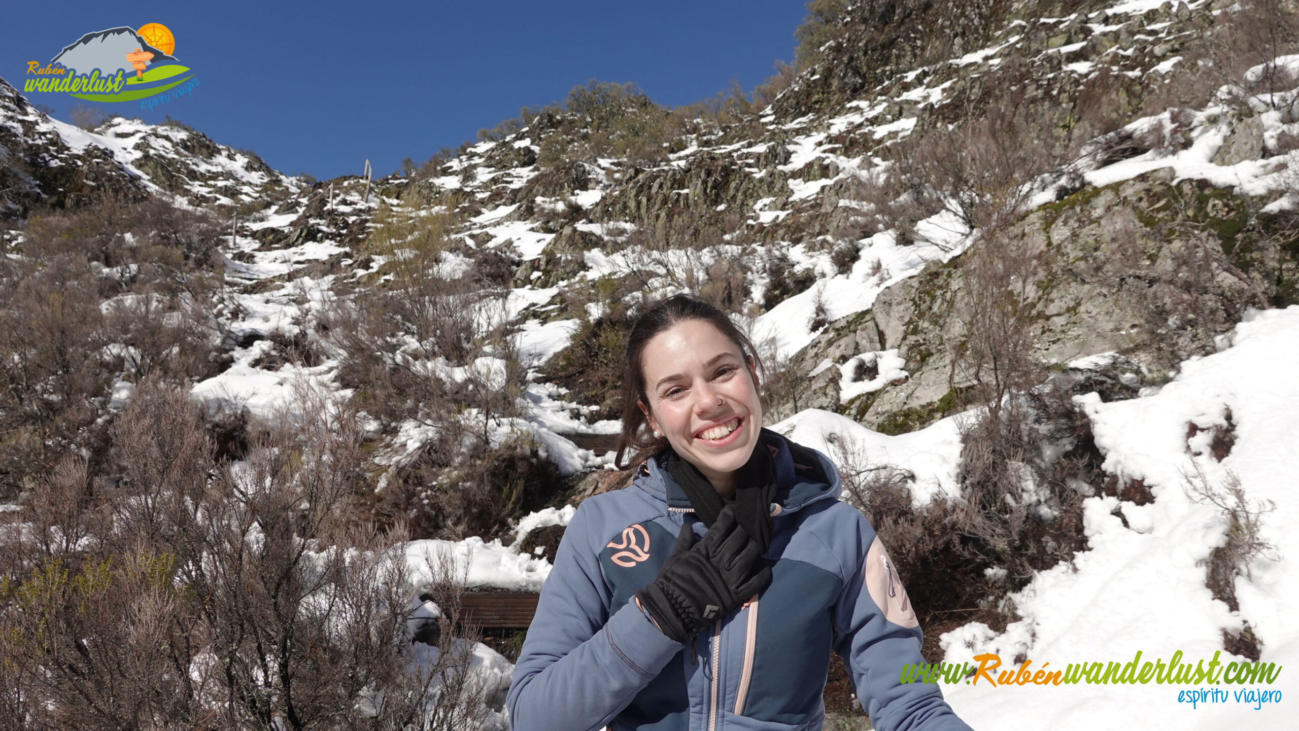 Volvemos a cruzar el Río Noceda a través de un bonito puente de madera y nos desviamos a la izquierda para ir abandonando el valle. De nuevo caminamos por una ancha senda y sin complicaciones, ahora a media ladera y disfrutando de unas vistas sobre el valle preciosas! Hay bastante nieve, pero las rodadas de algún vehículo nos facilitan el esfuerzo! Vemos otra bonita cascada! Andrea no duda en disfrutar de la nieve recién caída, dejándose caer y dejando su silueta a vista de pájaro!