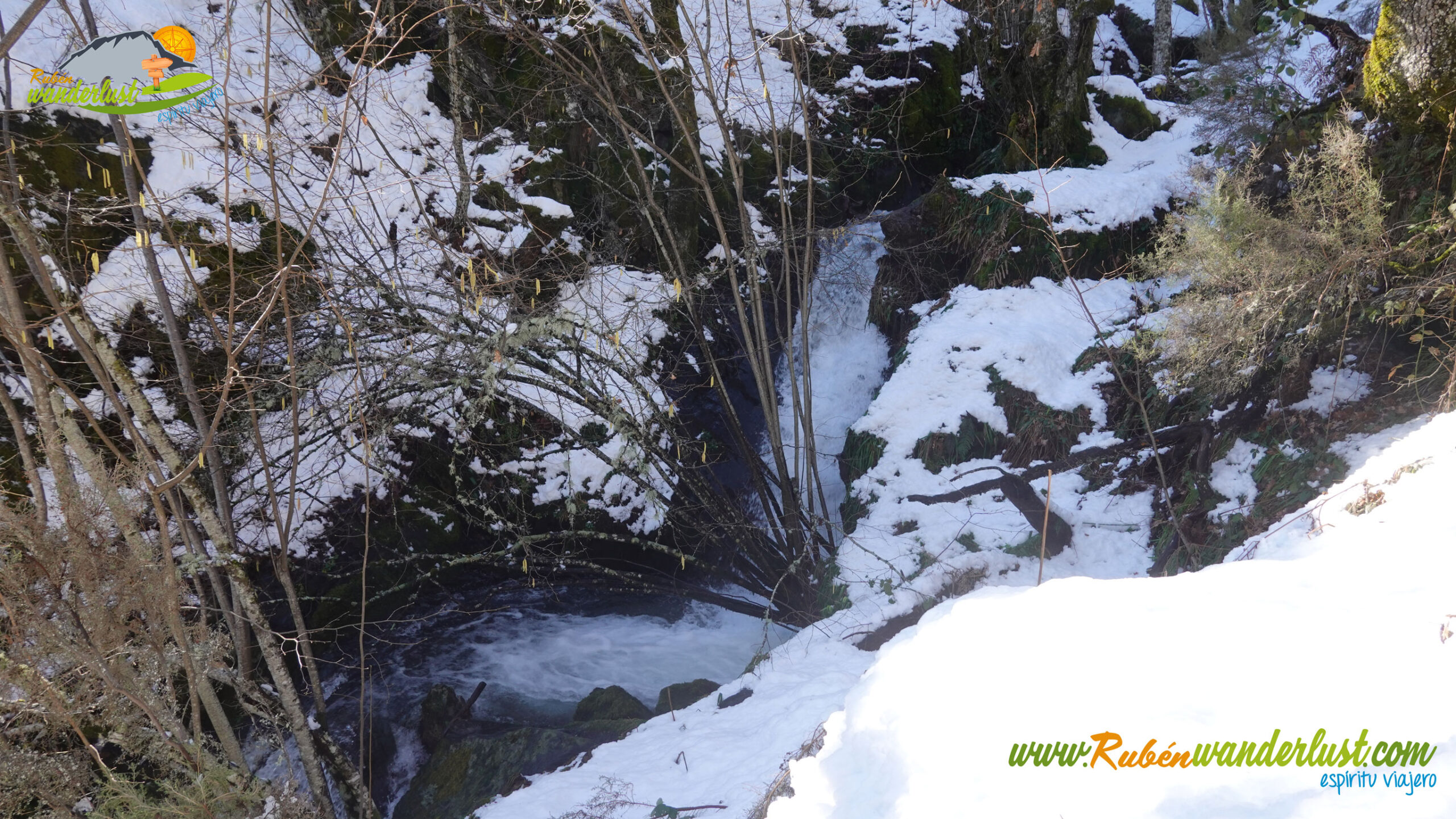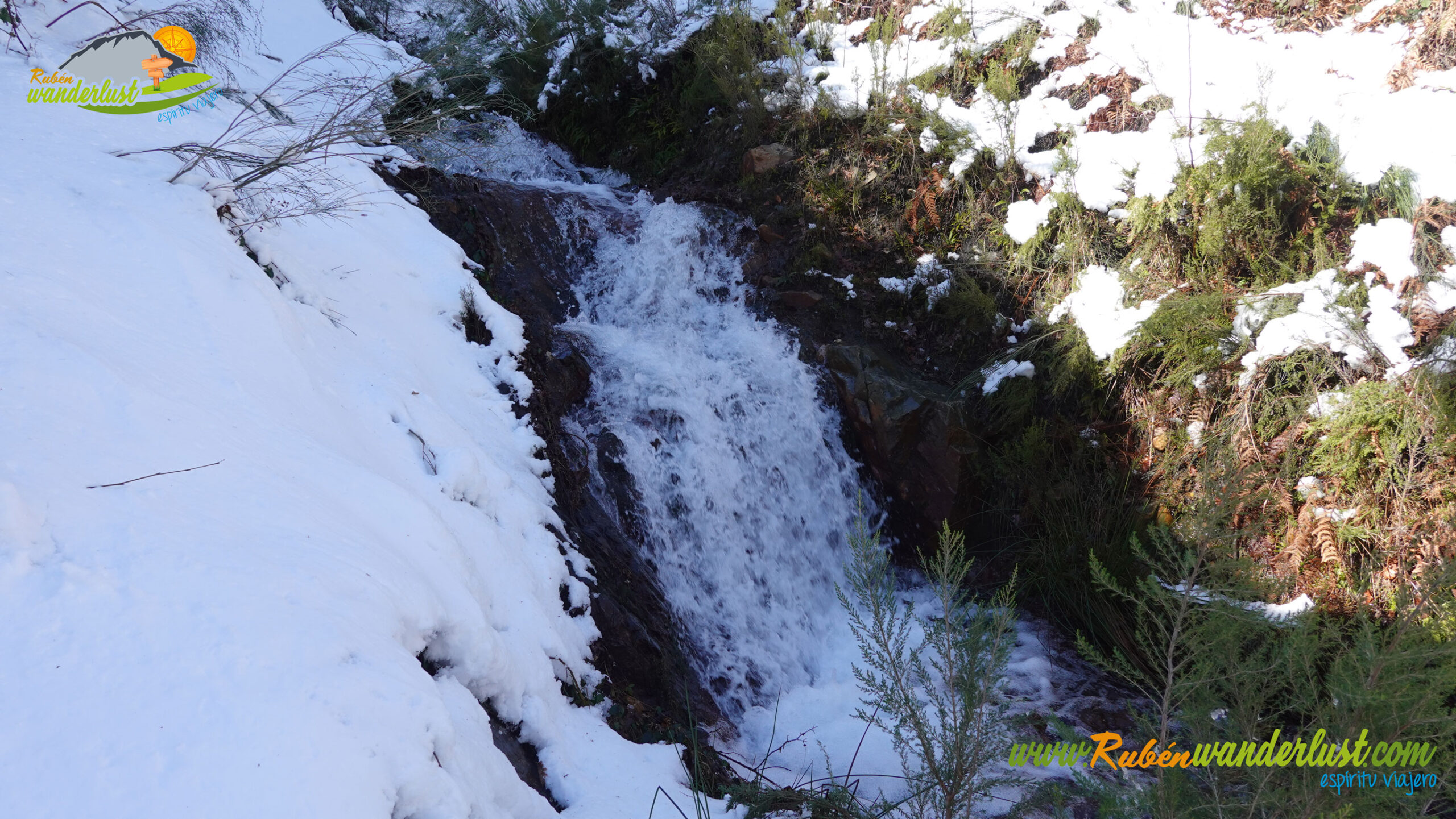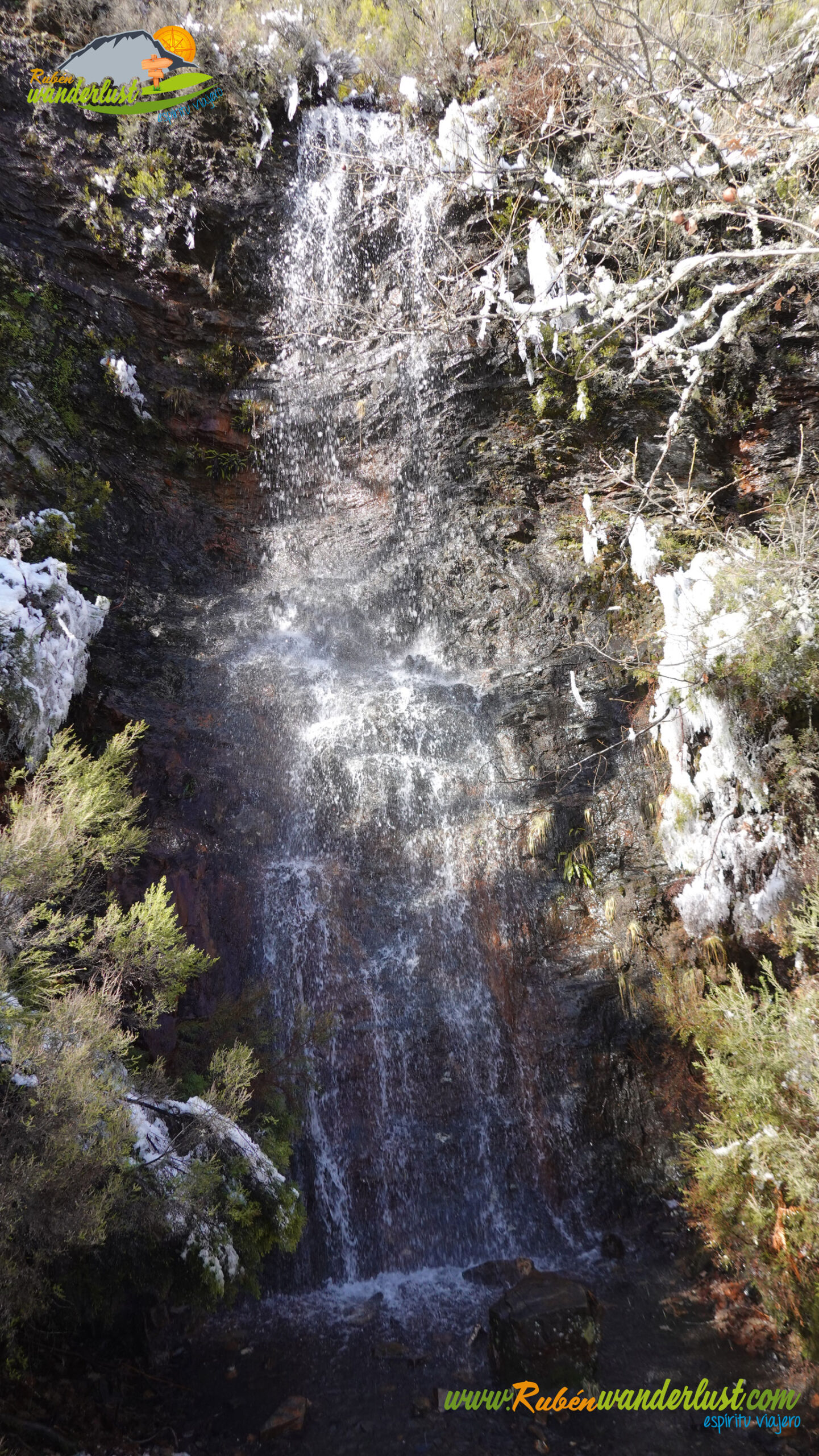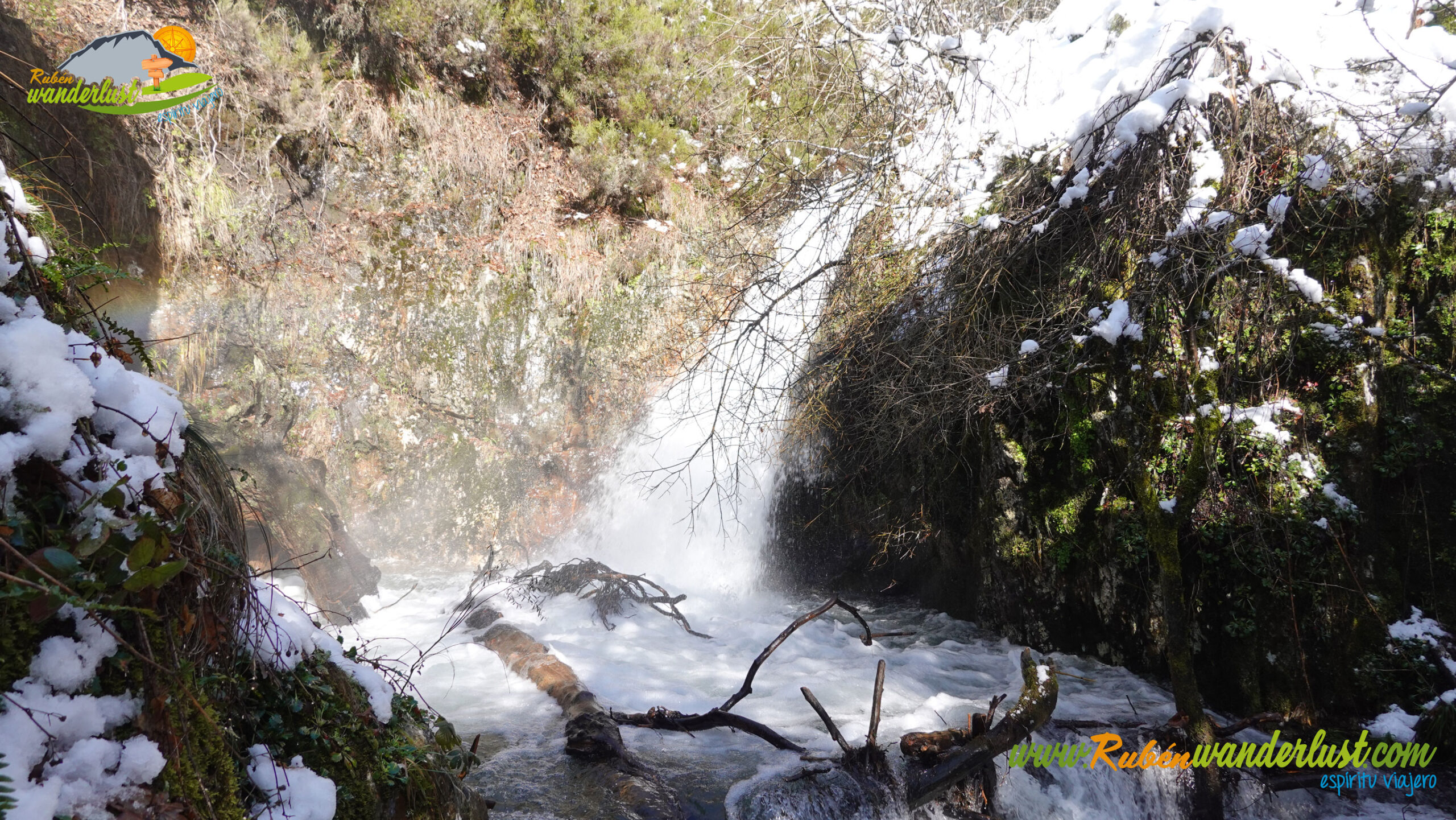 Pronto encontramos el desvío que se dirige hacia la Fuente del Azufre, la segunda fuente que veremos. Giramos hacia la derecha y nos acercamos hasta el lugar en el que se ubica la Fuente del Azufre, donde también vemos una preciosa cascada! El rincón es tan frío como espectacular! Y la nieve, sin duda, le da un plus!