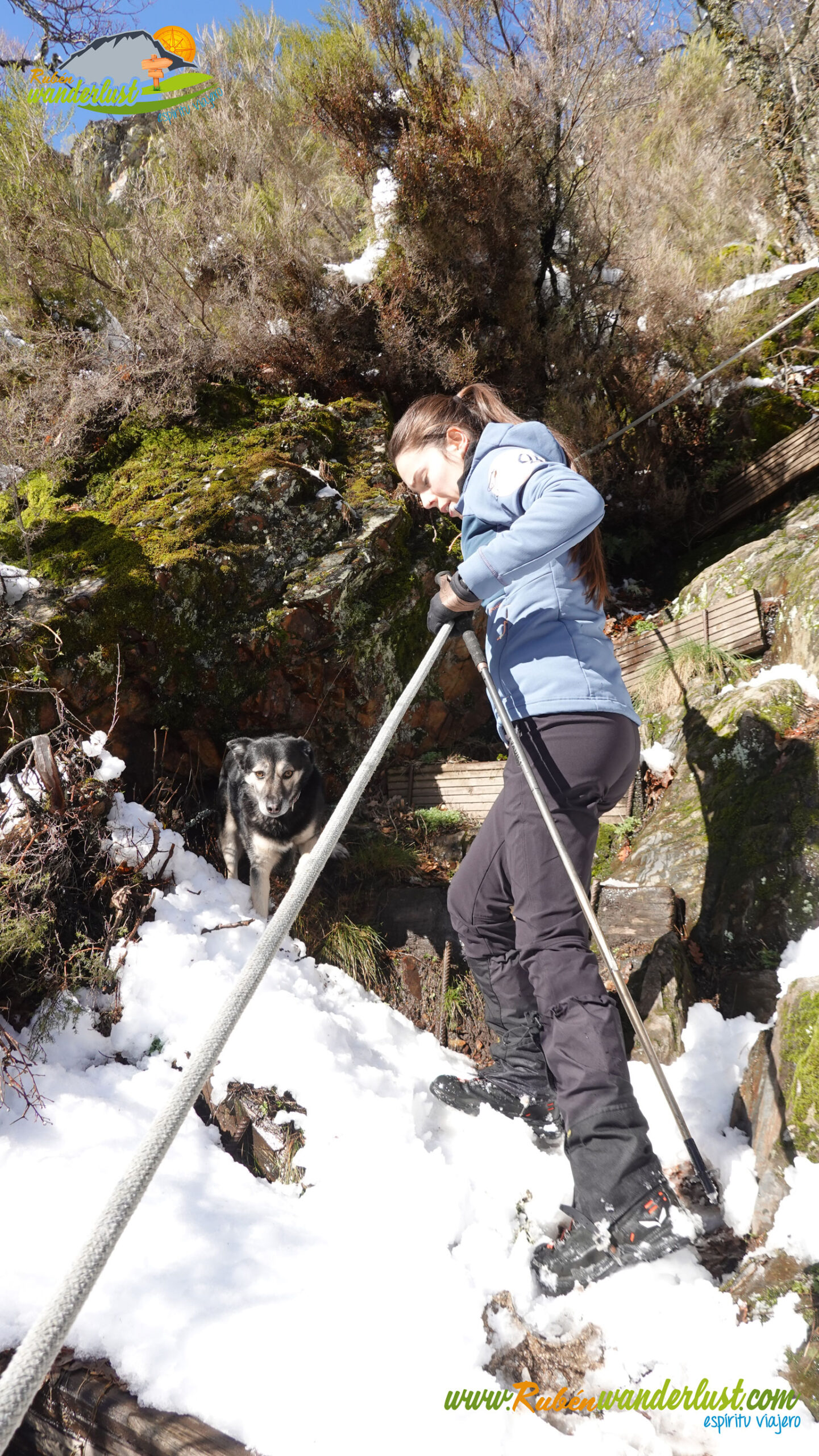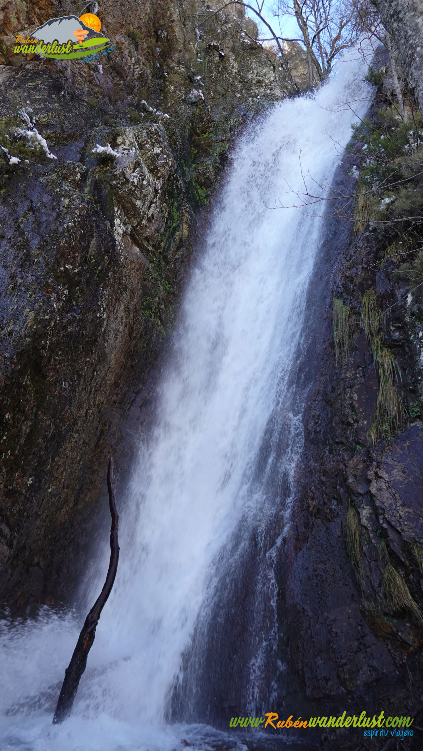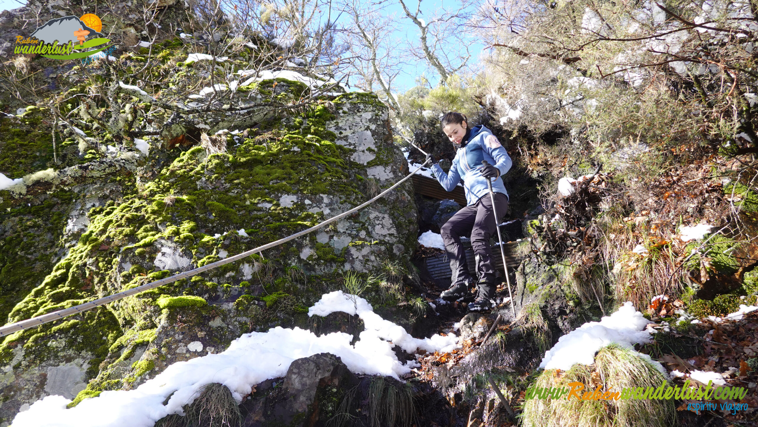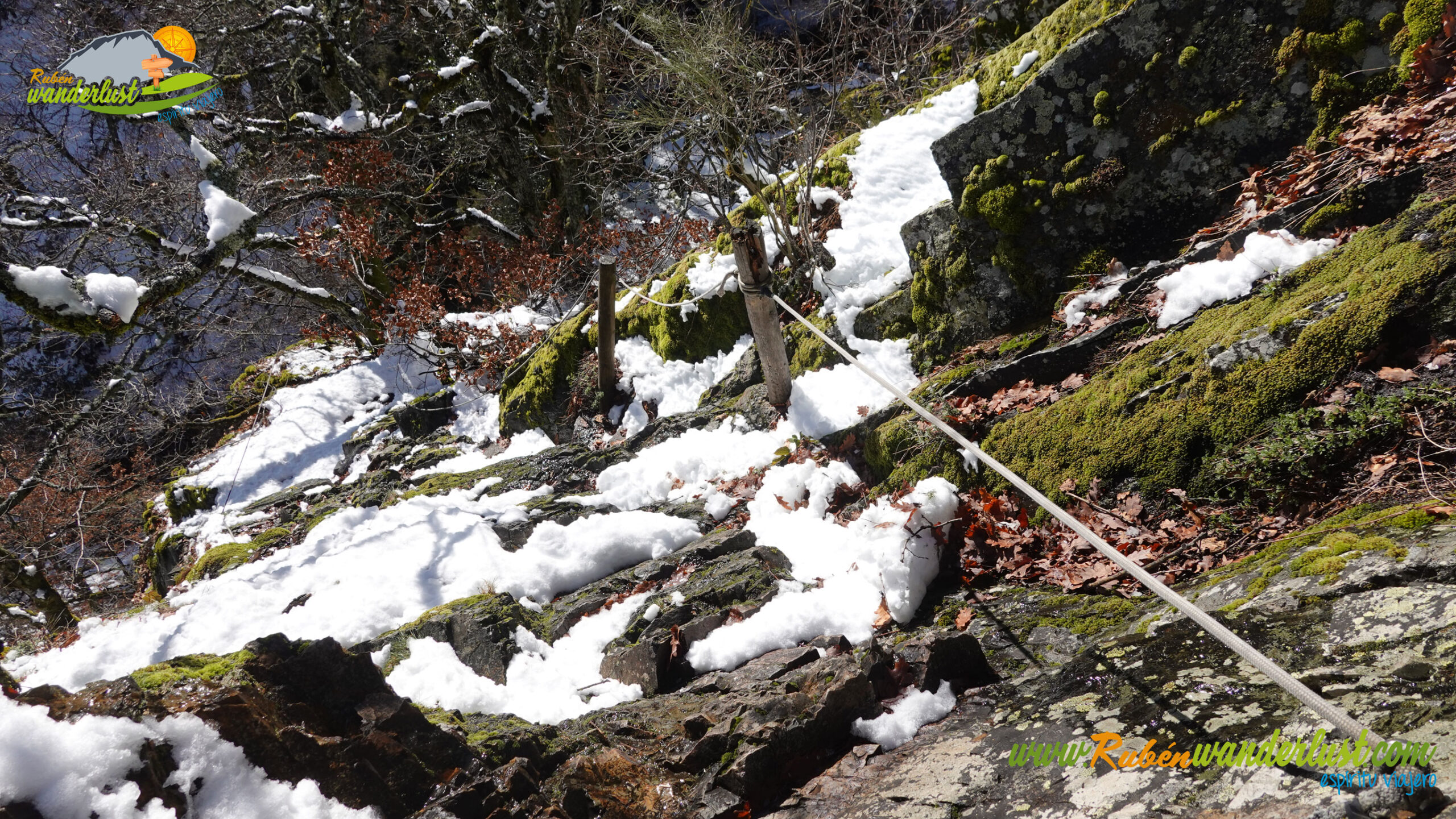 Descendemos con mucho cuidado por la zona helada y nos desviamos hacia la derecha para iniciar el descenso hacia la Catarata de la Gualta. La bajada es exigente y pindia, pero existen numerosas cuerdas y postes de madera que nos ayudarán a mantener el equilibrio. Eso sí, existen postes de madera de dudosa estabilidad! Hay nieve, y eso dificulta algo el paso, pero no tenemos ningún problema en perder altura. Un tramo que disfrutamos muchísimo!