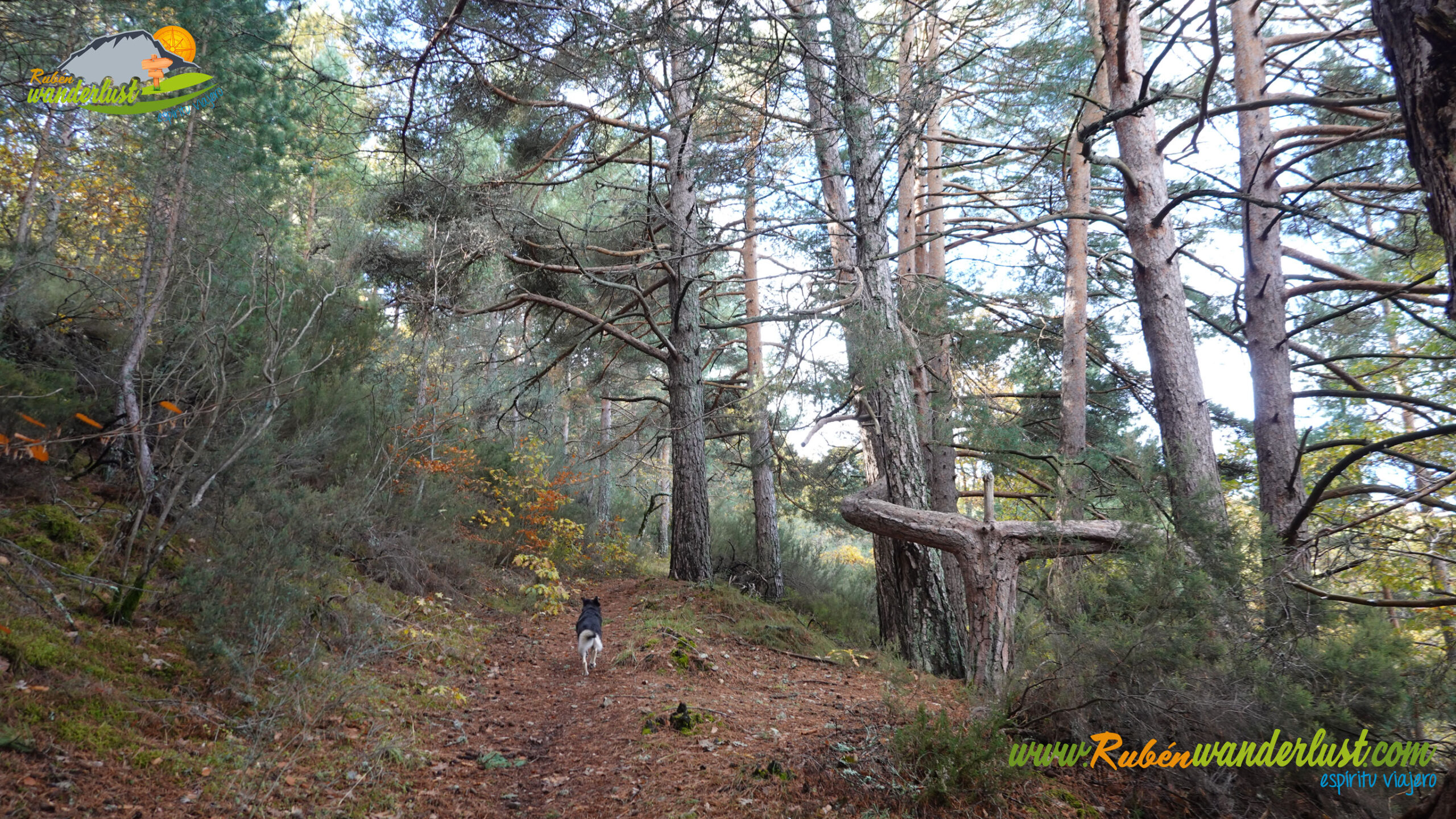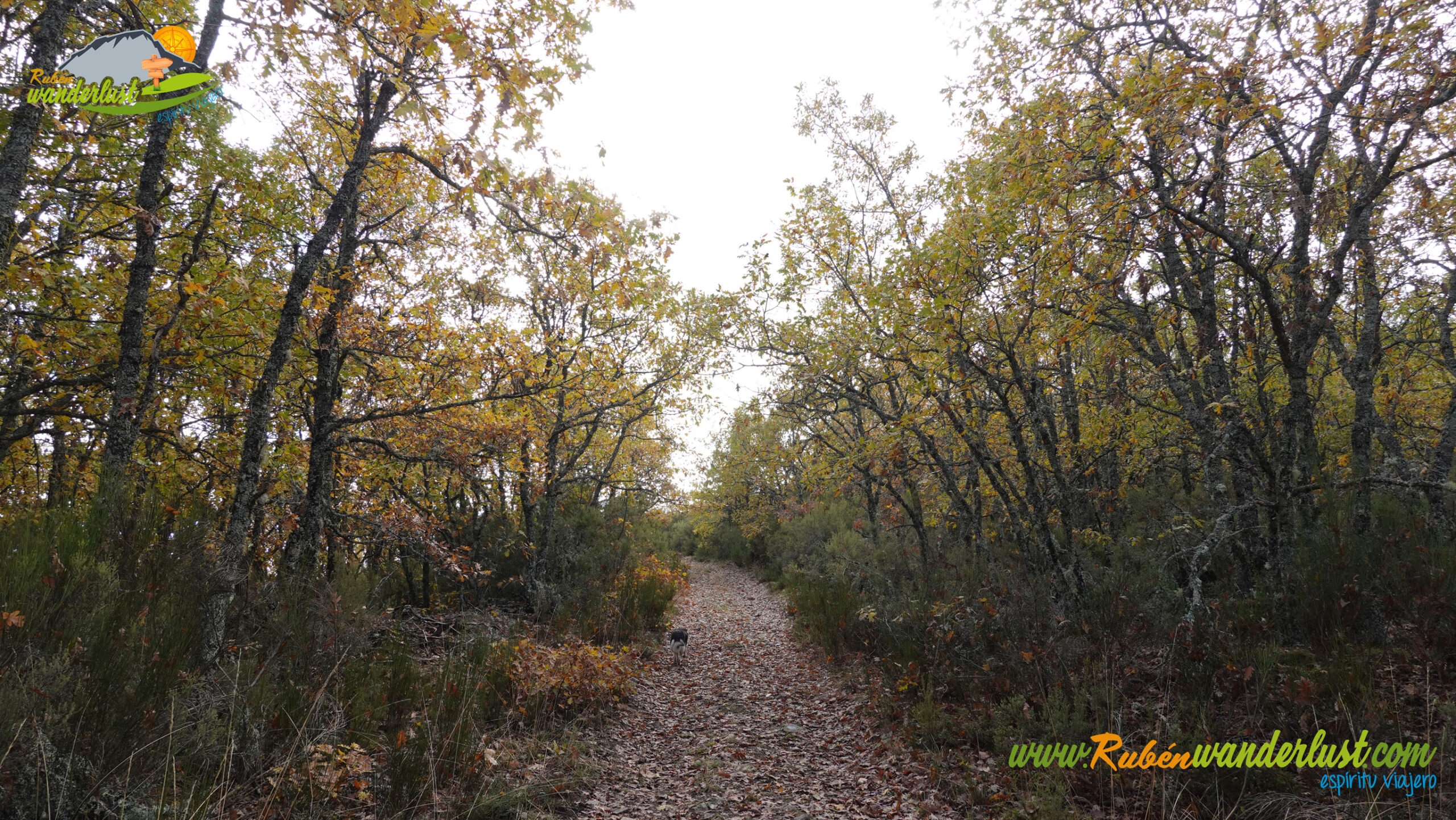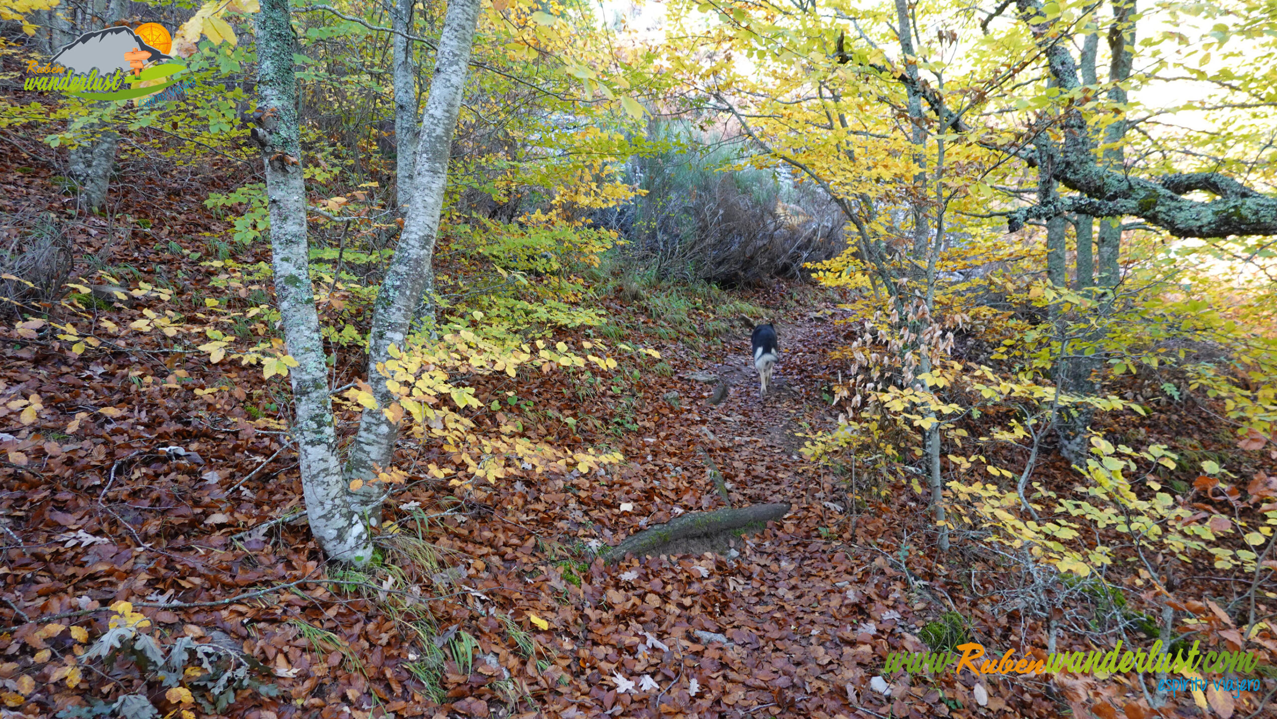 El otoño se muestra espectacular! La ancha y sencilla senda se convierte en un bonito sendero que dejará atrás un pinar y se adentrará en un hayedo muy guapo, por donde luego bajaremos. Estamos en la última parte boscosa del recorrido!