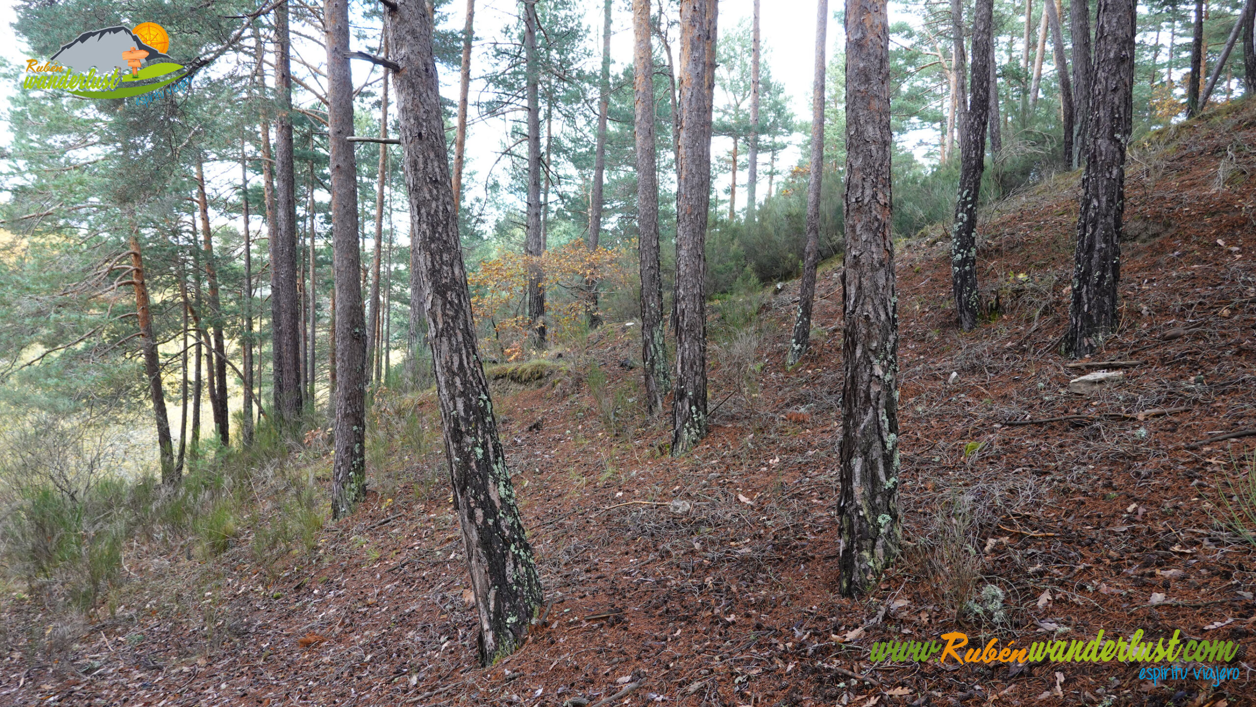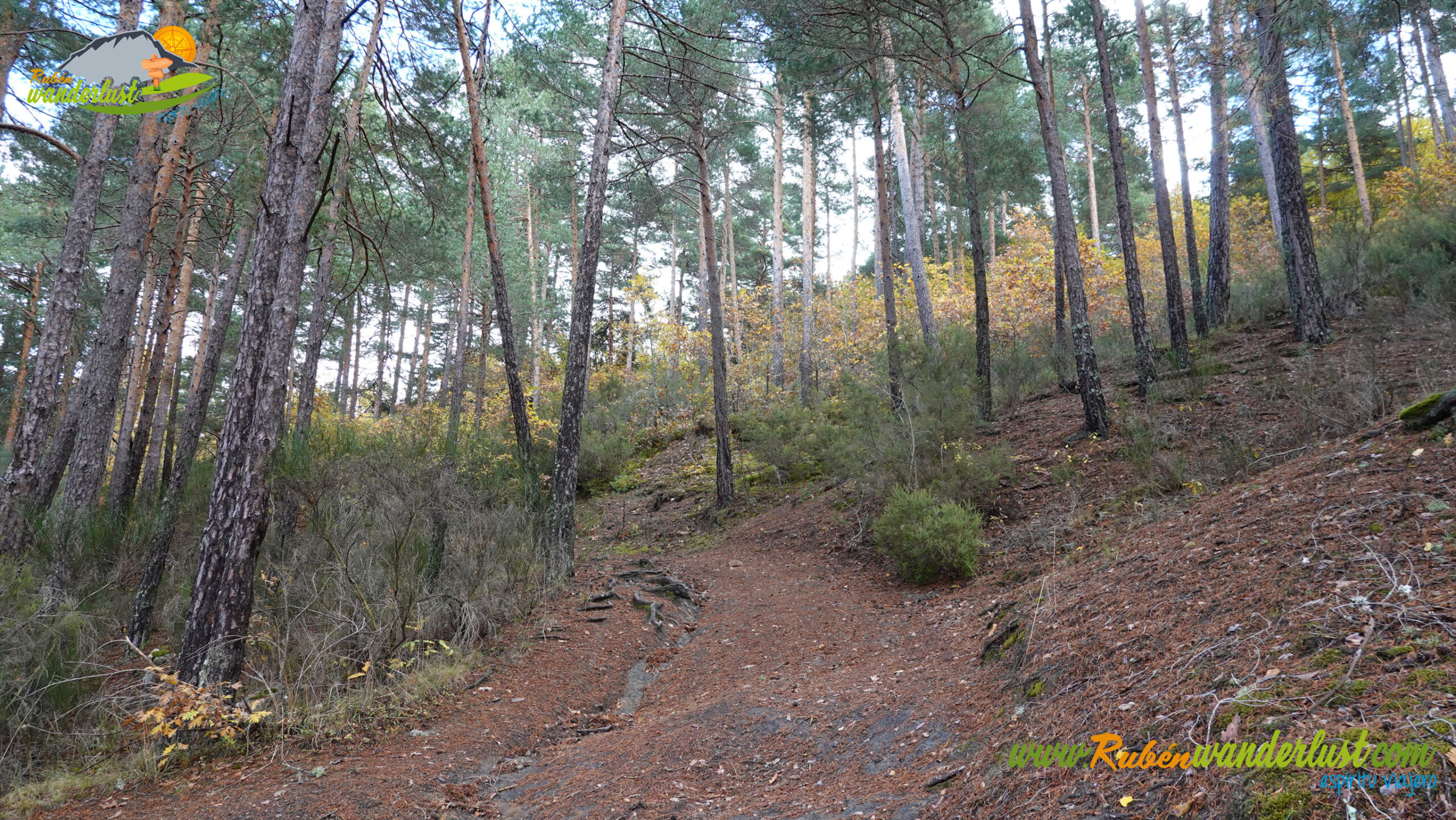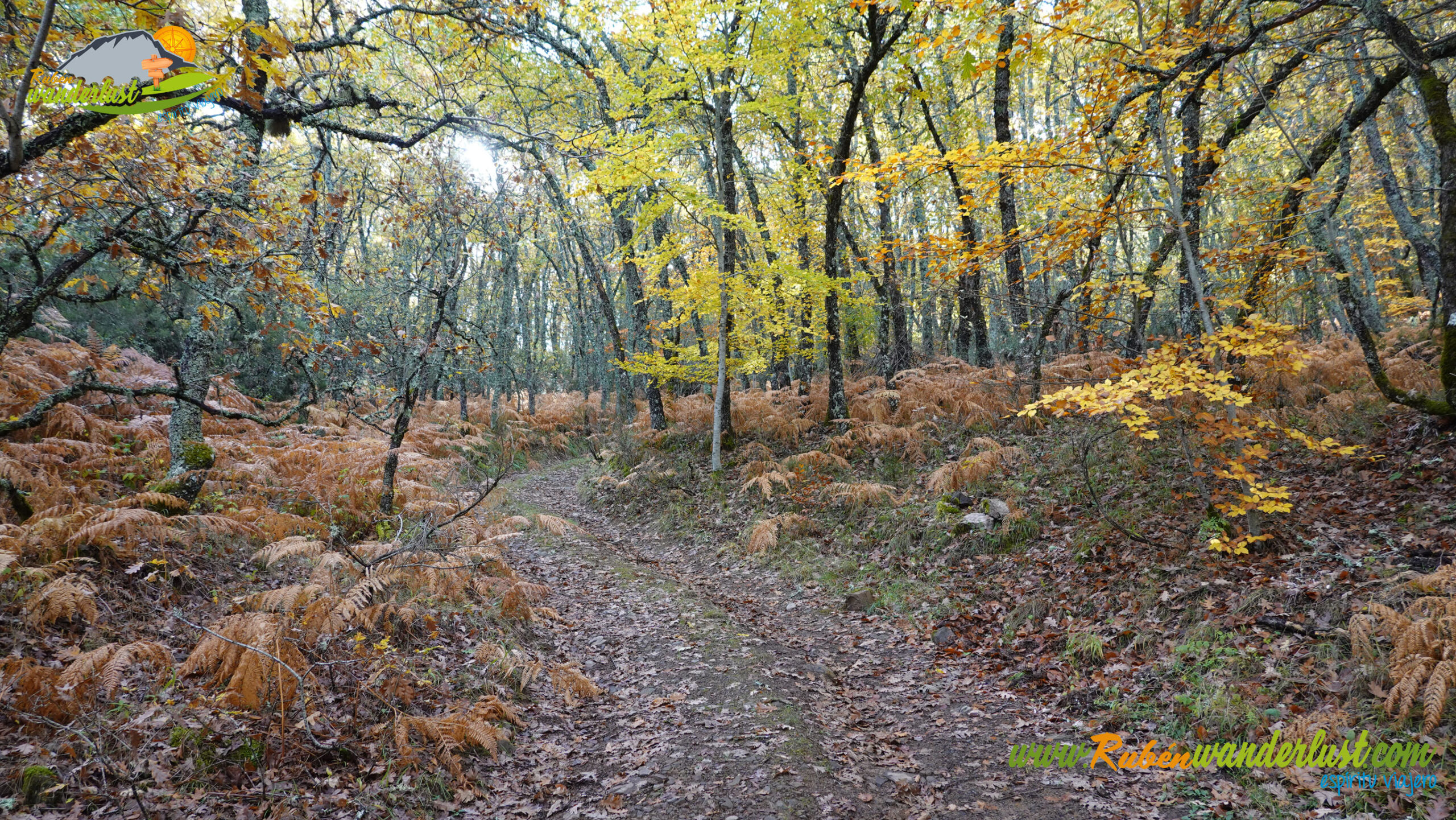 El otoño se muestra espectacular! La ancha y sencilla senda se convierte en un bonito sendero que dejará atrás un pinar y se adentrará en un hayedo muy guapo, por donde luego bajaremos. Estamos en la última parte boscosa del recorrido!