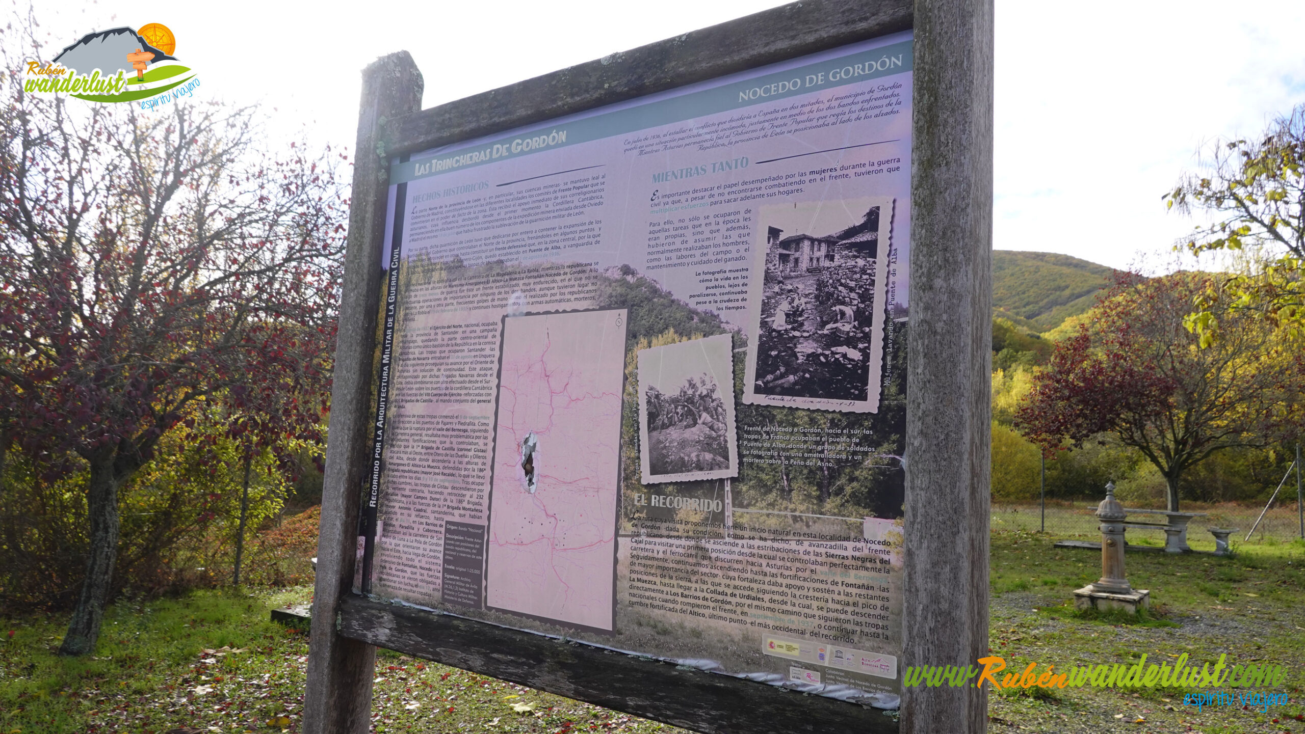 Iniciamos nuestro recorrido tras visitar el cartel informativo que aquí mismo vemos y rellenar nuestras cantimploras gracias a la fuente que encontramos en un pequeño parque. La ruta da los primeros pasos a lo largo del pueblo de Nocedo de Gordón, desviándonos hacia su parte más alta. Vemos otra fuente más y tomamos el desvío que se dirige hacia el Pico Fontañán en lo que sería su vía más directa de ascenso.