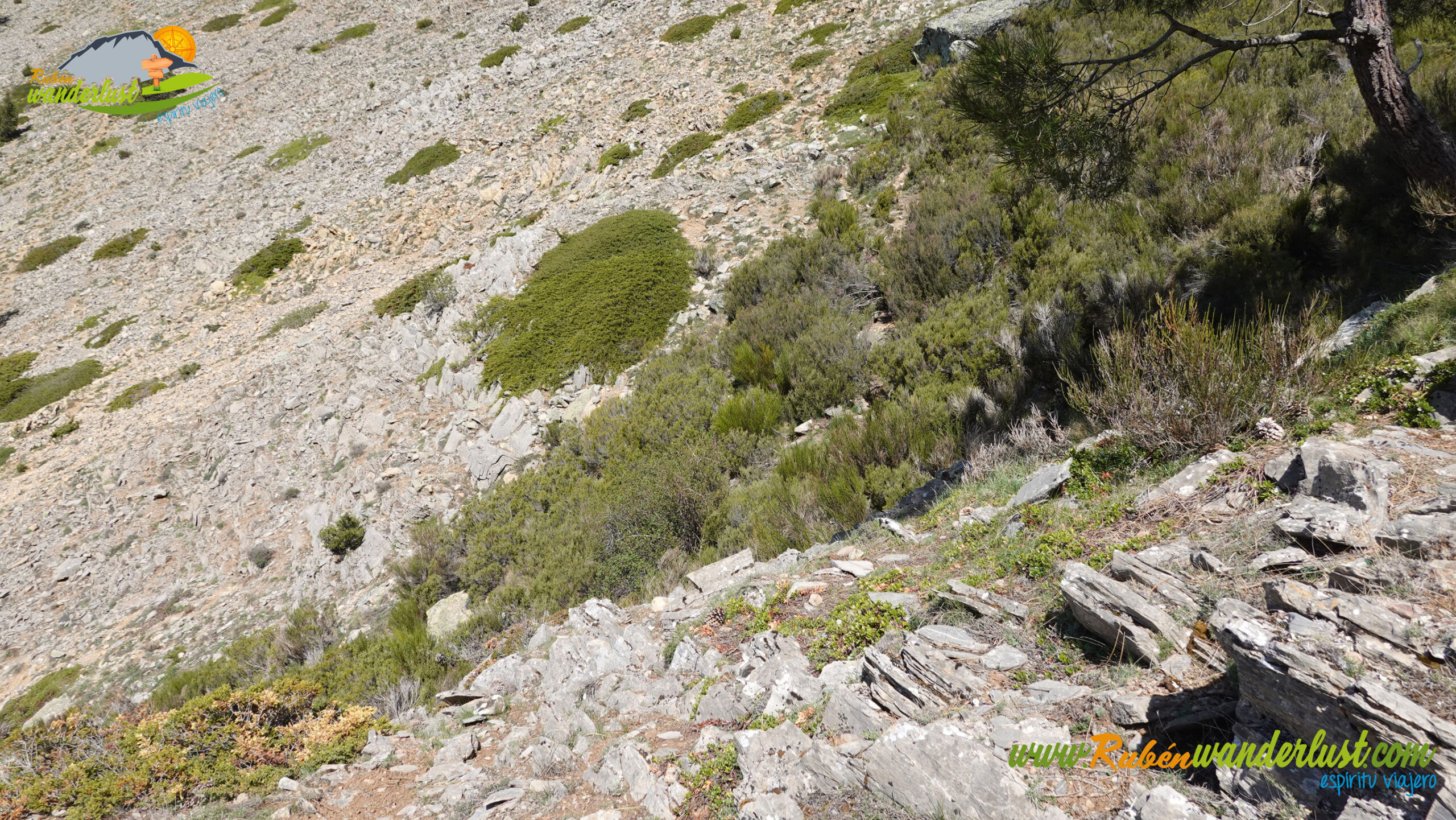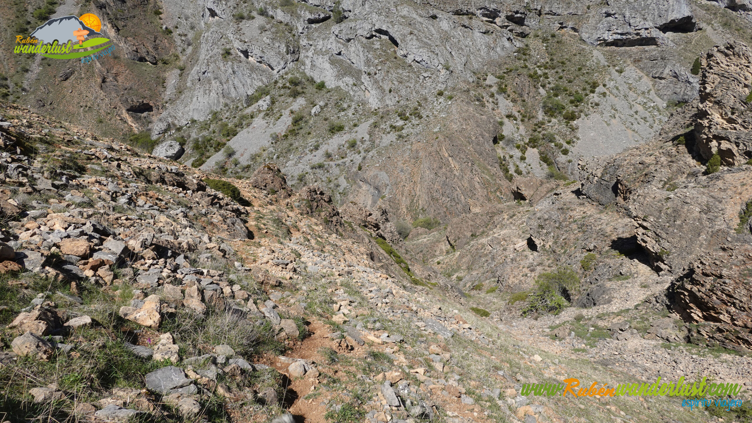 Cambiando considerablemente la exigencia de la ruta, comenzamos a ascender hacia Peña de la Roza, siempre a lo largo de una canal con bastante inclinación y sin complicaciones. El sendero está bastante claro y encontramos varios hitos que nos van guiando correctamente, así que no tenemos problemas en seguir. La primera parte avanzará cerca del arroyo que cae por la parte más profunda de la canal, mientras que la segunda parte seguirá con cierta tendencia hacia la derecha, rumbo a la cumbre y ya con la ladera mucho más tendida. Las vistas hacia el Desfiladero de los Calderones son brutales!