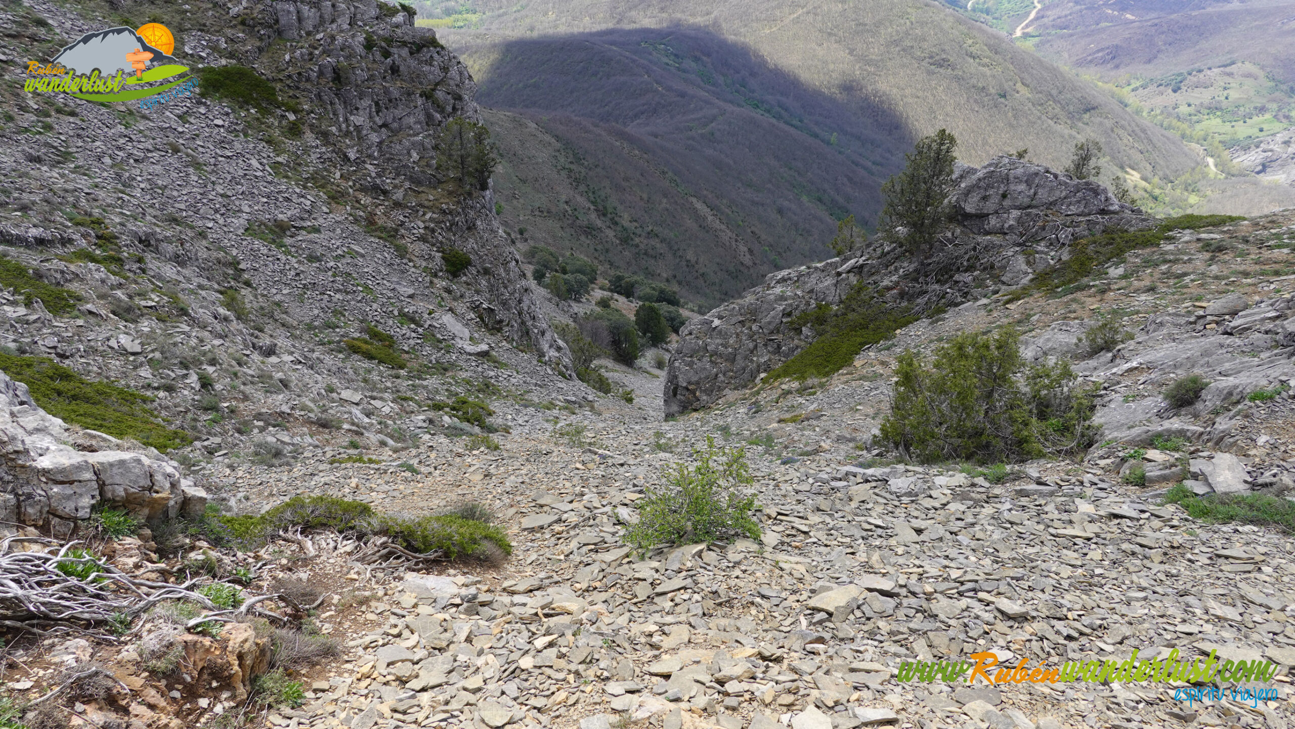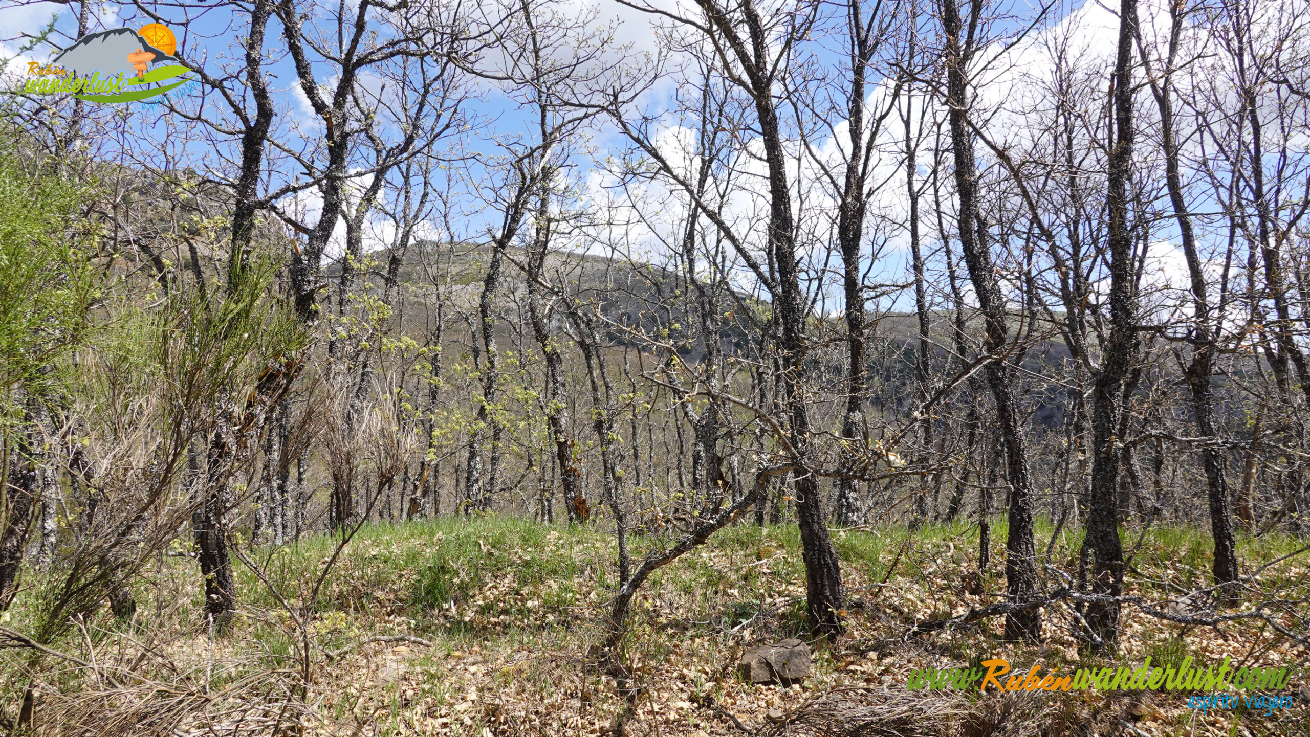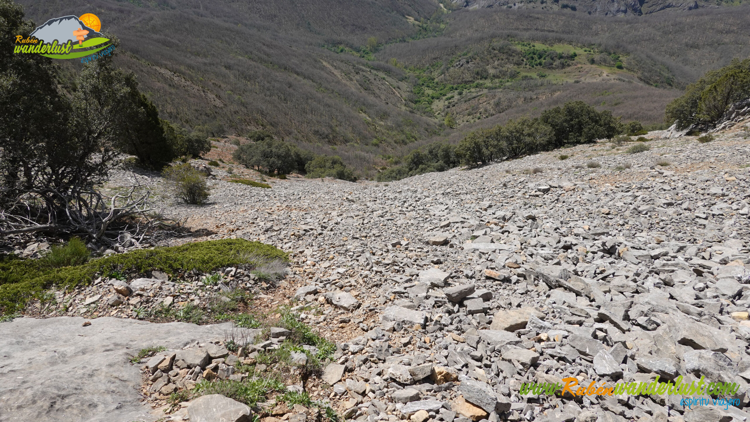 Completada la canal sur del Pico Torres, continuamos la ruta bajando por un canchal, ahora con tendencia hacia la izquierda, buscando el cortafuegos por el que seguiremos perdiendo altura. No hay camino evidente, pero no tiene demasiada complicación. Tendremos que evitar la parte más profunda del valle y buscar la loma, lugar en el que se ubica el citado cortafuegos, por donde bajaremos, siempre bien acompañados de robles.