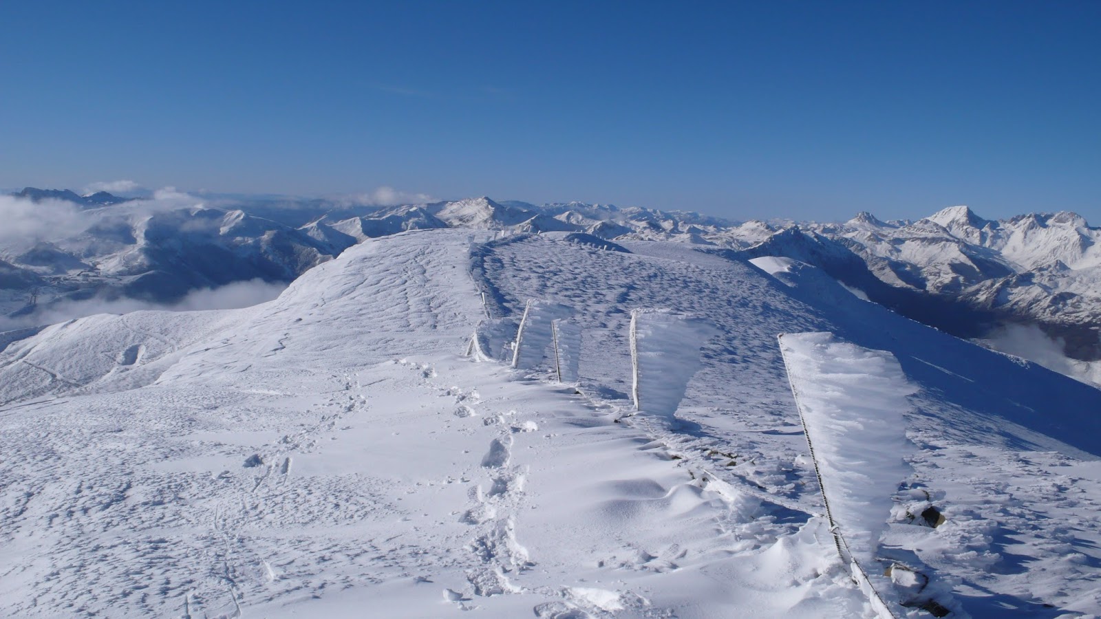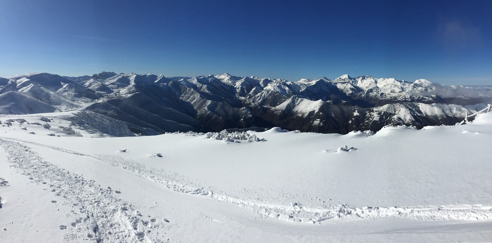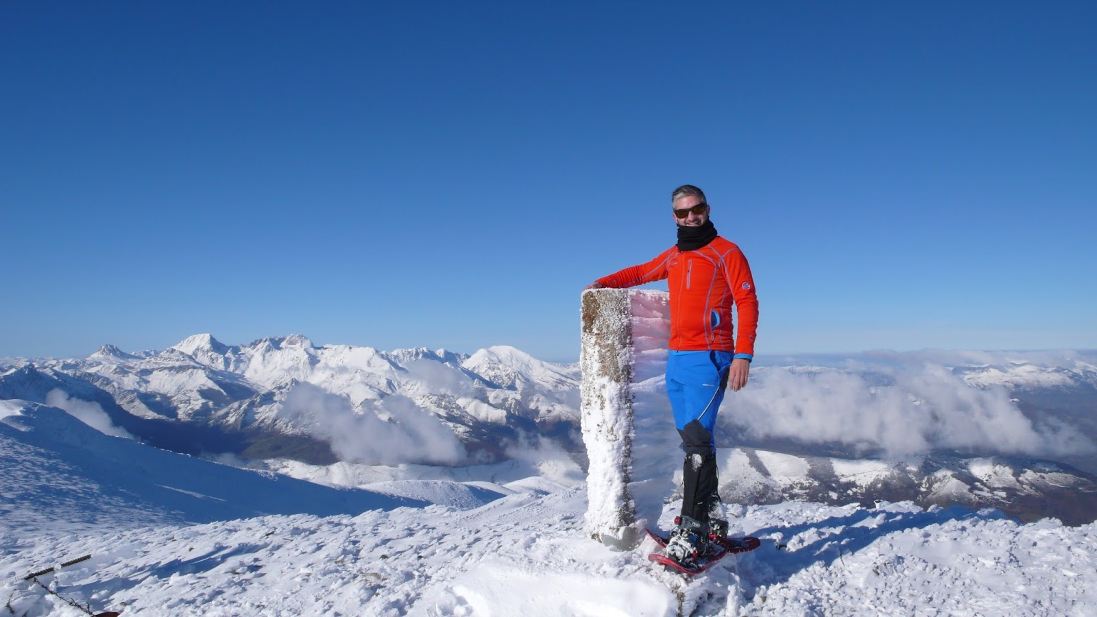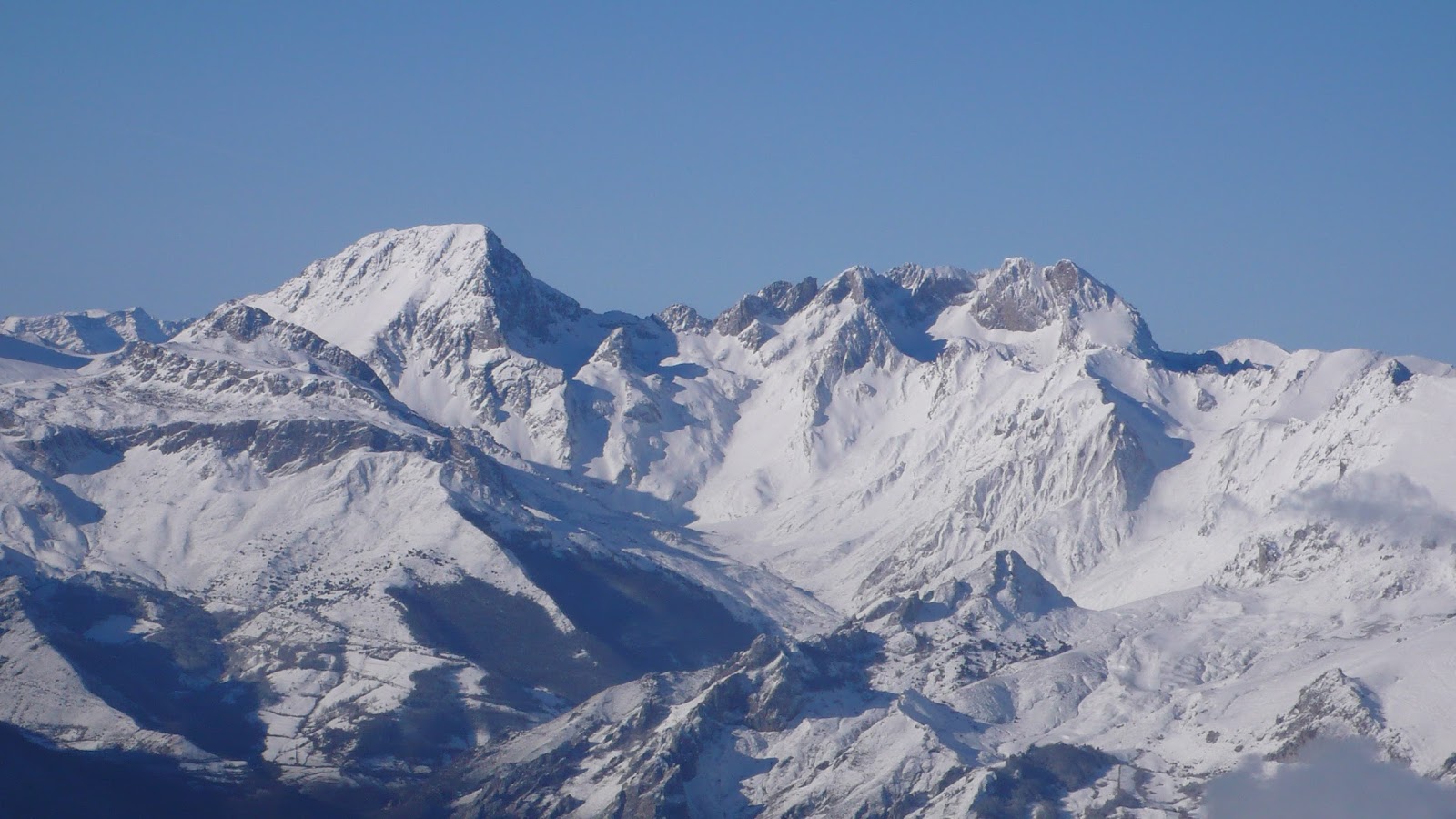 Tras un breve y agradable paseo por la cuerda, llegamos a la cima del Pico Cellón (2.029 m.), un balcón impresionante hacia gran parte de la Cordillera Cantábrica. Destacan, por encima de todas, las espectaculares Ubiñas, Peña Ubiña, los Picos del Fontán, Peña Cerreos, la Sierra del Aramo, el Pico Tres Concejos, Pico Brañacaballo, el cercano Pico de Pájara, Peña Laza, Cueto Negro y un largo etcétera. Innumerables cimas a nuestro alrededor y un día completamente claro. Las vistas de 360 grados que tenemos son impresionantes! Tras disfrutar de la cima junto a Vicente y hacer las consiguientes fotos, emprendemos el descenso, ahora en solitario, pues Vicente se disponía a prepararse para descender montado en su tabla de snowboard.