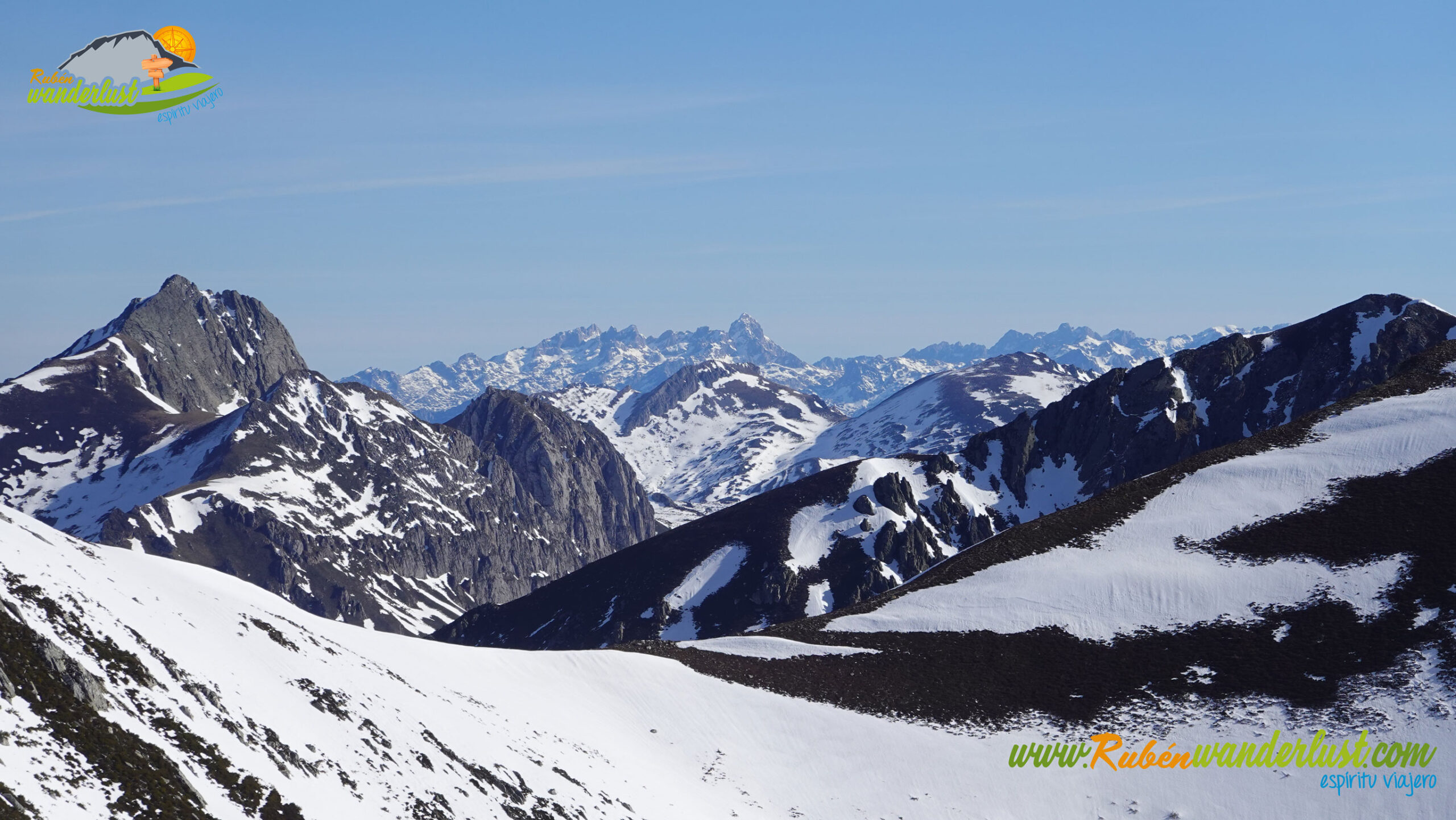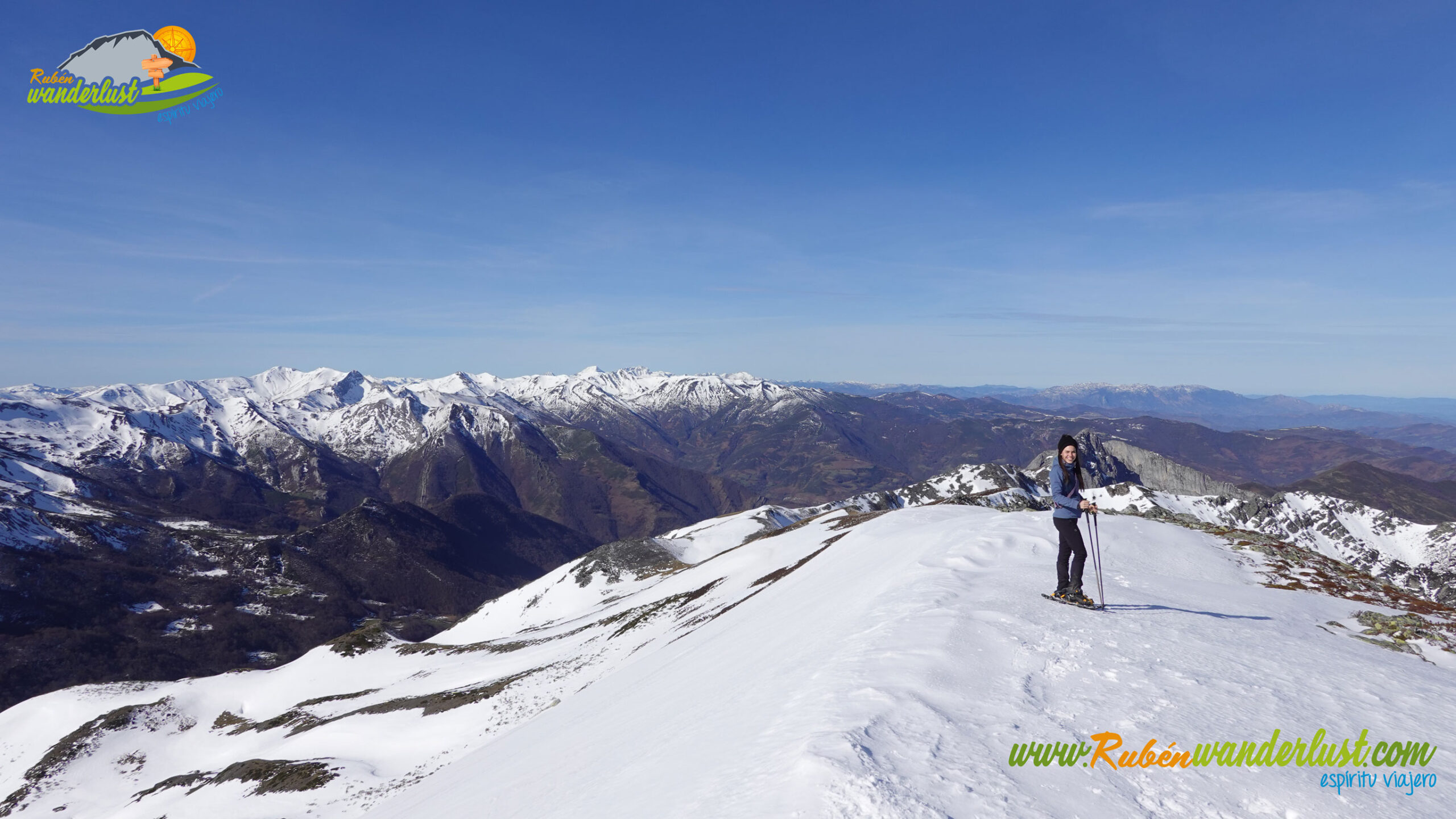 Completado el Canalón Xexia, llegamos a la arista del Pico Jeje, nuestra primera cumbre del día. Seguimos avanzando bien en botas, pero las raquetas de nieve pesar en la mochila, así que aprovechamos para ponerlas y ganar algo de seguridad en la última parte de la ascensión. Las vistas hacia el este son sublimes! Vemos las montañas más cercanas, destacando el Pico Nogales y el Pico del Oso, el entorno de San Isidro, el Pico Toneo, el Pico Agujas, el Pico Torres, Picos de Europa, etc.