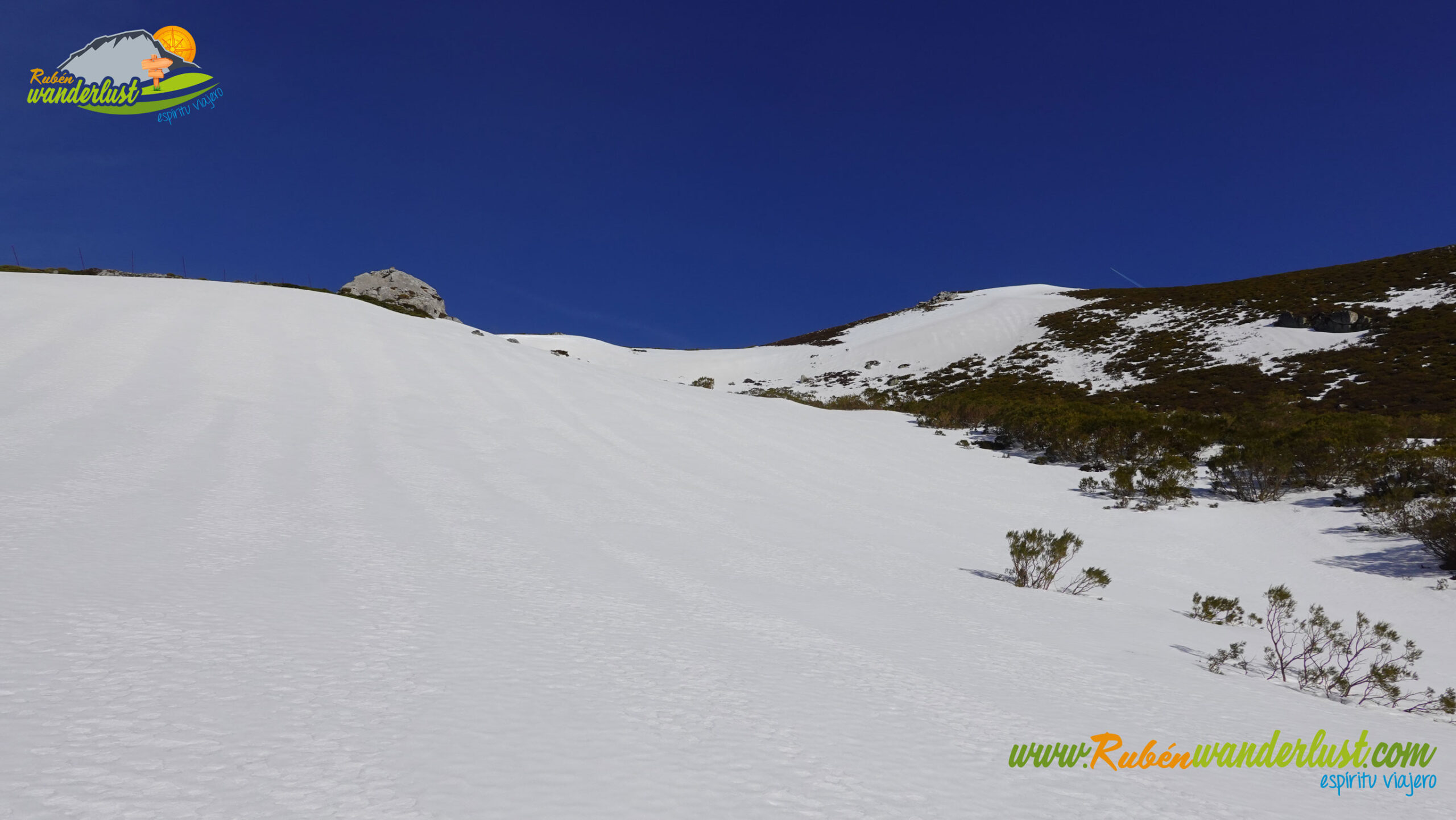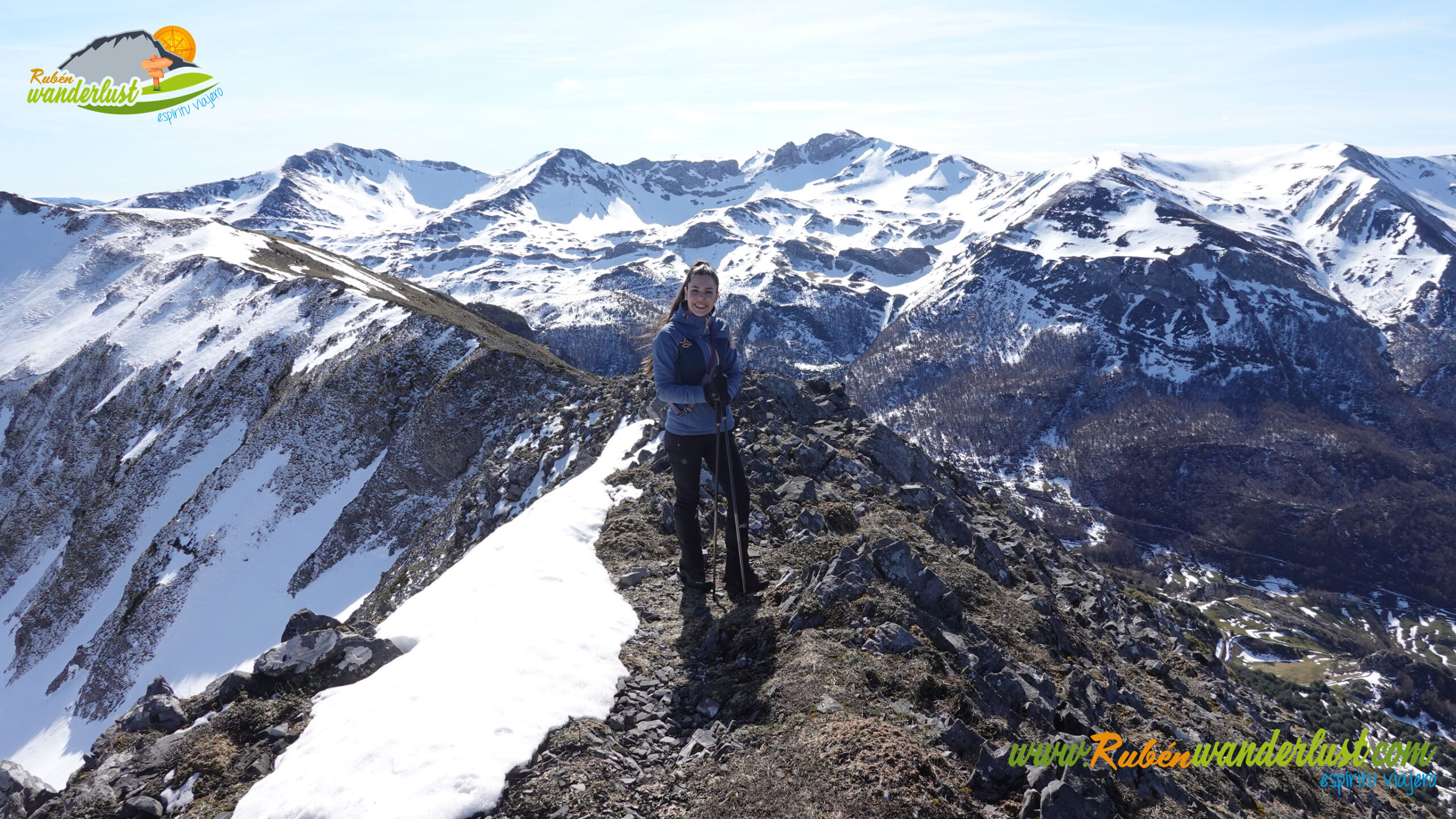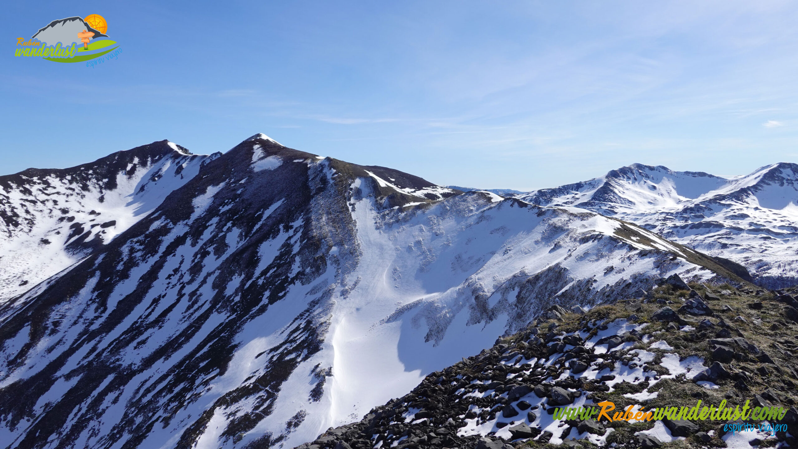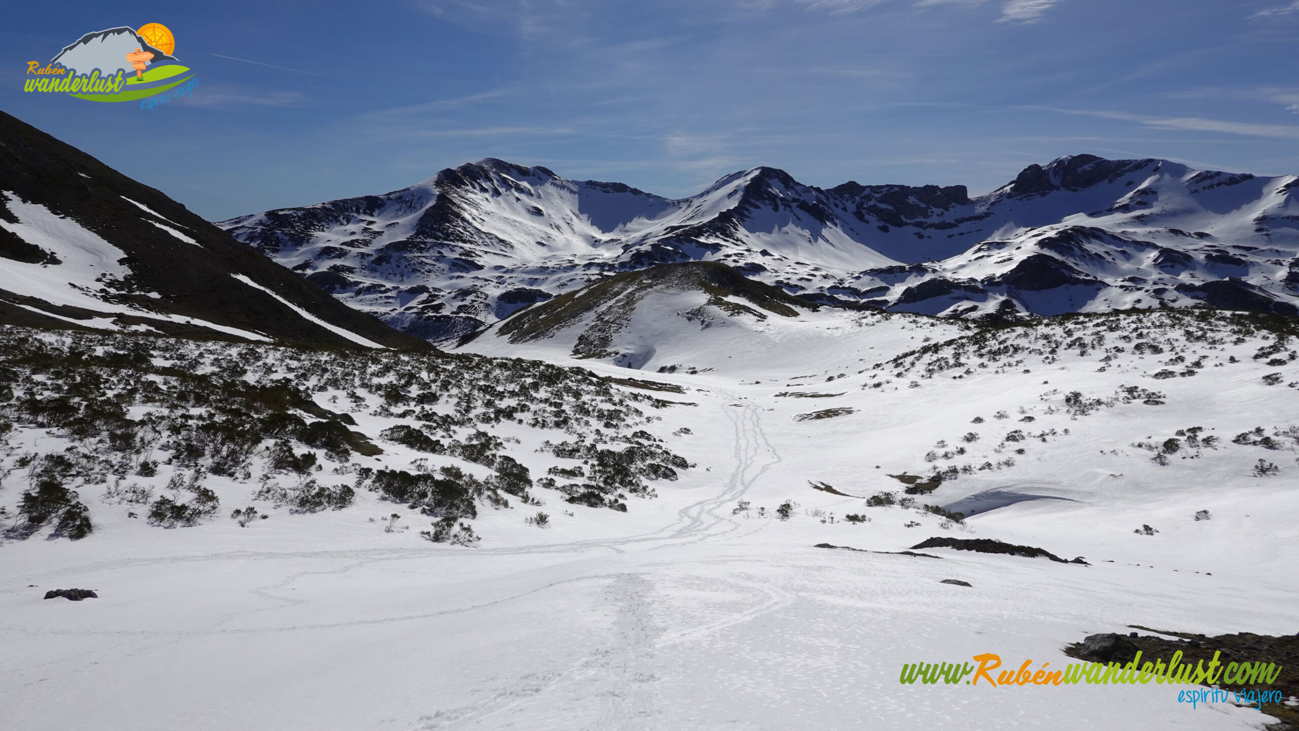 Tras nuestro paso por la cima del Pico Jeje, continuamos el recorrido por su arista oeste, rumbo al collado que nos separa del Pico La Cabritera, nuestro siguiente objetivo. La arista oeste del Pico Jeje no tiene casi nada de nieve, así que nos quitamos las raquetas y continuamos la ruta en botas. Las vistas siguen siendo sublimes, así que afrontamos esta suave bajada disfrutando mucho del entorno. La última parte se inclina algo, pero nada importante! A nuestra izquierda, el bonito Valle Xexia, por donde regresaremos al Puerto de Vegarada.
