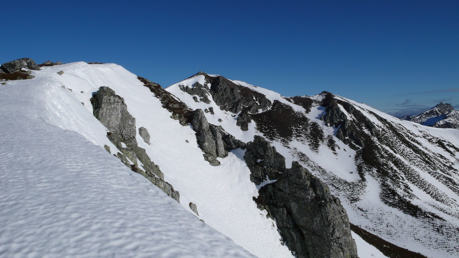 Tras completar el primer tramo, llegamos a una zona un poco más abierta, donde la ancha cresta nos permite ganar vistas hacia ambos lados. Empezamos a encontrar nieve, pero el sol golpea con fuerza, por lo que no es necesario el uso de material invernal. Son pocos centímetros y vamos avanzando sin problemas, haciendo algo de huella y sin ser una parte especialmente pindia.