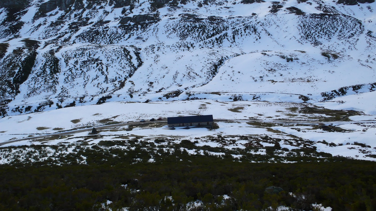 Llegamos al Puerto de Vegarada, donde dejaremos el coche en las inmediaciones del antiguo mesón, ahora abandonado. Desde aquí, ya podemos tener una amplía panorámica de todas las montañas que nos rodean, hacia el norte y hacia el sur. Mucha más nieve en la zona sur de Vegarada, pues da mucho más tiempo la sombra. Podemos encontrar alguna ruta para aprovechar las raquetas de nieve o hacer alguna ascensión algo más técnica, rumbo a las Peñas de Faro, el Pico Huevo, etc. Nuestro objetivo lo tendremos mirando hacia el norte, y aunque no es visible su cima, desde bien cerca ya podemos presenciar las primeras rampas del Pico Jeje.