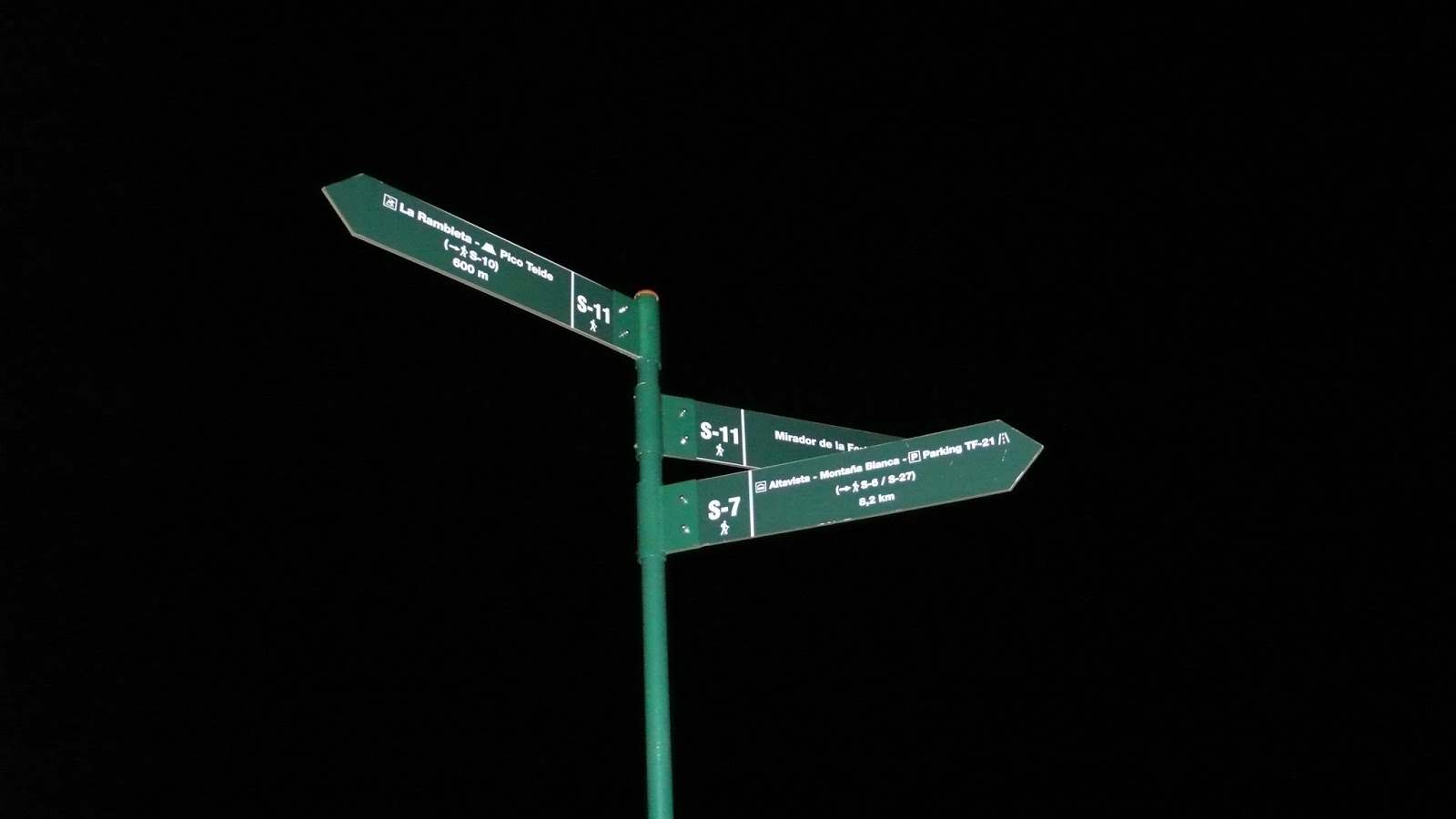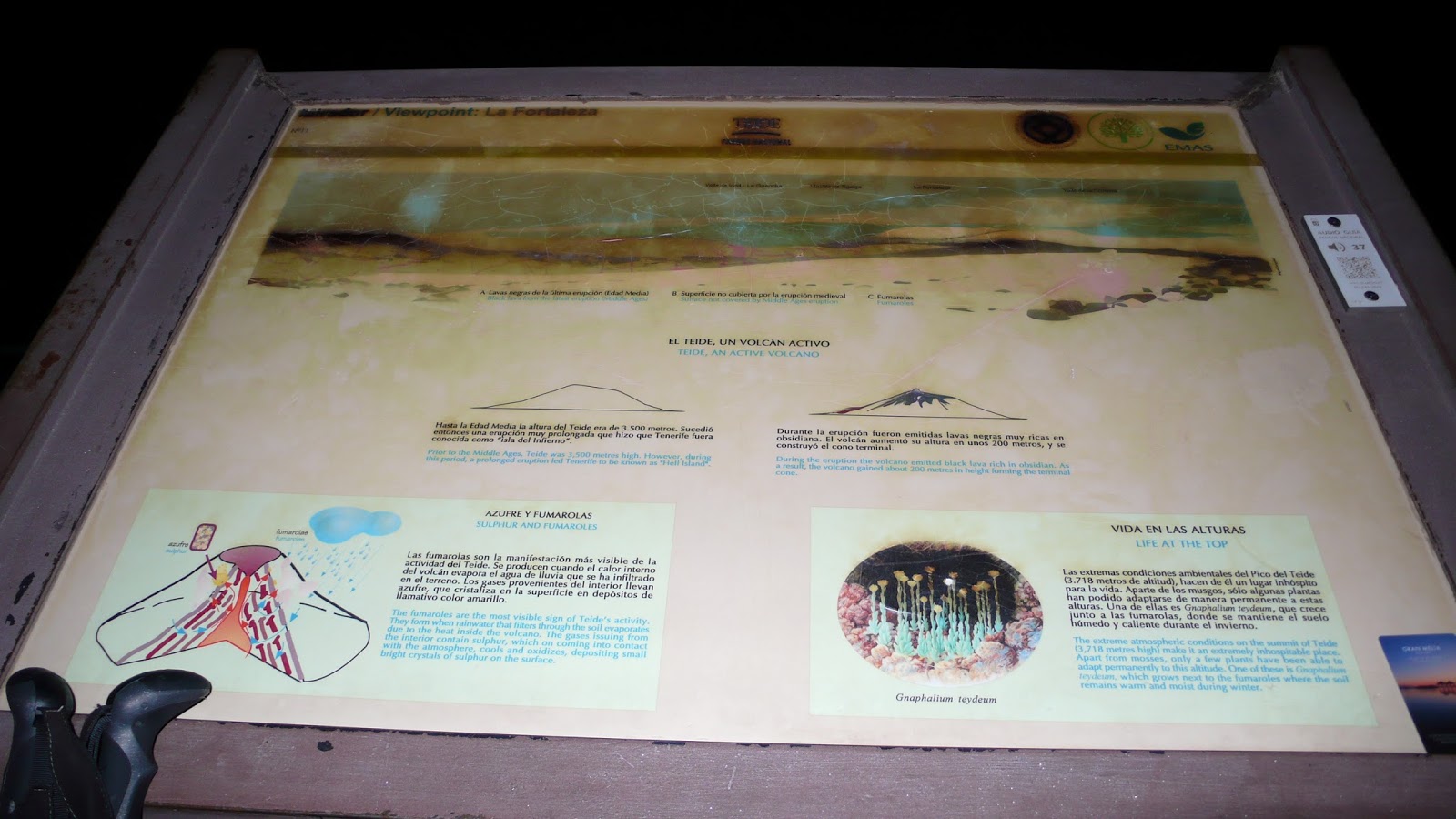 En pocos pasos llegamos al Mirador de la Fortaleza, donde encontramos un cartel informativo sobre la panorámica que podemos presenciar. Sólo vemos las luces de las localidades situadas hacia el norte y los primeros claros del horizonte. Regresamos sobre nuestros pasos hasta llegar al desvío, por el que continuaremos, rumbo hacia la cumbre del Pico Teide.