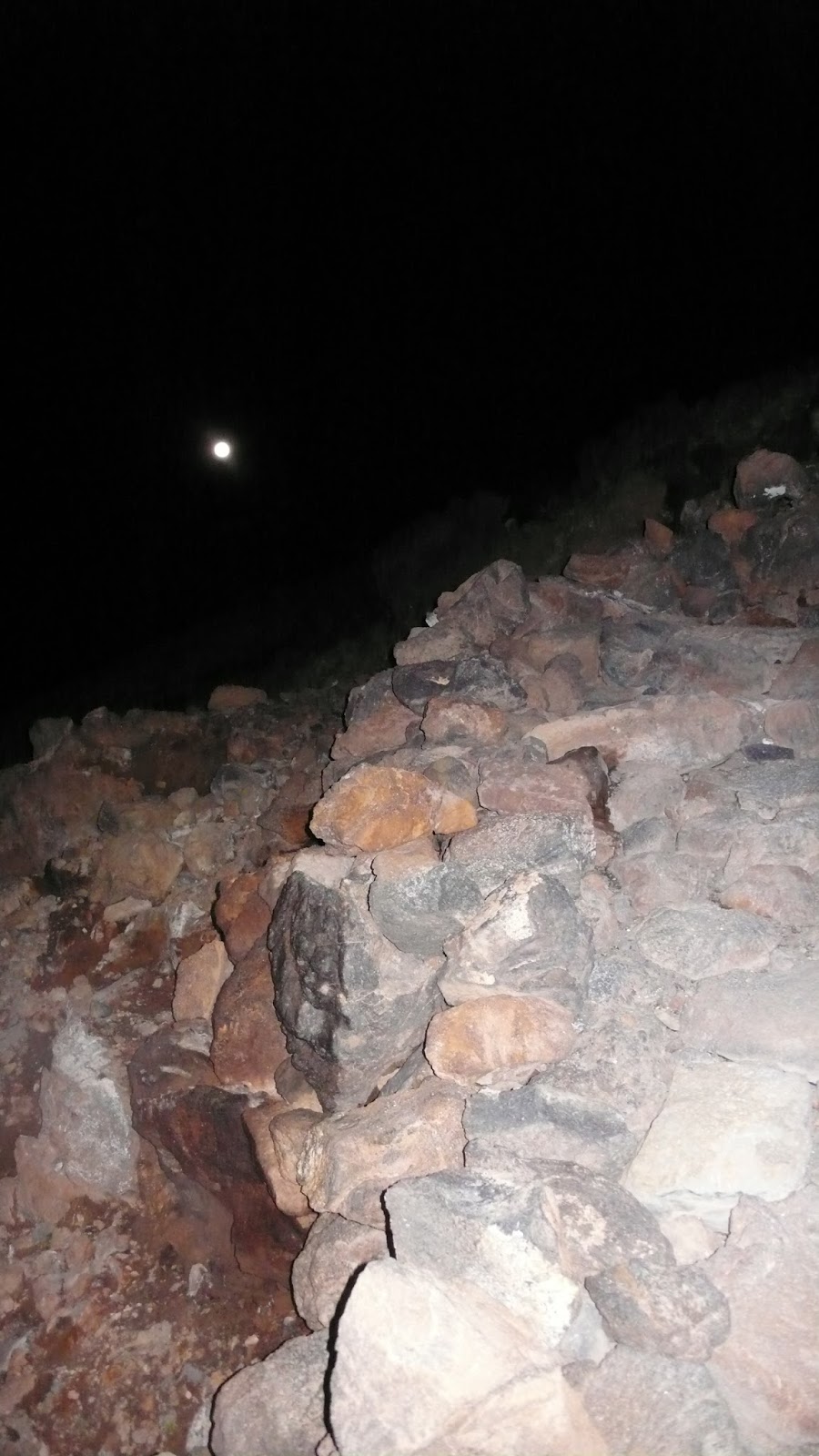 Por delante, unos 500 metros de desnivel para llegar a la cima del Pico Teide. Empezamos con la noche aún cerrada, pero con luna llena y completamente despejado. Con los frontales encendidos y bastante abrigados, pues en la cima hay 0 grados, damos los primeros pasos, siempre en ligero ascenso y por un sendero muy similar al sendero por el que accedimos al refugio el día anterior.