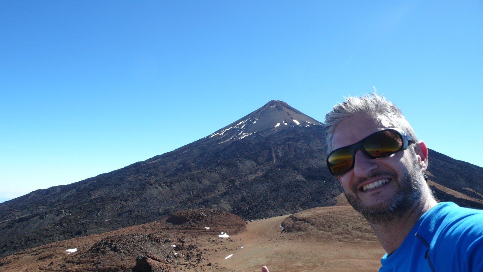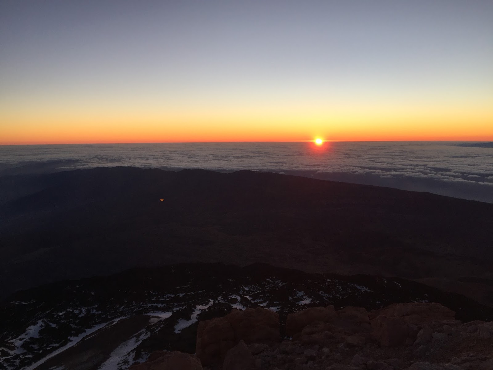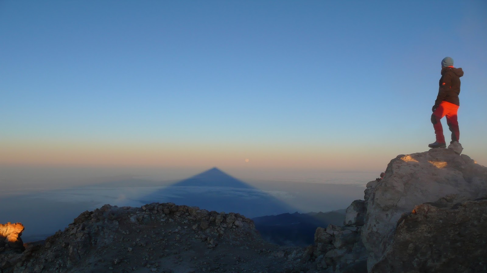 El horizonte empieza a clarear y la gente va llegando a la cima, donde estaremos algo más de una hora, haciendo fotos y disfrutando de un hito para recordar! El esfuerzo bien merece la pena y las primeras luces nos dejan claro que viviremos un momento único! Hacia el este, el sol; y hacia el oeste, la luna, que se va escondiendo tímidamente. El amanecer que pudimos disfrutar es increíble! El día completamente despejado, tan sólo algunas nubes en la costa, un sol que ofrece sus primeros rayos mientras proyecta la sombra del Pico Teide al lado de la luna llena. Hay que subir y vivirlo! Y con el sol pegando con fuerza, aprovechamos para disfrutar de las vistas que tenemos, divisando las islas de Gran Canaria, La Gomera, La Palma y Hierro. Impresionante!
