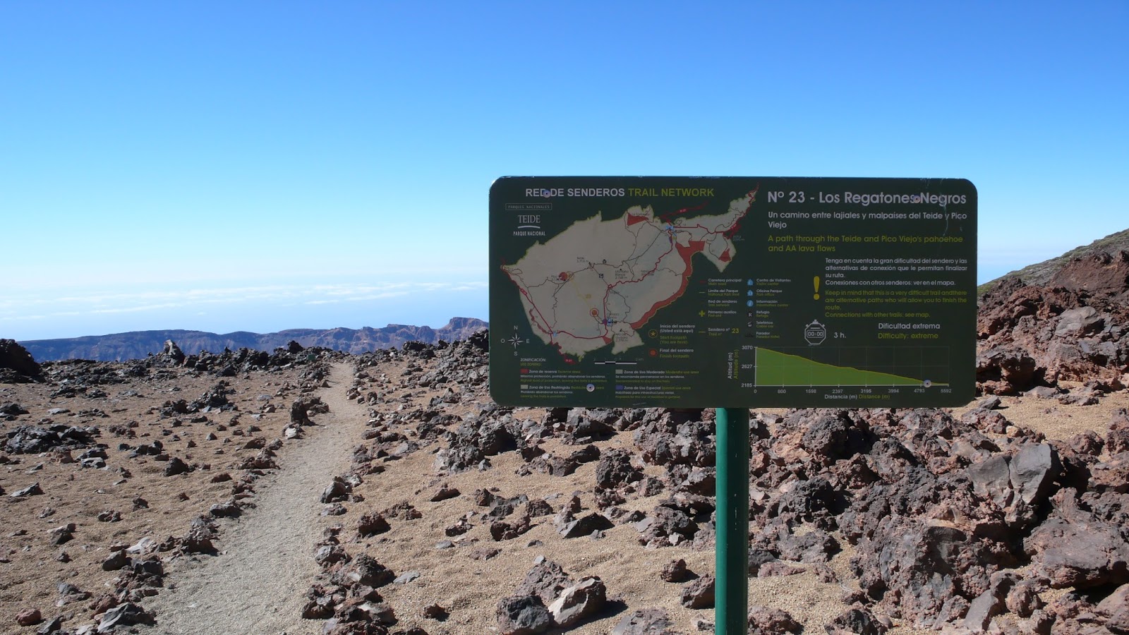Tiempo para descansar, después del incómodo descenso a lo largo del campo de lava. En este desvío encontramos un cartel con información sobre el sendero a seguir, rumbo al Parador Las Cañadas del Teide. De nuevo, mi tiempo para descansar es menor al de Sabri, pues después de pensármelo un par de veces, decido ascender a la cima del Pico Viejo y presenciar su cráter desde su punto más alto.