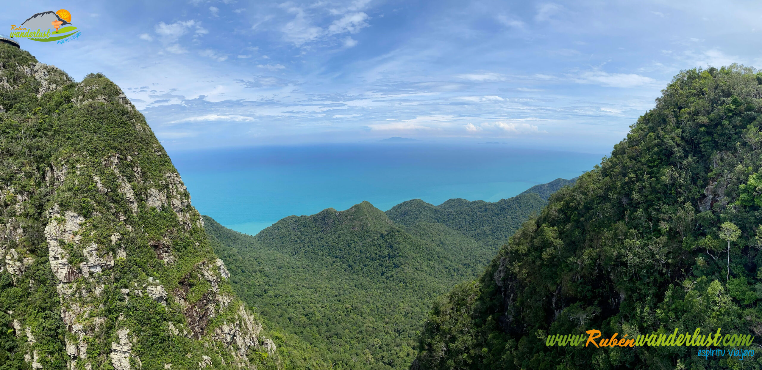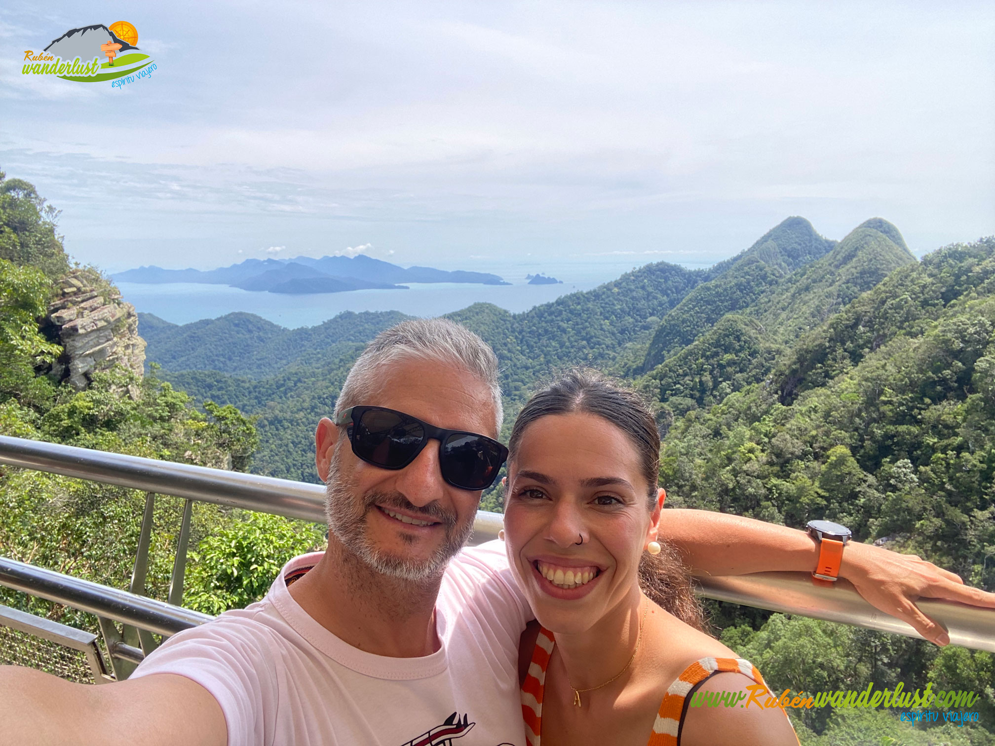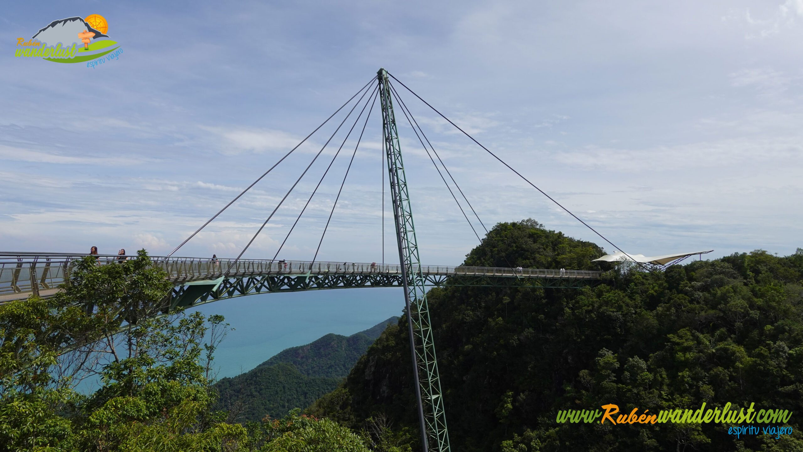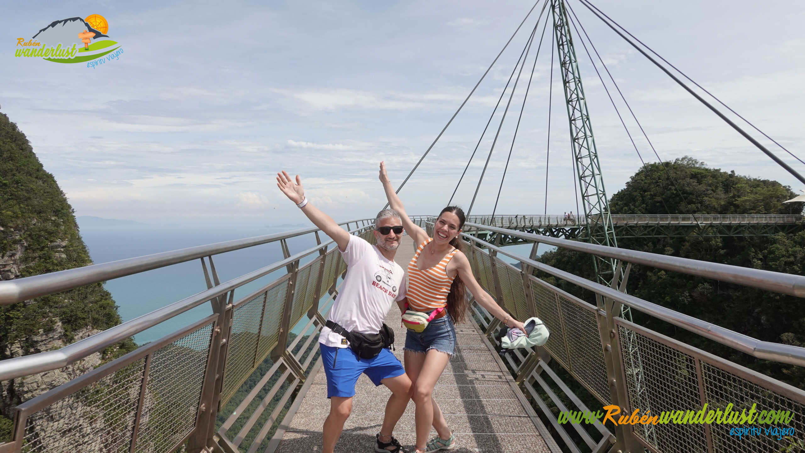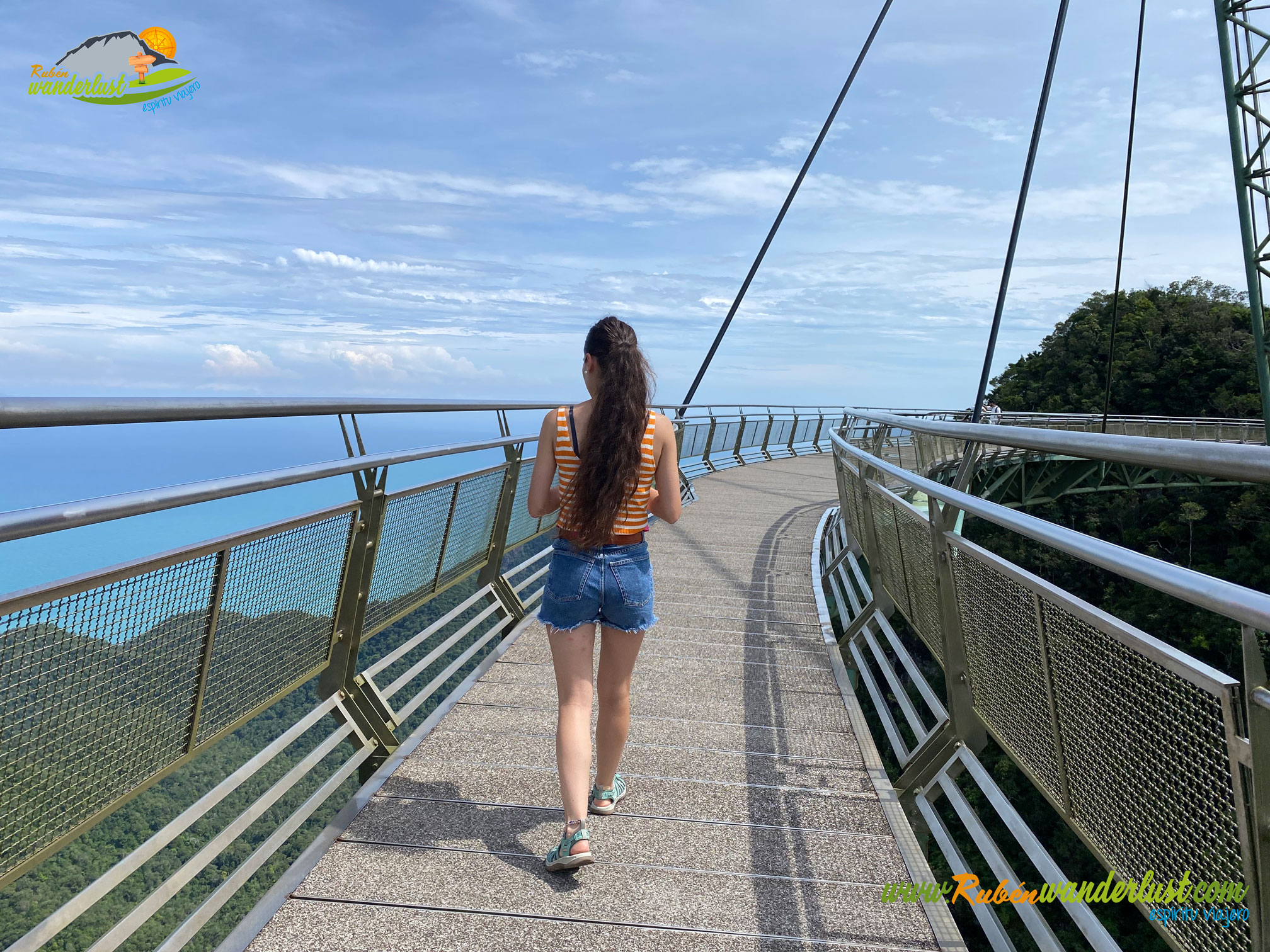 Estamos listos para disfrutar del Sky Bridge, uno de los puentes más espectaculares del mundo. Y no es para menos! Su estética curvada y sus impresionantes vistas hacen que sea una delicia caminar por aquí! Disfrutamos de su longitud, aprovechando que es pronto y aún no ha subido mucha gente! La panorámica sobre la isla de Langkawi es brutal!