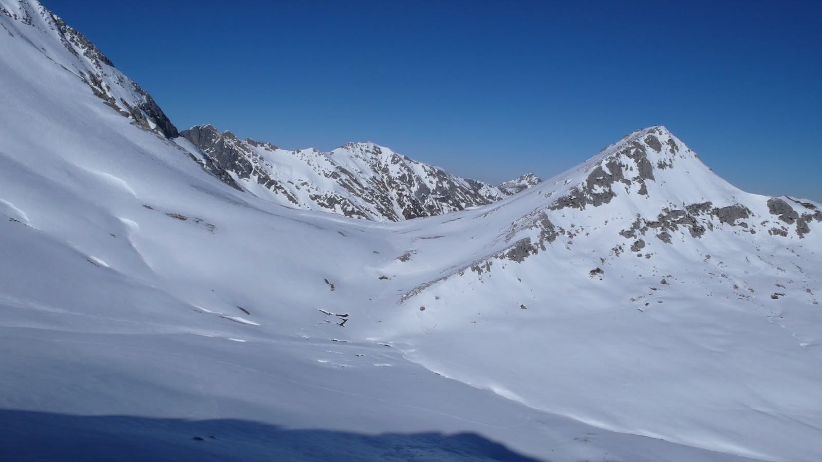 Después de descansar, comer algo y disfrutar de la preciosa cumbre que hemos conseguido, descendemos! El descenso lo haremos también por su canal central, pero la iniciaremos un poco antes, después de completar los primeros metros de arista.