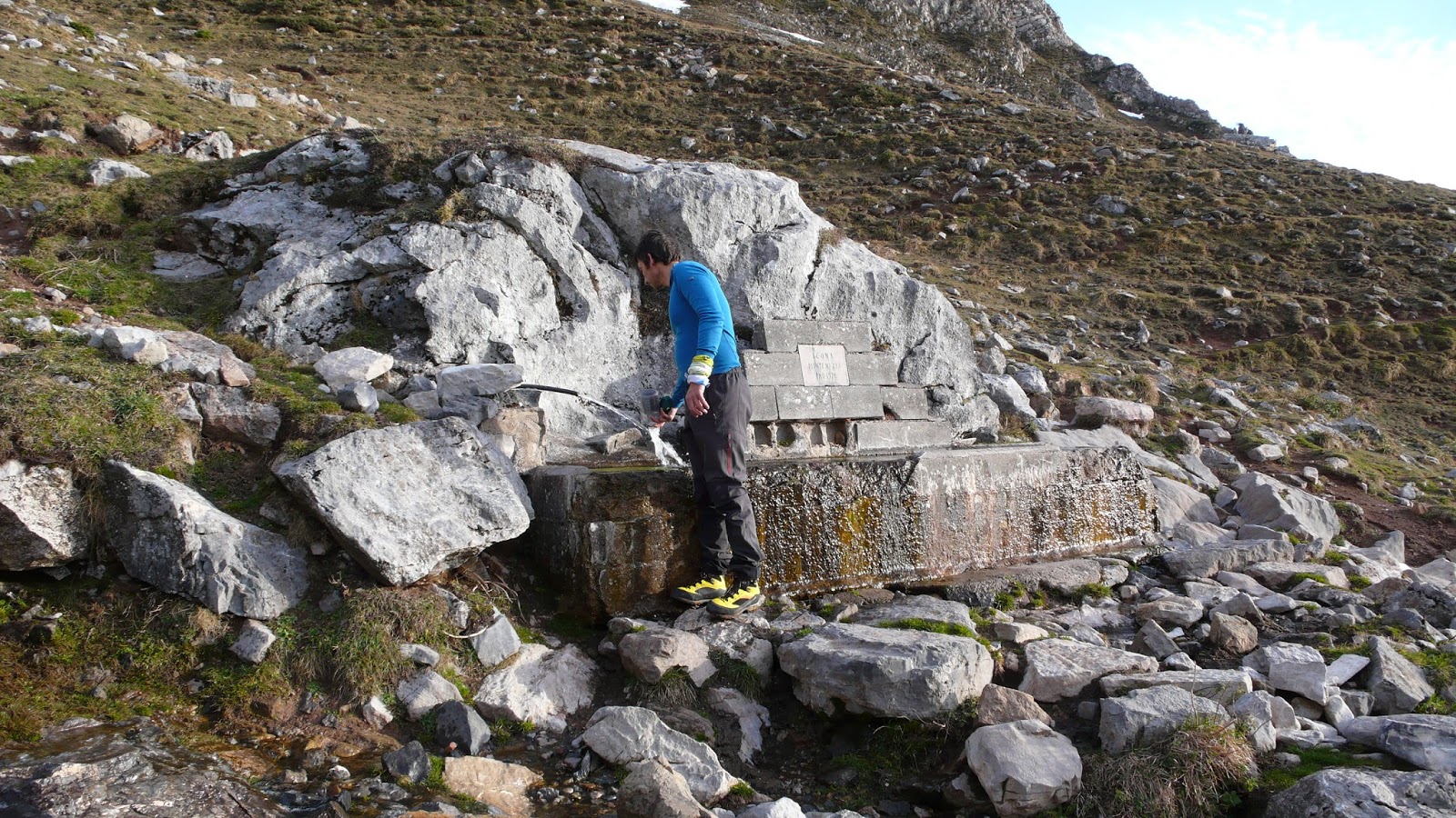 Remontando los primeros metros de canal, entre pequeños senderos, llegamos a la Fuente Bachao, donde aprovechamos para realizar la primera parada y rellenar cantimploras. Las vistas empiezan a ser sublimes, con los Picos de Europa asomando a nuestra espalda, y ya tenemos una pequeña panorámica de lo que será la arista que recorreremos.